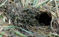 | | Description des habitudes |   | | Le campagnol, qui vit presque exclusivement sous terre, rebouche très rapidement tout orifice fait dans ses galeries. Cette particularité permet de prouver avec une bonne fiabilité, si un terrier est occupé par des campagnols. Effectivement, si l’orifice creusé sur une galerie est refermé rapidement, il est très probable que des campagnols vivent dans la galerie. À noter, qu’il est possible qu’une taupe vive aussi dans cette galerie … Contrairement à la taupe qui rejette la terre avec ses pattes, le campagnol creuse les galeries à l’aide de ses incisives ; la terre de ses taupinières est de ce fait plus fine et plus meuble. Il bourre la terre dans tout interstice trouvé sous terre. Il la refoule aussi, s’il le faut, vers l’extérieur à l’aide de ses pattes et de sa tête. Il vit en groupes familiaux et creuse un terrier sur les berges des rivières lentes. |