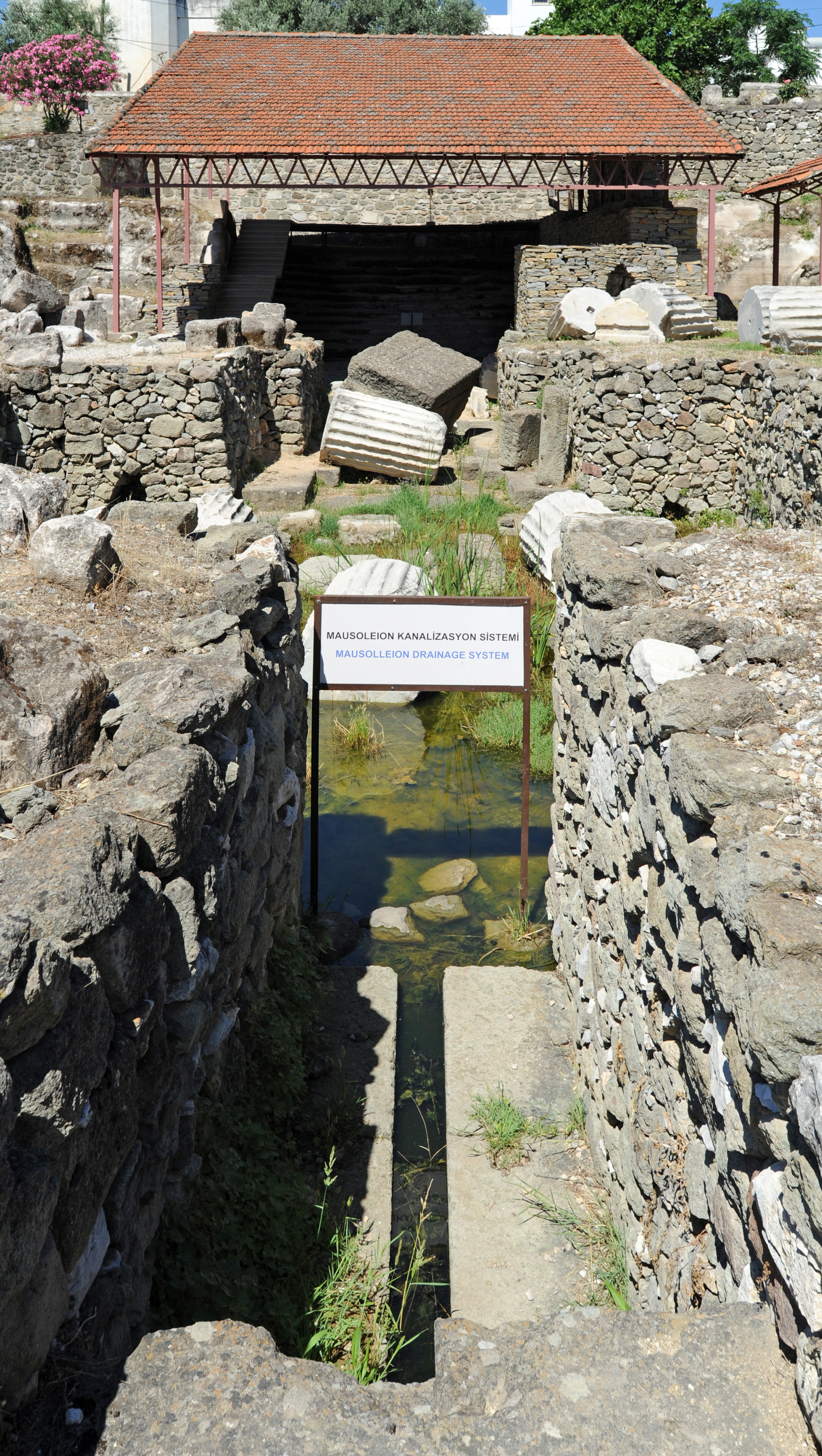 | Les ruines du mausolée du roi Mausole (Kral Mausolos Mozolesi) | Il ne reste que peu de choses aujourd’hui de ce qui fut considéré dans l’Antiquité comme la cinquième des Sept Merveilles du Monde, notamment par Antipatros de Sidon (IIe siècle avant JC) et Pline l’Ancien (Ier siècle après JC).En 355 avant JC, le satrape de Carie, Mausole (Μαύσωλος), conçut les plans d’un monument extravagant pour en faire son tombeau pour assurer sa gloire posthume. Mausole aurait lui-même fait commencer la construction de son tombeau sur une colline dominant sa capitale Halicarnasse ; après le décès de Mausole, deux années plus tard, en 353, sa veuve – qui était aussi sa sœur – la reine Artémise II continua la construction. La reine Artémise elle-même mourut deux années plus tard, en 351 ; le tombeau de Mausole fut achevé en 350, probablement par les frères ou la sœur de Mausole et d’Artémise. |