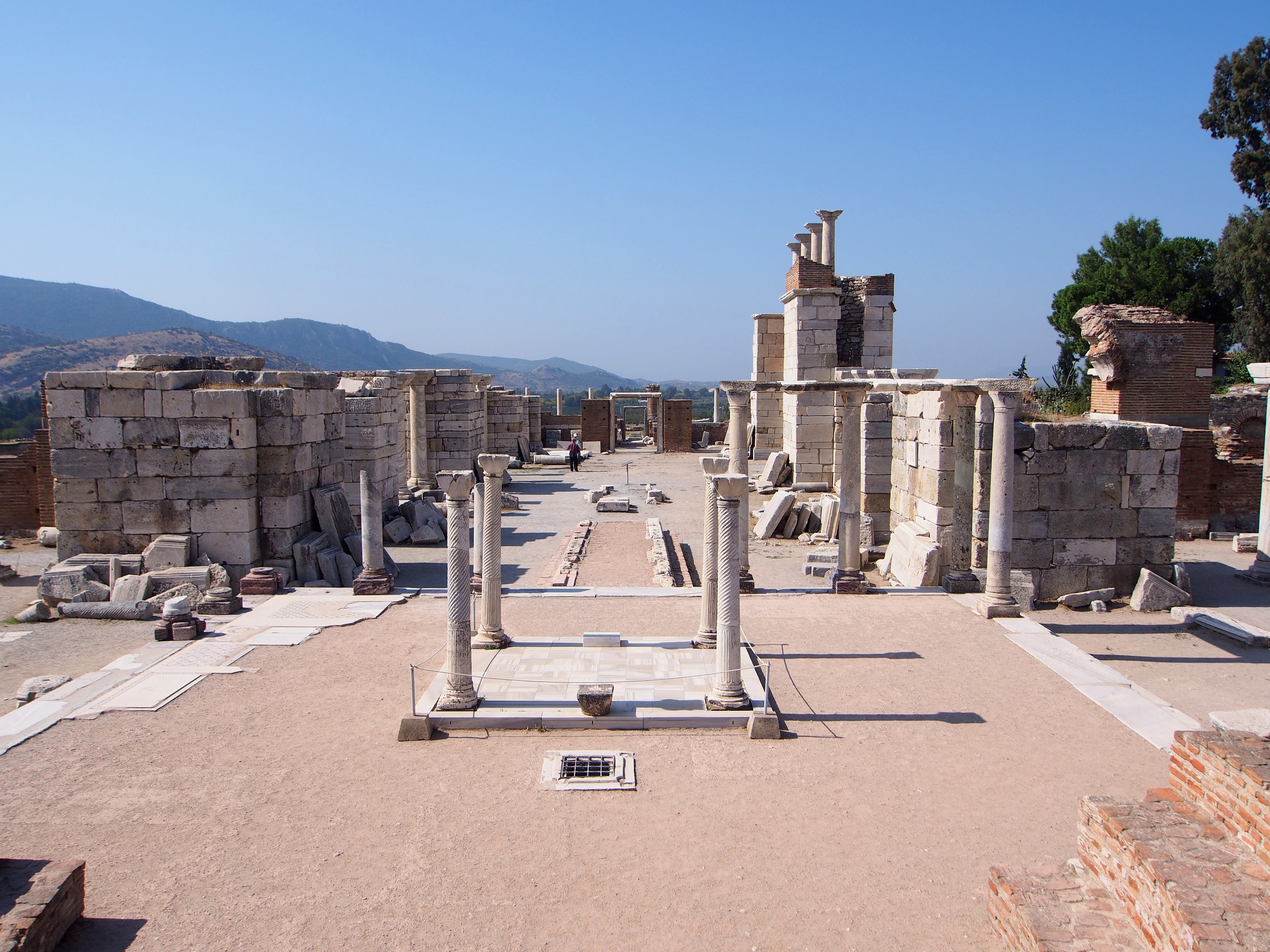 | | | La basilique Saint-Jean d’Éphèse | L’église basilique Saint-Jean est située à l’intérieur de l’enceinte fortifiée qui protégeait la colline d’Hagios Theologos (Ayasoluk) ; cette muraille de défense – de 1 800 m de longueur – avait été érigée au VIIe siècle et au VIIIe siècle pour protéger la ville et la basilique contre les raids arabes. L’entrée principale dans la citadelle byzantine se trouvait au sud ; elle conduisait directement à la basilique, située sur un promontoire au pied de la colline. Deux autres portes se trouvaient à l’est et à l’ouest.Cette porte du sud a été surnommée « Porte de la Persécution » parce qu’elle présentait, sur son linteau, une pierre sculptée d’un bas-relief montrant une scène qui a été mal interprétée comme étant le martyre d’un chrétien tué par un gladiateur, alors qu’il s’agirait en réalité d’un bas-relief représentant la rencontre d’Ulysse avec le héros Achille ; ce bas-relief est maintenant conservé au musée de Woburn, en Angleterre. Cette pierre et beaucoup d’autres, remployées dans la construction de la muraille, provenaient probablement des ruines de l’Artémision. La porte dite de la Persécution était protégée, de part et d’autre, par une tour de défense de plan carré. La tombe d’un des premiers chrétiens, prénommé Jean, avait été édifiée à la fin du Ier siècle sur les pentes de cette colline située au nord-est d’Éphèse, au-delà du mont Pion, et dominant le temple païen d’Artémis. La tradition chrétienne veut s’il s’agisse de la tombe de l’apôtre Jean, disciple de Jésus ; l’apôtre Jean aurait été chassé de Samarie par les Romains et se serait réfugié à Éphèse à la fin des années 30 et y aurait prêché ; il aurait été chassé d’Éphèse par les païens vers la fin des années 40 ; entre les années 50 et les années 90, il y aurait un trou béant dans la biographie de l’apôtre ; en l’an 94 on l’aurait retrouvé à Patmos où il aurait écrit l’« Apocalypse de Jean » ; vers 97, après la mort de l’empereur Domitien, Jean aurait été autorisé à revenir à Éphèse et y aurait écrit l’« Évangile de Jean ». Il serait mort à Éphèse vers l’an 100 et aurait été enterré à proximité. Cependant des historiens pensent que l’auteur de l’Apocalypse et de l’Évangile de Jean serait Jean le Presbytre, né vers l’an 50 et mort vers l’an 100. « L’histoire est une légende qui n’est plus contestée » a dit un certain Napoléon Bonaparte … La tombe de Jean était à l’origine une chambre funéraire surmontée d’un mausolée. La population d’Éphèse avait peu à peu abandonné la cité antique et s’était regroupée autour de la tombe de saint Jean l’Évangéliste et la localité avait pris le nom d’Hagios Theologos, en l’honneur de Jean le Théologien. Plus tard – probablement au IIIe siècle sous le règne de l’empereur Constantin Ier – une église assez simple aurait été construite au-dessus de la tombe mais aurait été détruite par un tremblement de terre au IVe siècle. Une église plus grande, avec une toiture en bois, fut construite au début du Ve siècle ; cette église est citée dans les actes du concile de l’an 431. Au VIe siècle, l’empereur Justinien Ier (règne de 527 à 565) et son épouse Théodora firent construire une prestigieuse basilique au-dessus de la prétendue tombe de l’évangéliste ; cette basilique devait rivaliser avec la basilique Sainte-Sophie que le couple impérial faisait édifier à Constantinople. La construction de la basilique fut achevée en 565. Le site devint un important lieu de pèlerinage pendant toute l’époque byzantine. La basilique Saint-Jean était un édifice de grandes dimensions, de 145 m de longueur par 40 m de largeur, bâti sur un plan en forme de croix latine, orienté dans la direction est-ouest, avec le narthex situé à l’ouest et l’abside à l’est ; son architecture était inspirée de celle de l’église des Saints-Apôtres à Constantinople. À l’extrémité ouest se trouvait un atrium, entouré sur trois côtés par un portique à double colonnade ; cet atrium conduisait à un exonarthex, puis à un narthex qui donnait accès, par trois portes, à la nef centrale et à ses bas-côtés.
