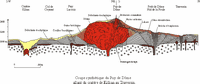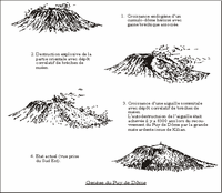 Cette disposition a été de longue date interprétée comme résultant de l’édification d’un dôme accompagné d’une gaine pyroclastique. Celle-ci est suivie par une concentration de l’activité dans le secteur oriental avec mise en place de nuées ardentes et par l’ascension d’une aiguille dont les vestiges affleurent actuellement sous l’observatoire et le relais de télévision.