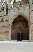 1. Death of St. Anthony Abat 2. Exorcising a child 3. Made peace between the bishop of Metz and the duke of Lorraine 4. Preaching the Second Crusade 5. Saint Bernard 6. Before the Council of Sens 7. Conversion of St. William 8. Appearance of the Mother of God 9. Saint Etienne sends Claravall base (30 statues of saints Cistercian) A. Saint Basil B. Saint John Chrysostom C. St. Cyril of Alexandria D. Saint Gregory the Great E. Saint Augustine F. St. Ambrose G. The Apostle Paul (stained Gaudí 1903) H. Saint Valeria martyr (stained Gaudí 1903) | | Portal of the Belvedere (Porta del Mirador) | Portal Belvedere (Porta del Mirador) is located in the middle of the facade of the cathedral facing the south, the portal is sheltered under a porch facing the seaPortal Belvedere was made in Gothic style by different sculptors between 1380 and 1422, artists from Northern Europe and Majorcan contributed to this gothic masterpiece, with the Majorcan architect and sculptor Guillem Sagrera as main local artist. The portal has a thin design with floral motifs, geometric and fantastic animals. Both gate wings are separated by a mullion with a beautiful statue of the Virgin and Child, the work carried out in 1389 by Pere Morey, the owner of the cathedral. The original sculpture, the work of Guillem Sagrera, is preserved at the Museum of the Cathedral in 1917, he was replaced on the portal by a copy made by Guillem Galmés.