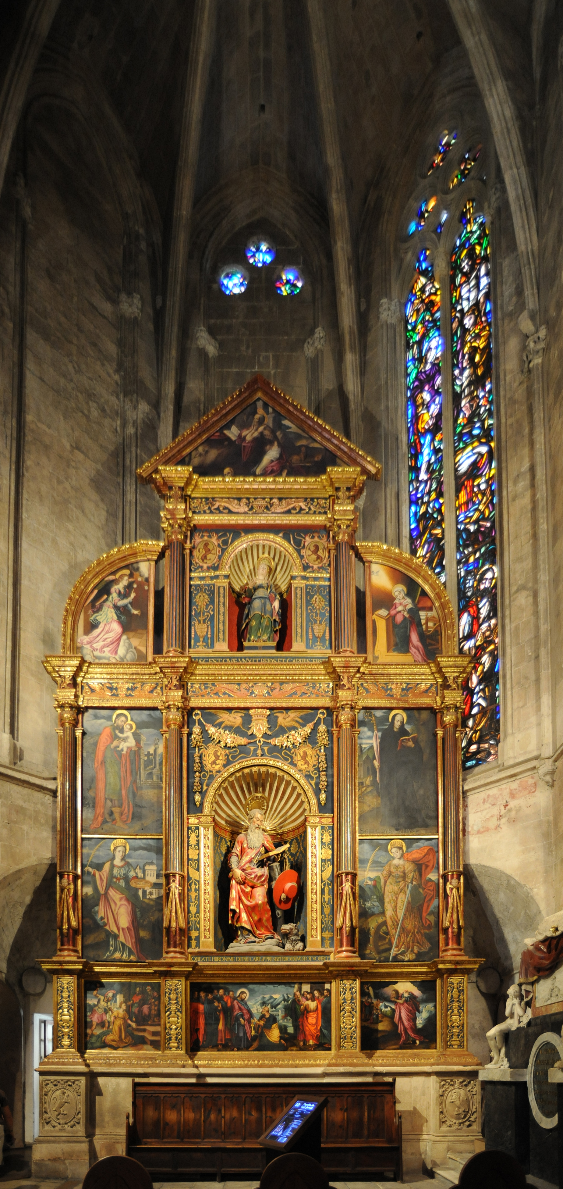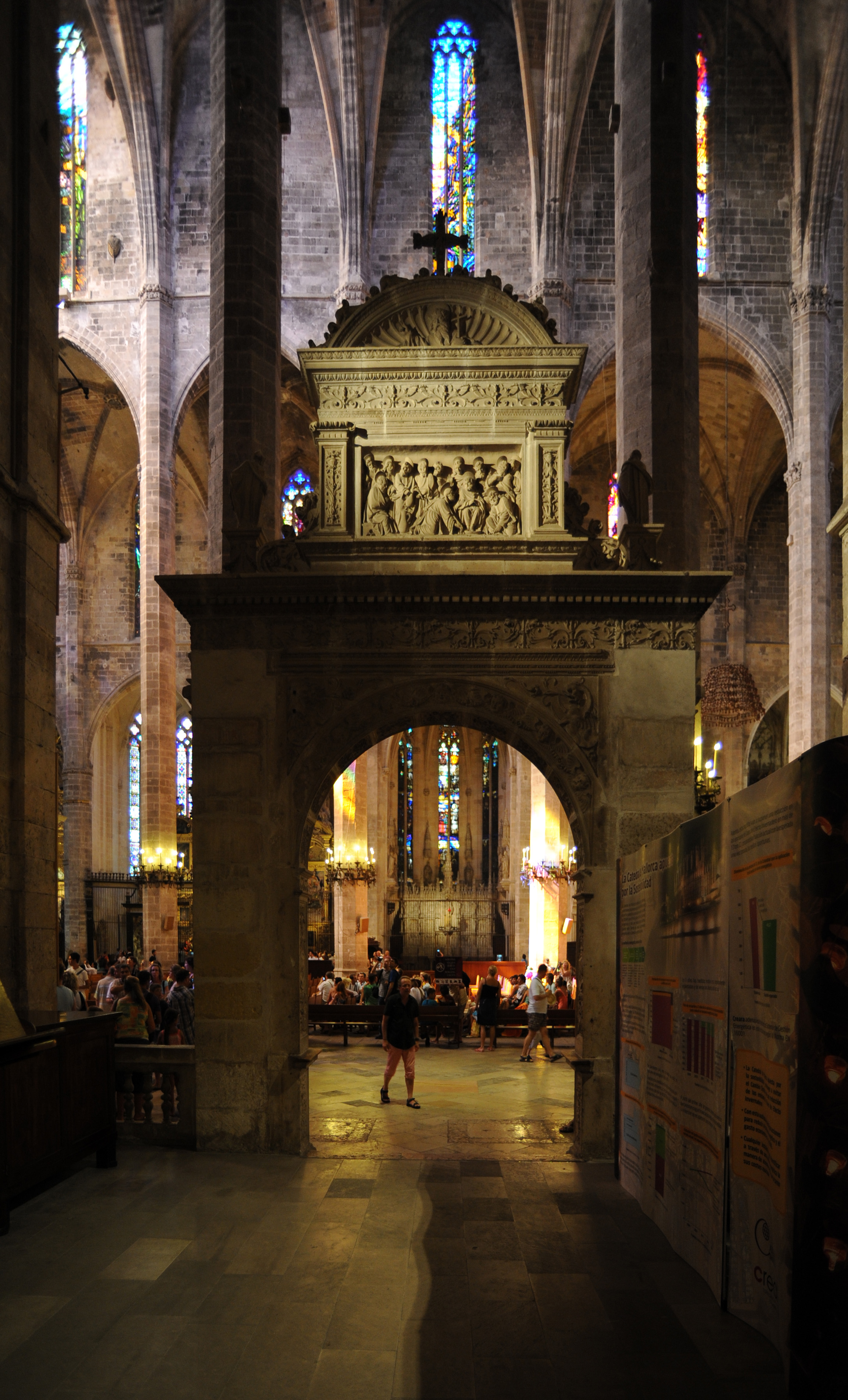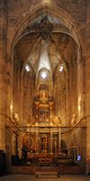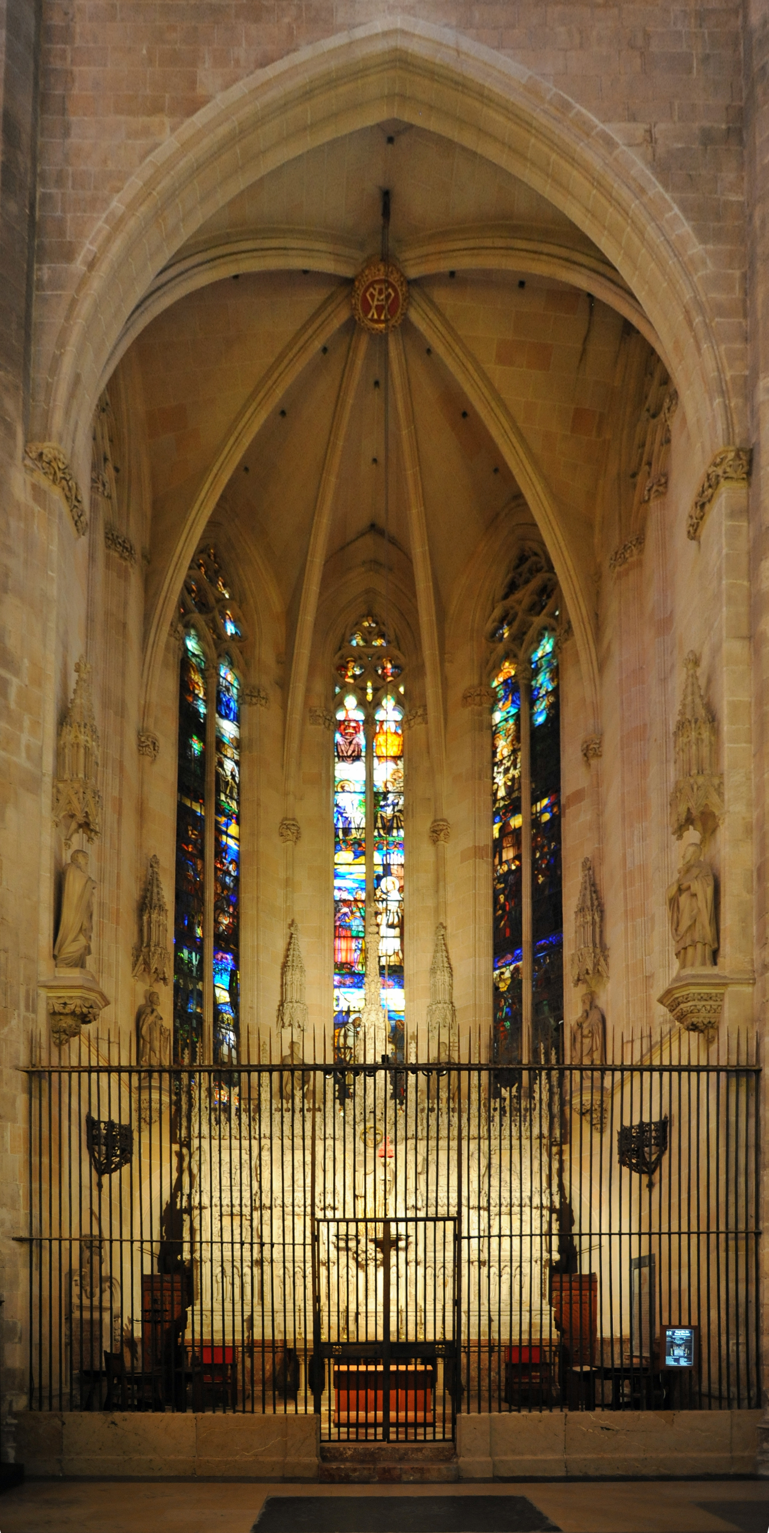 1. St. Mary of the Seu 2. St. James de Compostela 3. St. John the Baptist 4. Saint John the Evangelist 5. Canopy with Jesus crucified, St. Mary and St. John 6. Altar 7. St. Eulalia 8. St. Mary Magdalene 9. St. Barbara | _small.jpg) _small.jpg) _small.jpg) | _small.jpg) _small.jpg) _small.jpg) | | From both sides are stalls Renaissance style and are the work of sculptor Philip and Antoine Dubois Fillau made from 1514 to 1519. | _small.jpg) _small.jpg) _small.jpg) | _small.jpg) The chapel contains in its center a huge wrought iron canopy, designed by the architect Antoni Gaudi (1912).Ceramics and paintings of the choir were conducted by J.-M. Jujol from 1909 to 1914. | | The altar was consecrated in 1346. | _small.jpg) _small.jpg) | Chapel St. Eulalia (Capella de Santa Eulalia) | | The St. Eulalia contains the tomb of Gothic Berenguer Batle. | Chapel St. Gabriel (Capella de Sant Gabriel) | | The Southern Front | The south facade dominates the seafront its elegant silhouette punctuated by vertical lines buttresses topped with pinnacles. | _small.jpg) _small.jpg) _small.jpg) | | Nave South Side (Nau Lateral Sud) | _small.jpg) | The Chapel of the Holy Sacrament (Capella del Santíssim Sacramento) | The Chapel of the Blessed Sacrament chapel is named St. Peter (Capella de Sant Pere).This chapel was completely rebuilt by the Majorcan artist, born in Felanitx, Miquel Barceló, Custom Bishop Teodoro Ubeda i Gramage and canon liturgist Pere Llabrés i Martorell. Barceló’s work, inspired by the parable of the loaves and fishes, is the Eucharist: the walls of the chapel are covered with clay, in which the artist has painted and sculpted the seabed in earth tones, gray and bluish. Barceló is also the author of five windows of 4 meters high - which are painted in grisaille to recreate the underwater light - as well as the liturgical furniture: altar, ambo and chair. Lining the walls of the lower part of the chapel is painted ceramics produced by the workshop of ceramist Vincenzo Santoriello, Vietri sul Mare, near Naples.