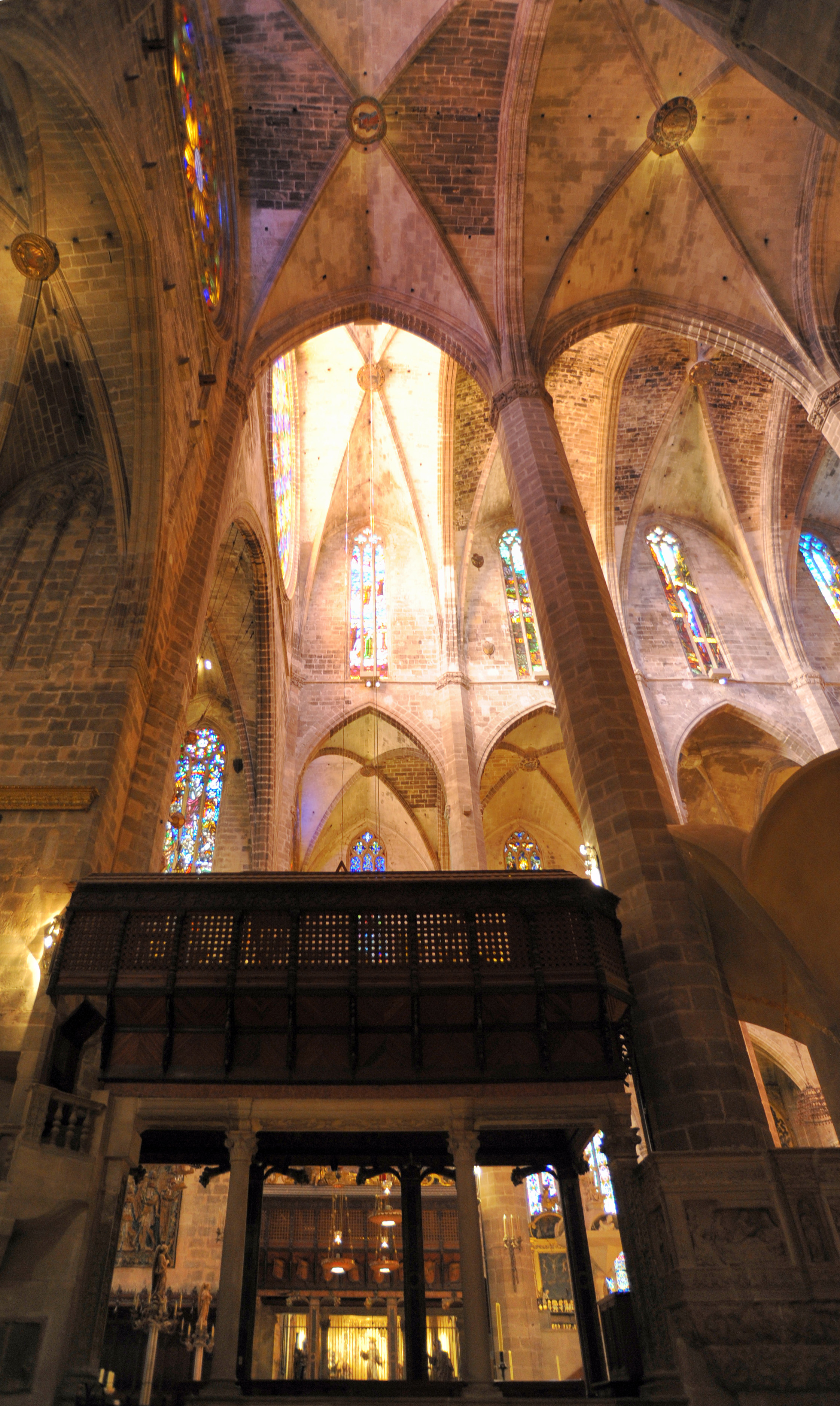 In 1851, an earthquake damaged the upper half of the main facade, restoration was entrusted to the architect Jean-Baptiste Peyronet, with controversial results. Between 1904 and 1914, the architect Antoni Gaudi effected major changes to the interior of the cathedral, at the request of the bishop Pere Joan Campins. The bishop wanted the cathedra, liturgical seat of the bishop, actually dominates the interior, the altar together all the priests in the sanctuary and the three naves are available to the faithful. These changes bore especially on the Chapel Royal : Gaudi suppressed both altarpieces obscuring the seat and, with the help of Josep Jujol, adorned it with two side motifs in ceramics. He placed the altar in the center of the apse and moved around all the choir stalls, which until then had occupied the center of the nave, now open and accessible to all. He pierced openings long walled and added stained glass, improving lighting. But what we see today is the strange canopy he placed above the altar. |