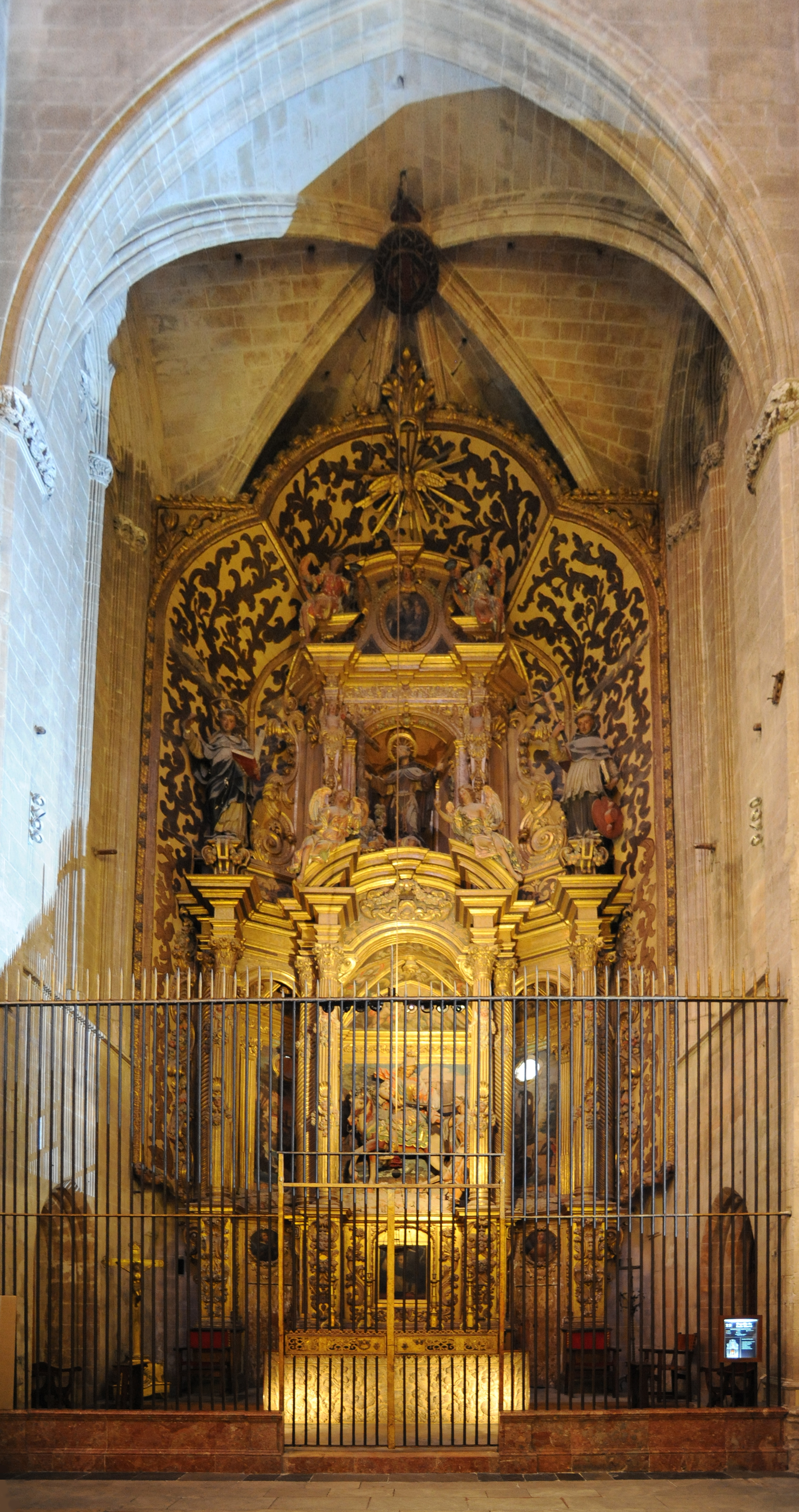 | | Hallway of the Sacristy of Vermells (Atri de la Sacristia de Vermells) | The vestibule of the sacristy of Vermillion was formerly the chapel of St. Catherine (Capella de Santa Catalina). | | Alms Portal (Portal de l’Almoina) | Portal Alms is located on the north-facing façade (a Tramuntana) of the cathedral, next to the bell tower.The construction of this portal was started in 1498 by Francesc Sagrera, son of Guillem Sagrera. Portal Alms is Gothic, but it is more sober in decoration than the other two portals. Essential in a perfect rectangle, it is bordered on either side by thin pillars. The decoration is mainly floral and is accented by the eardrum in which there is a small statue of the Immaculate Virgin, dating from the late sixteenth century. This is the usual portal of the cathedral access. | Chapel St. Joseph (Capella de Sant Josep) | _small.jpg) Note grids Gothic St. Joseph’s Chapel.The altar of St. Joseph is a work of Guillem Galmés and Pere Llorenç, Palma made between 1885 and 1888. Images of the altarpiece: 1. St. James Major 2. Saint Joseph 3. St. Teresa of Jesus 4. Death of St. Joseph | Chapel St. Sebastian (Capella de Sant Sebastià) | The altarpiece of San Sebastian is a work of sculptors Francesc Herrera, Joan and Joan Mateu Muntaner, Palma made between 1712 and 1754. Images of the altarpiece: