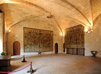 The Hall of Kings was the second of three rooms constituting the Royal Audience Hall. Its name comes from the presence of nine portraits of the kings of Majorca painted in the twentieth century by José Sancho of Jordana. |