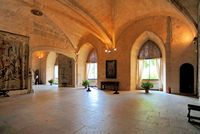 _small.jpg) The Tinell or Great Hall, is a body of independent building to the left of the Parade-ground. This building, in Gothic style, was built in the early fourteenth century, next to the façade of the Palace of the Lord King. The Great Hall was identical to the throne room of the Palace of the Kings of Majorca in Perpignan.In 1578, the roof of the Great Hall collapsed, when reconstructed, King Philip II decided to divide the Great Hall into two floors: the ground floor, the Royal Audience Hall, and at the Upstairs, the Throne Room. The architect who made the renovation of the Salò Major was Pere Castany, owner of the King. |
