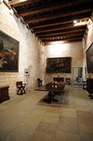 | In this room the kings of Mallorca took their private dining and confer with their advisors. The dishes were brought from the kitchen by a spiral staircase leading directly into the room. The piece was restored in 1973, as the stucco decoration was removed and we discovered that the modern ceiling covering a Mudejar coffered ceiling which was restored in 1979. In this room you can also see the remains of wall paintings of the Christian era showing characters horse warrior posture. |