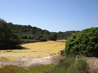 | | Le belvédère de Ses Fonts de n’Alis | Depuis le Mirador de Ses Fonts de n’Alis, ou de Sa Font de n’Alis, on peut voir la confluence des ruisseaux d’En Carraixet et de S’Hort d’En Colovet. Les bords des ruisseaux étaient les seuls espaces de Mondragó où le sol et la disponibilité de l’eau, associés à l’irrigation, permettaient la culture maraîchère. Dans le voisinage de ces ruisseaux et de ces étangs se trouvent des constructions d’origine arabe, conçues pour l’extraction, le stockage et le transport de l’eau : norias, citernes et fossés. Le nom de la source d’Alis est également d’origine arabe. |