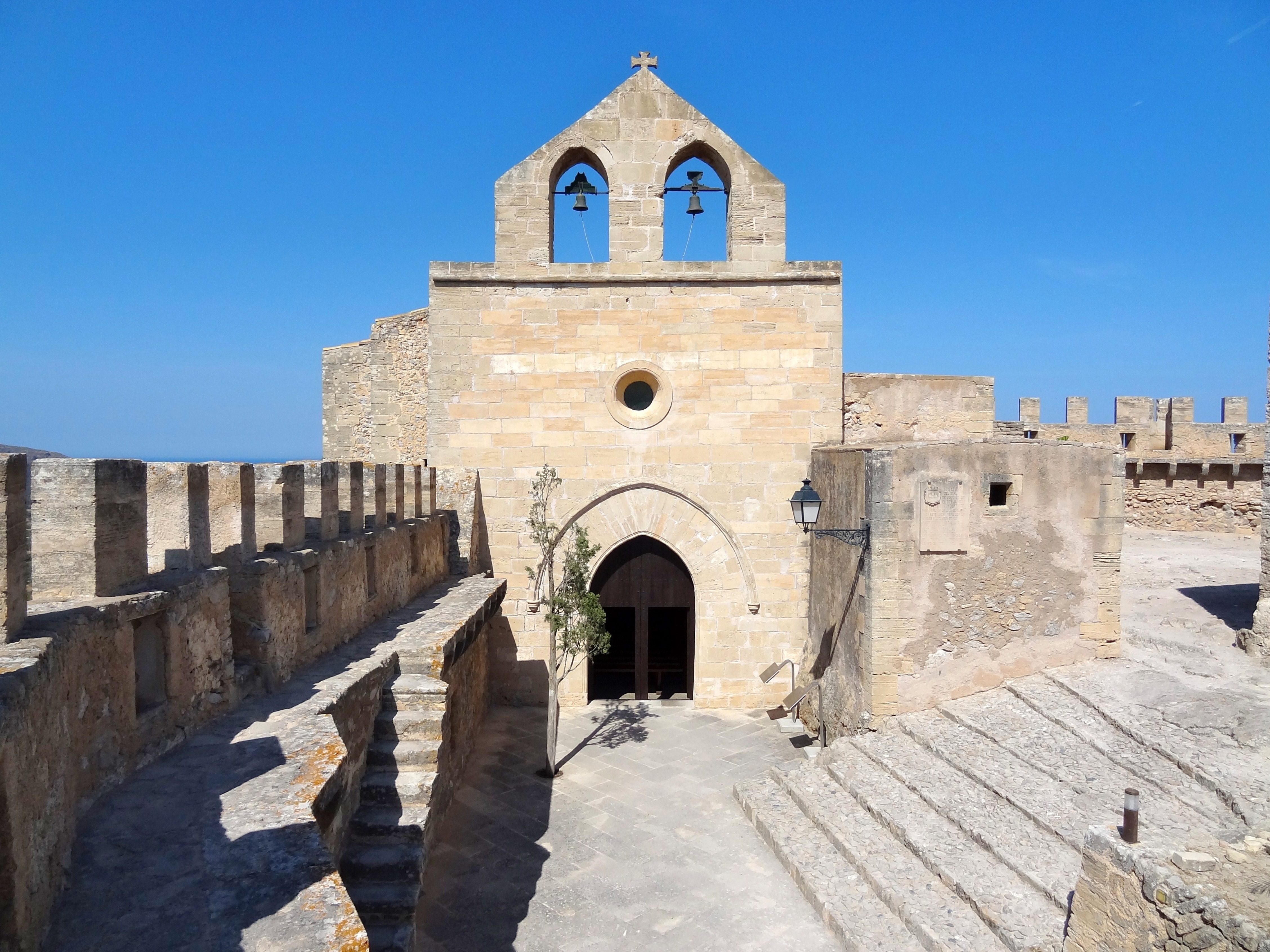 | La chapelle Notre-Dame de l’Espérance (Nostra Senyora de l’Esperança / Nuestra Señora de la Esperanza) | _small.jpg) La chapelle Notre-Dame de l’Espérance se trouve au lieu le plus élevé de la forteresse de Capdepera, dans l’angle nord-est (points 2 et 4 du plan). La chapelle de Nostra Senyora de l’Esperança est une église fortifiée, sans fenêtres, dont les murs nord et nord-ouest font partie des murs extérieurs de la fortification ; depuis le toit en terrasse de l’église, qui avait un usage défensif et qui sert aujourd’hui de terrasse panoramique, on peut voir la ligne côtière avec les Cales de Capdepera, les tours de guet et le canal de Minorque ; au sud-est de la chapelle, se trouve une plate-forme bordée par les remparts.