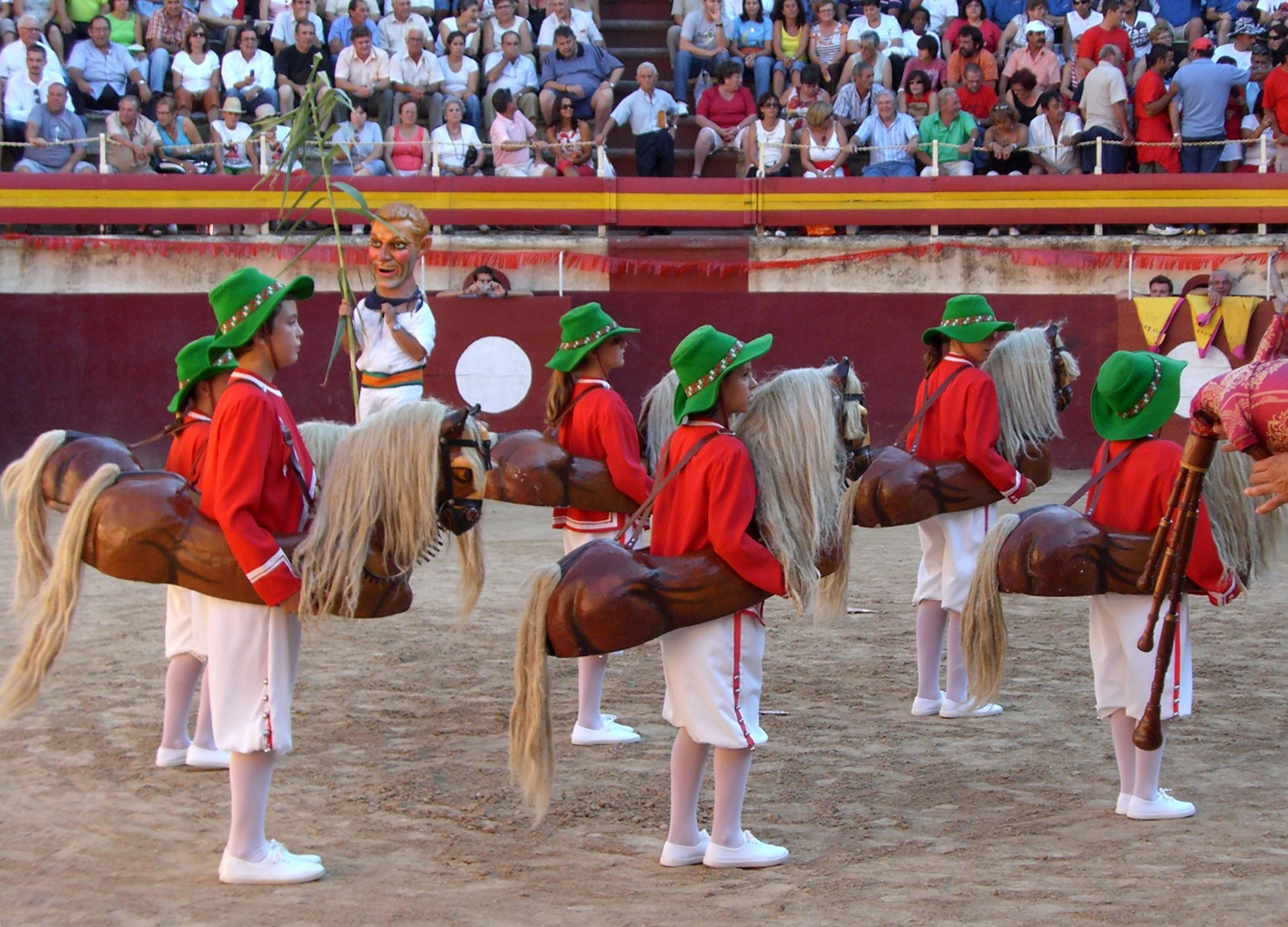 | Les danseurs Els Cavallets | La grande attraction culturelle de Felanitx est un groupe de danse traditionnelle, nommé Els Cavallets (les Petits Chevaux), composé de six danseurs et d’une « Dame » (Dama). Le groupe est composé d’enfants de 10 à 13 ans ; les danseurs sont déguisés en cavaliers portant à la taille un cheval de carton-pâte ; ils sont vêtus d’une tunique militaire rouge et d’un pantalon blanc orné de grelots, et coiffés d’un chapeau vert. La « Dame » porte une robe verte et une coiffure rouge ; elle agite de la main un mouchoir blanc qui donne la mesure de la danse. Le groupe est accompagné d’une musique de cornemuse.Cette tradition aurait été fondée en même temps que le couvent des Augustiniens, en 1603. Le groupe donne ses spectacles le jour de la fête de Saint-Augustin et de la fête de Sainte-Marguerite. |