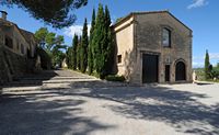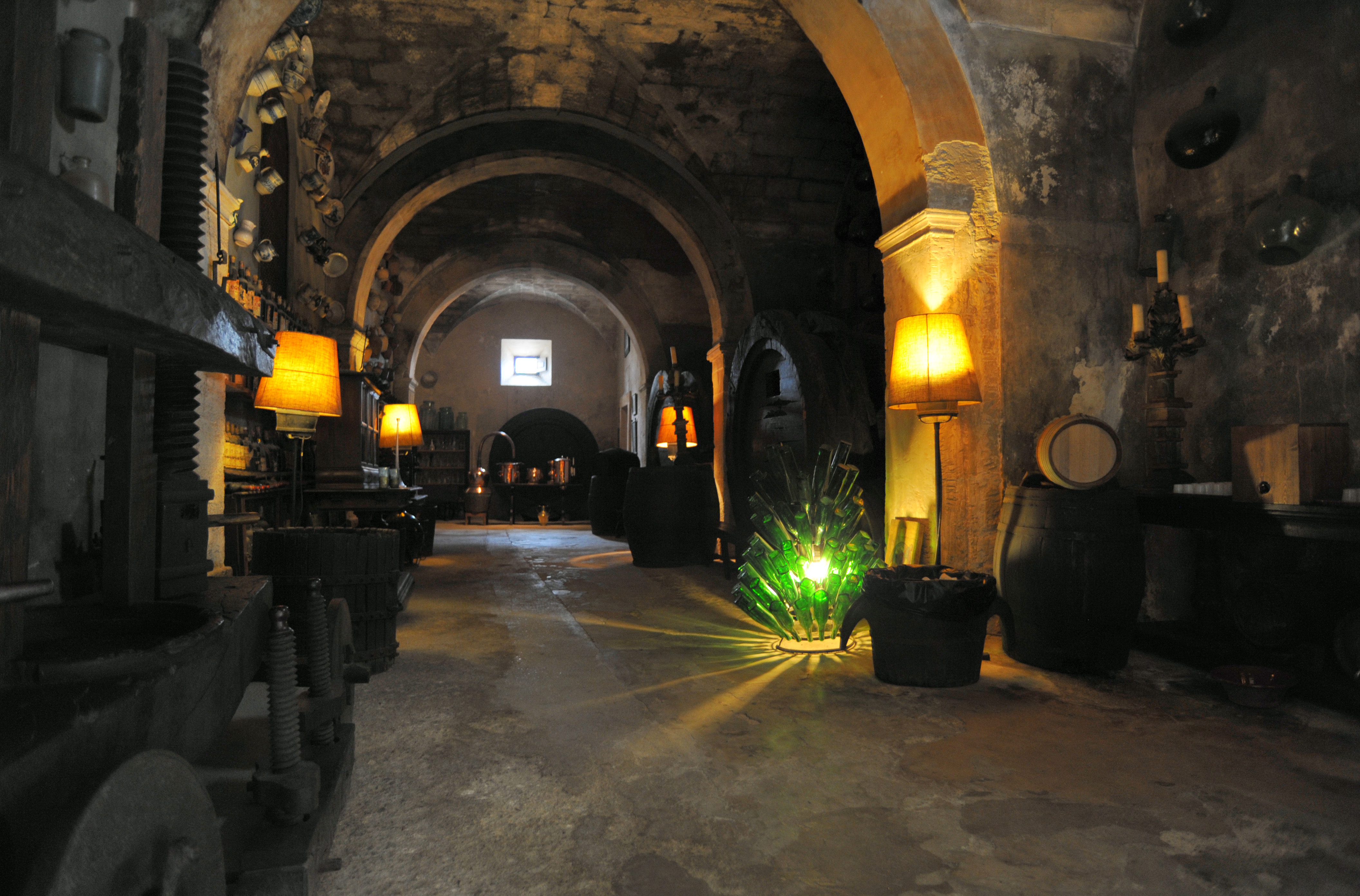 | Le cellier | _small.jpg) A droite de la chapelle se trouve le cellier. Aujourd’hui, le cellier est en forme de « L » avec un total de cinq sections voûtées, mais, avant d’abriter la chapelle, la cave était rectangulaire avec huit sections, divisés en deux unités de quatre sections chacune. Il reste quatre nefs sur la droite et une dernière nef à gauche, derrière la chapelle. Dans la paroi de gauche du cellier se trouve une ouverture en treillis de bois qui communique avec la chapelle. | _small.jpg) _small.jpg) _small.jpg) | | Le cellier servait à garder le vin pour qu’il acquière, au fil des ans, la meilleure qualité pour la commercialisation. Dans le cellier sont exposées plusieurs pièces liées au monde de la vinification, comme un pressoir à deux bras sur la gauche, des barriques, des bouteilles de vieux vin et un alambic en cuivre. | _small.jpg) _small.jpg) _small.jpg) | | On note également un curieux document de 1917 intitulé « Els deu manaments del vinicultor » (« Les dix commandements du vigneron »). La vigne constituait autrefois la source la plus importante de revenu du domaine d’Els Calderers, mais l’attaque du vignoble par le phylloxera au début du XXe siècle causa la destruction de la vigne. La plupart des vignes furent arrachées et remplacées par des champs de blé, de sorte que la production des céréales devint la principale source de revenu. Aujourd’hui, les vignerons tentent un nouveau départ, et le vin de la maison peut être dégusté par les visiteurs. | _small.jpg) _small.jpg) _small.jpg) |