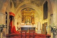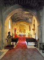 | | | | La chapelle | | La chapelle est de forme rectangulaire avec un plafond à trois voûtes. Sur la gauche de la première travée on remarque une crèche baroque, qui est utilisée chaque année pour Noël ; cette crèche a été assemblée dans l’église Saint-Nicolas (Església de Sant Nicolau) de Palma ; sur la droite de cette première travée, se trouve une peinture dédiée à saint Joseph (Sant Josep). La deuxième travée sur la droite conserve une petite tombe avec l’image du Sacré-Cœur, tandis que sur la gauche se trouve une autre image dédiée à l’Immaculée Conception. | _small.jpg) _small.jpg) _small.jpg) _small.jpg) | La troisième travée est occupée par le chœur, dominé par un retable baroque, avec deux anges de chaque côté et une image de la Vierge au centre. Sur le mur de la tête du presbytère, sur la droite, se trouve une lettre concernant la Senyora Margalida de Verí i Fortuna, décédée en janvier 1958 ; et à gauche, une autre lettre, de 1959, concernant l’autorisation du pape Jean XXIII pour bénir l’oratoire. Contre le mur de gauche se trouve un siège recouvert de tissu destiné à l’évêque. Les mois pendant lesquels les propriétaires vivaient au domaine, on célébrait la messe tous les jours dans cette chapelle, et y récitant le chapelet au coucher du soleil.