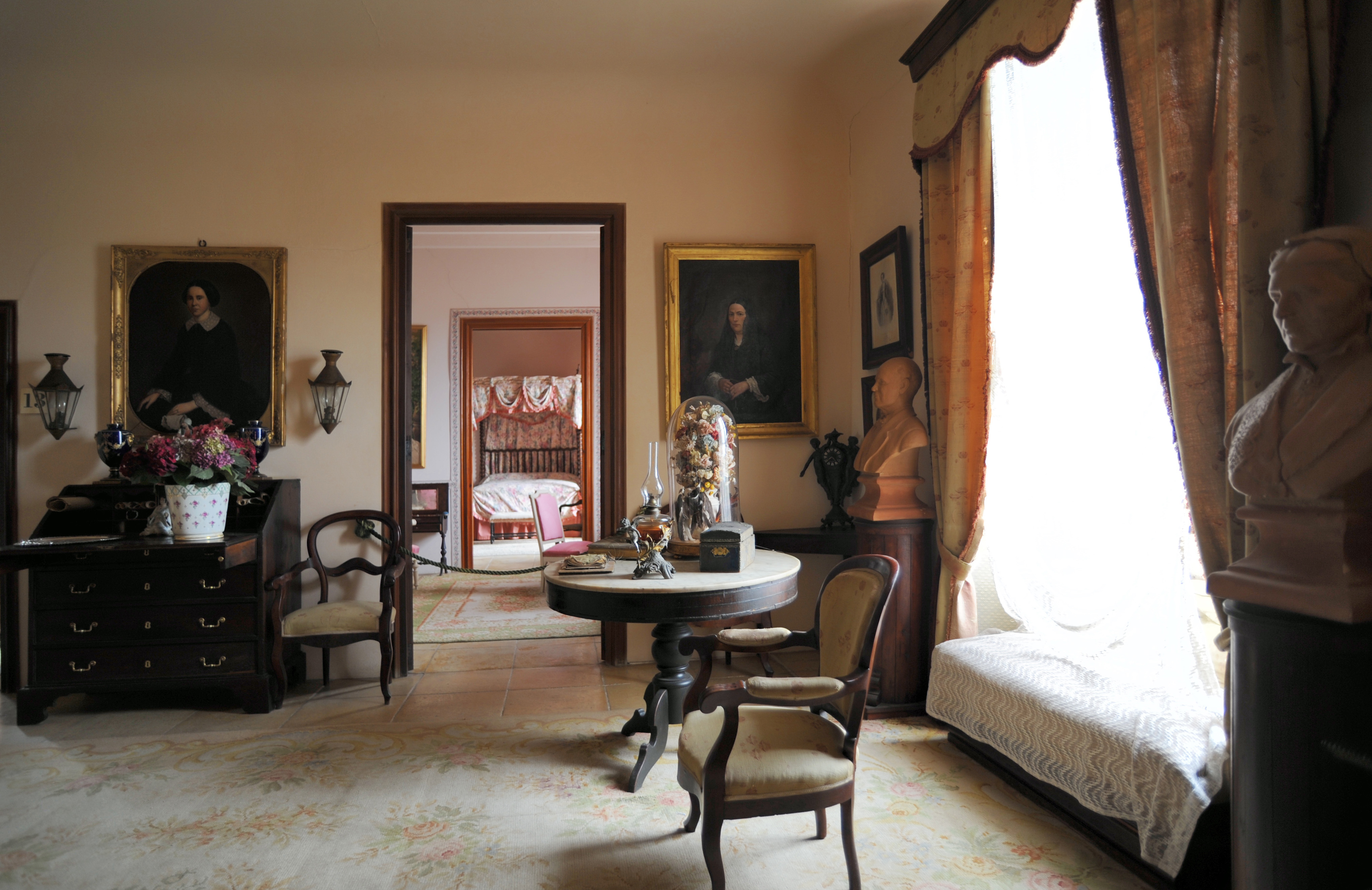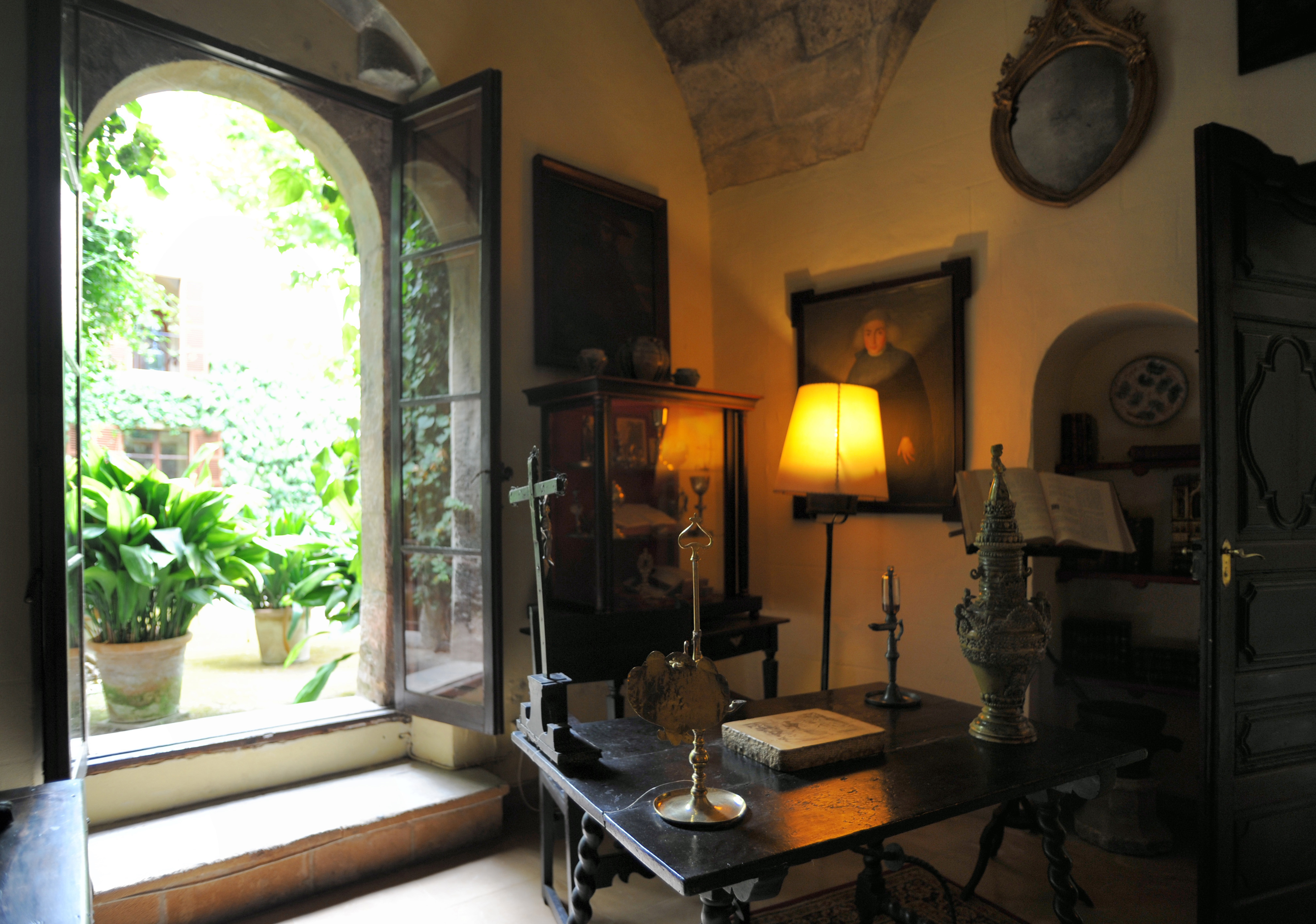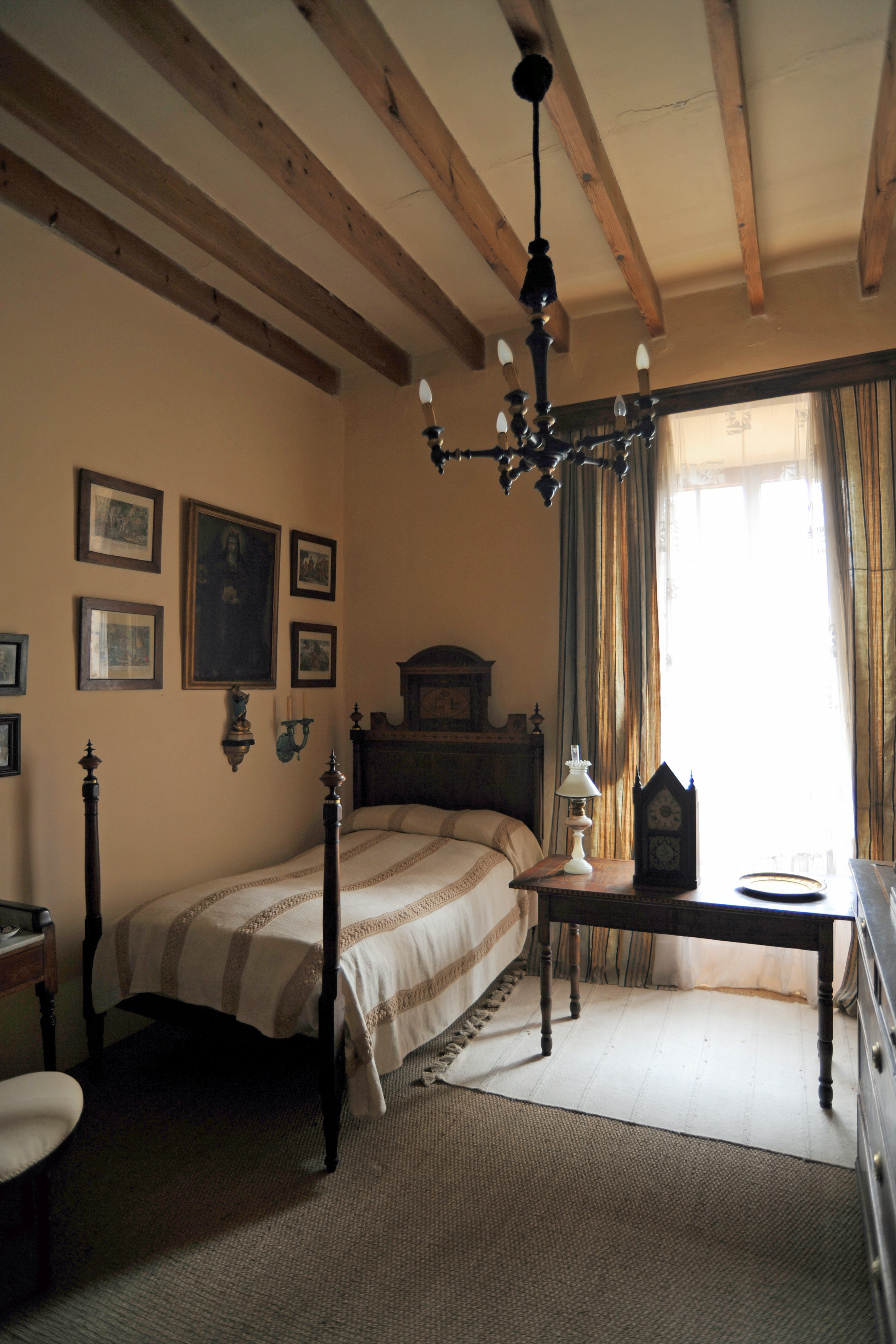 | | | | | | | | Le vestibule de l’étage | À l’étage se trouvent les chambres des Maîtres, avec un total de cinq pièces desservies par un vestibule et un couloir de service : le vestibule, face à l’escalier, donne accès à la garde-robe de Monsieur à droite, et à la garde-robe de Madame à gauche.Le vestibule présente un grand nombre d’objets et de curiosités : les cadres chronologiques des papes (jusqu’à Léon XIII en 1878), des rois d’Espagne, et des empereurs du Saint-Empire romain germanique, des plans et des cartes (carte de Palma, 1894), et diverses images pieuses, comme un Arbor Seraphico franciscain. | _small.jpg) _small.jpg) _small.jpg) _small.jpg) _small.jpg) _small.jpg) |