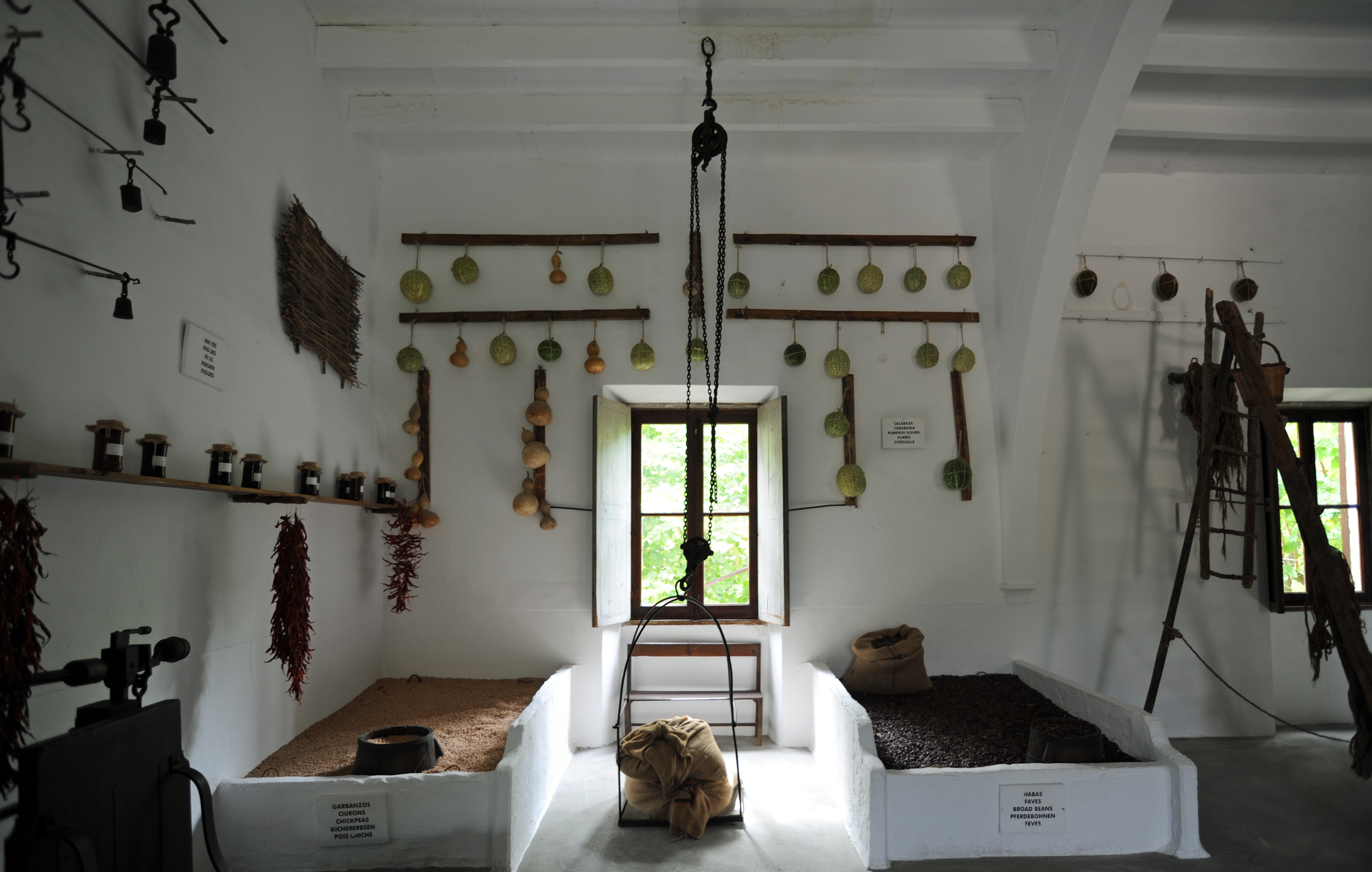 | | Le grenier | | Par une petite porte à linteau, on passe dans le grenier, également connu sous le nom de « cuartera ». Le grenier est une salle de très grandes dimensions, à deux arcades soutenues par trois fins piliers octogonaux à base carrée, avec deux ouvertures elliptiques au sommet. | _small.jpg) _small.jpg) _small.jpg) _small.jpg) _small.jpg) _small.jpg) | | Dans le grenier on emmagasinait les produits de la ferme, divers fruits et grains : pois chiches, fèves, haricots, amandes, caroubes, blés, maïs … | _small.jpg) _small.jpg) _small.jpg) _small.jpg) _small.jpg) | | Le grenier expose maintenant diverses machines et outillages agricoles : moissonneuse romaine, faucheuse, trémie, batteuse, presse à fromage, échelles … | _small.jpg) _small.jpg) _small.jpg) _small.jpg) | _small.jpg) _small.jpg) _small.jpg) |