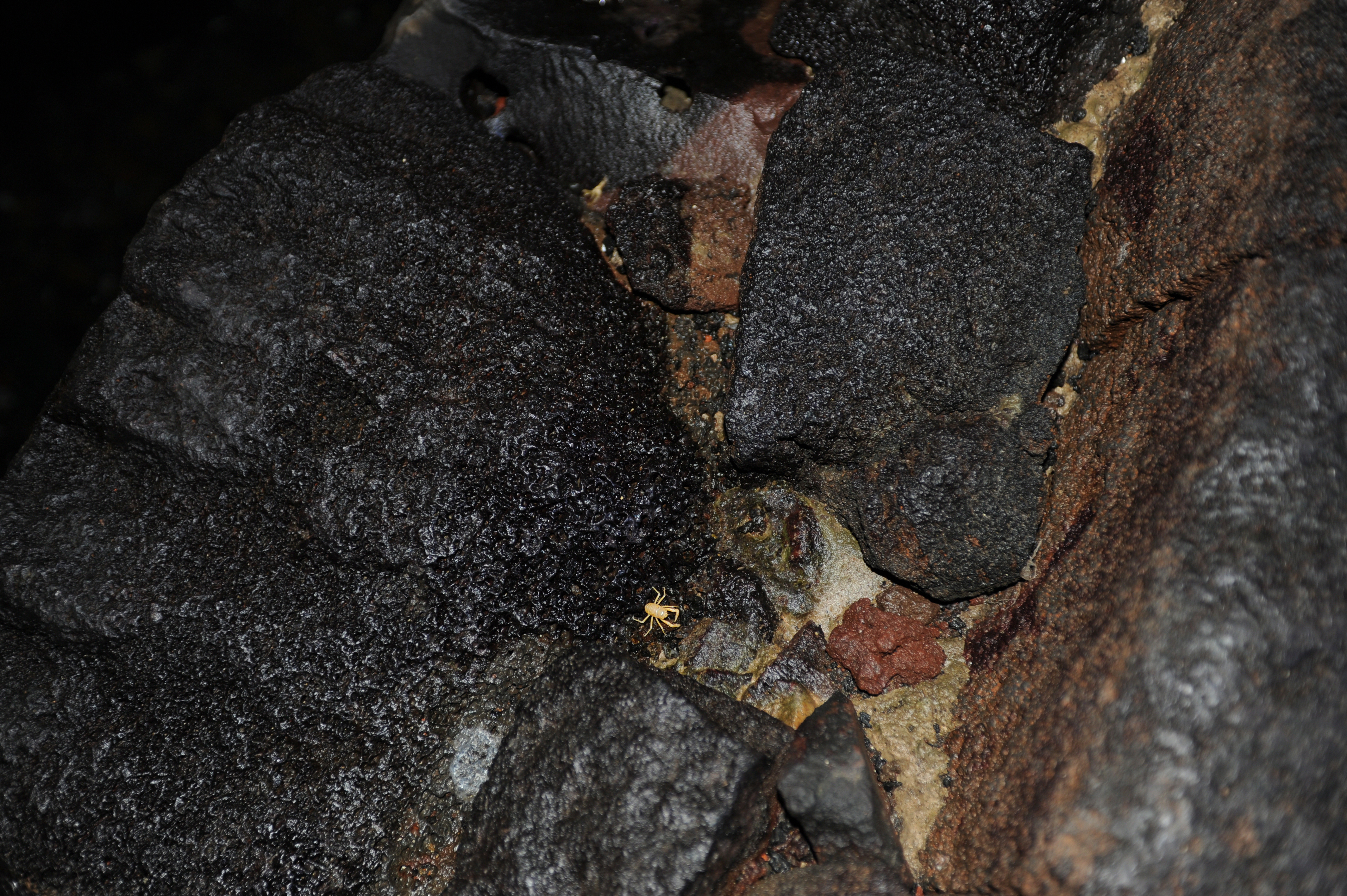 Towards the middle of the hose a natural orifice in the roof illuminates the lake waters; it is mid-day, when the weather is sunny and the sun is at its zenith, this lighting makes the better to admire the clarity and transparency of the lake water. | Small blind and albino lobsters | In the salt waters of the underground lake live more than a dozen of endemic aquatic species, the most famous is a blind crustacean, albino and luminescent, the Munidopsis polymorpha that people hundreds rocky bottoms of lake.The Munidopsis polymorpha lived originally in the deep waters of the ocean, several thousand meters deep. Due to the darkness of the cave crustacean has lost its pigmentation and sight; it is whitish in color and of a size not exceeding 15 mm, with a tail folded under the thorax, like a tiny lobster more than a crab. This species is only found in more than jameos. The Munidopsis polymorpha is a highly endangered species; it only lives in the depths of Lanzarote and in particular in the Jameos del Agua. César Manrique had nicknamed “jameitos”. Health jameito is particularly threatened by the presence of metal oxides in the waters where it lives: lakeside signs prohibit throw coins into the water, because their corrosion could cause the death of these unique creatures.