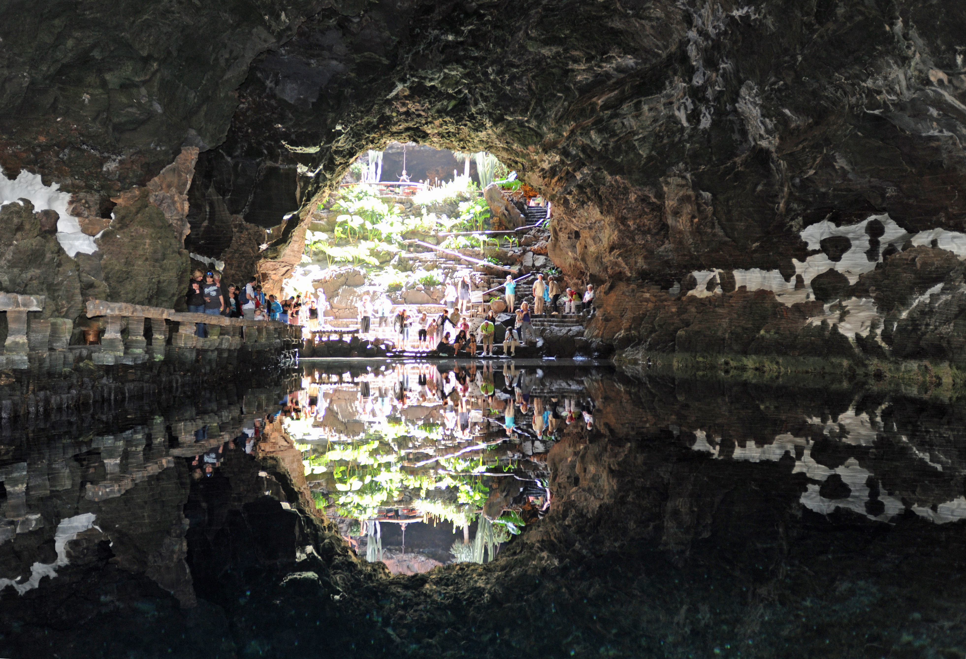 | | The chasms of Jameos del Agua | The Jameos del Agua are a set of three volcanic chasms located on a casing formed by volcanic lava very fluid glass from the volcano Monte Corona during its eruptions, there are between 4500 and 3000 years. This hose has its origin in the volcano’s crater, 6 km from the coast, and continues 1.5 km to a depth of 50 m under the sea, by what is called the “Tunnel of Atlantis” (Túnel de la Atlántida). This volcanic gut is one of the longest in the world, with nearly 8 km long. The top layer of the lava has solidified, while the washing continued to flow into the lower part. The depletion of the lava flow left a vacuum hose filled with volcanic gases; over the years the vault of the hose collapsed in different places, opening chasms similar karst sinkholes in limestone. The Jameos del Agua, like the Cueva de los Verdes, are sites where volcanic hose appears in the open, but other “jameos” exist upstream of the casting, such as Jameo de Puerta Falsa - where were hiding inhabitants of Lanzarote during the attacks of Barbary pirates - the Jameo Cumplido, largest, and Jameo de la Gente. The term jameo is an aboriginal term majo meaning “hole” or “mouth” of the land.
