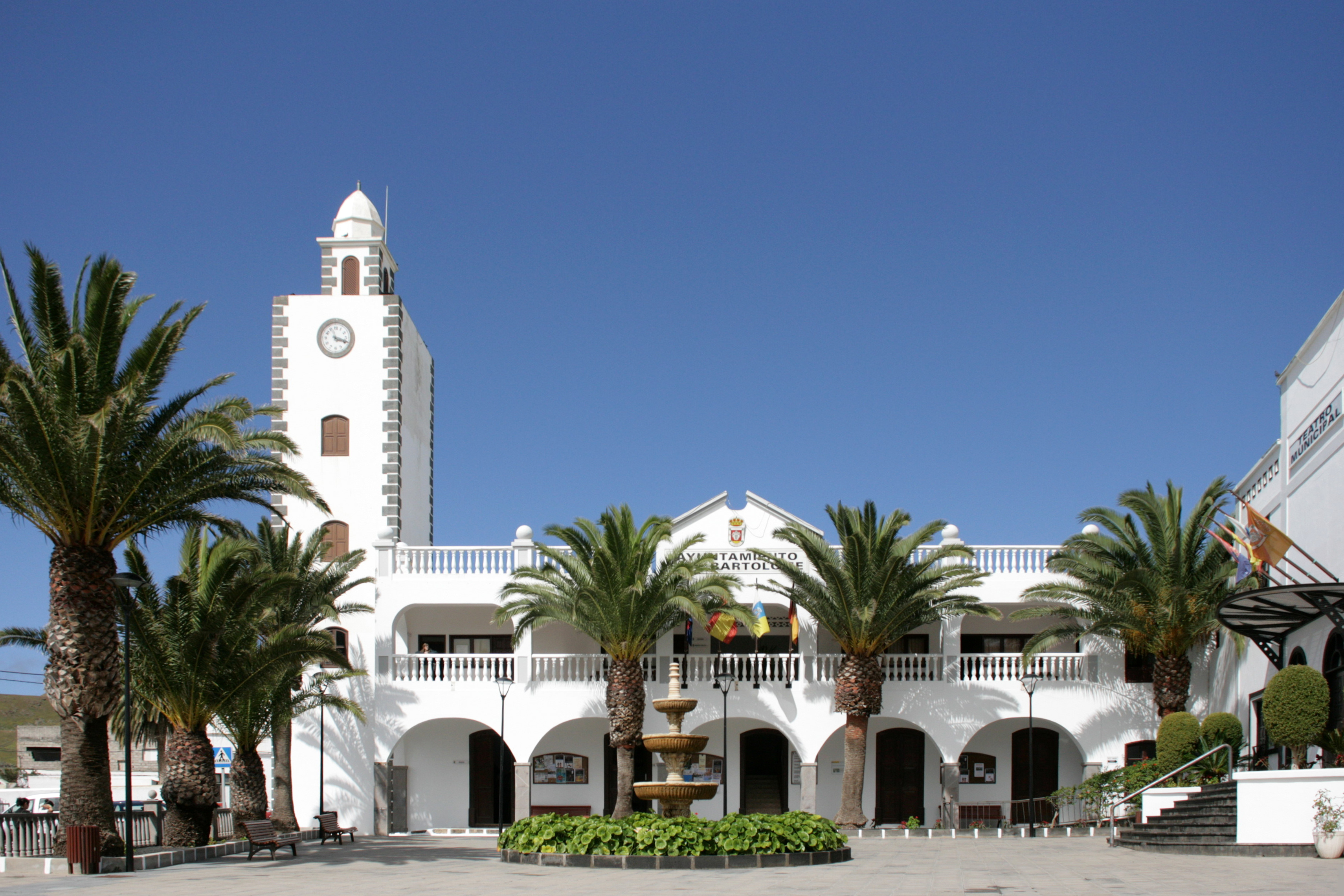| | The village of San Bartolomé | | The history of San Bartolomé dates back to the sixteenth century, but especially in the eighteenth century that the city developed with the influx of people driven from their land by volcanic eruptions of Montañas del Fuego, from 1730 to 1736. The city, located in a strategic location of the island, became the stronghold of the Military Governor of Lanzarote, Francisco Guerra Clavijo y Perdomo. At the end of the eighteenth century the town had 144 inhabitants and several stately mansions. _small.jpg) The center of San Bartolomé is located around the Plaza León y Castillo where stands the church of St. Martin (Point C on the map), with his left Municipal Theatre (Point B), then the Hotel de city (Ayuntamiento) (Point A). The beautiful facade of the town hall has a gallery on the ground floor and a balcony upstairs; it is shaded by large palm trees, and on his left stands a tall belfry that seems to compete with the bell tower of the parish church. The center of the square is decorated with a beautiful fountain.