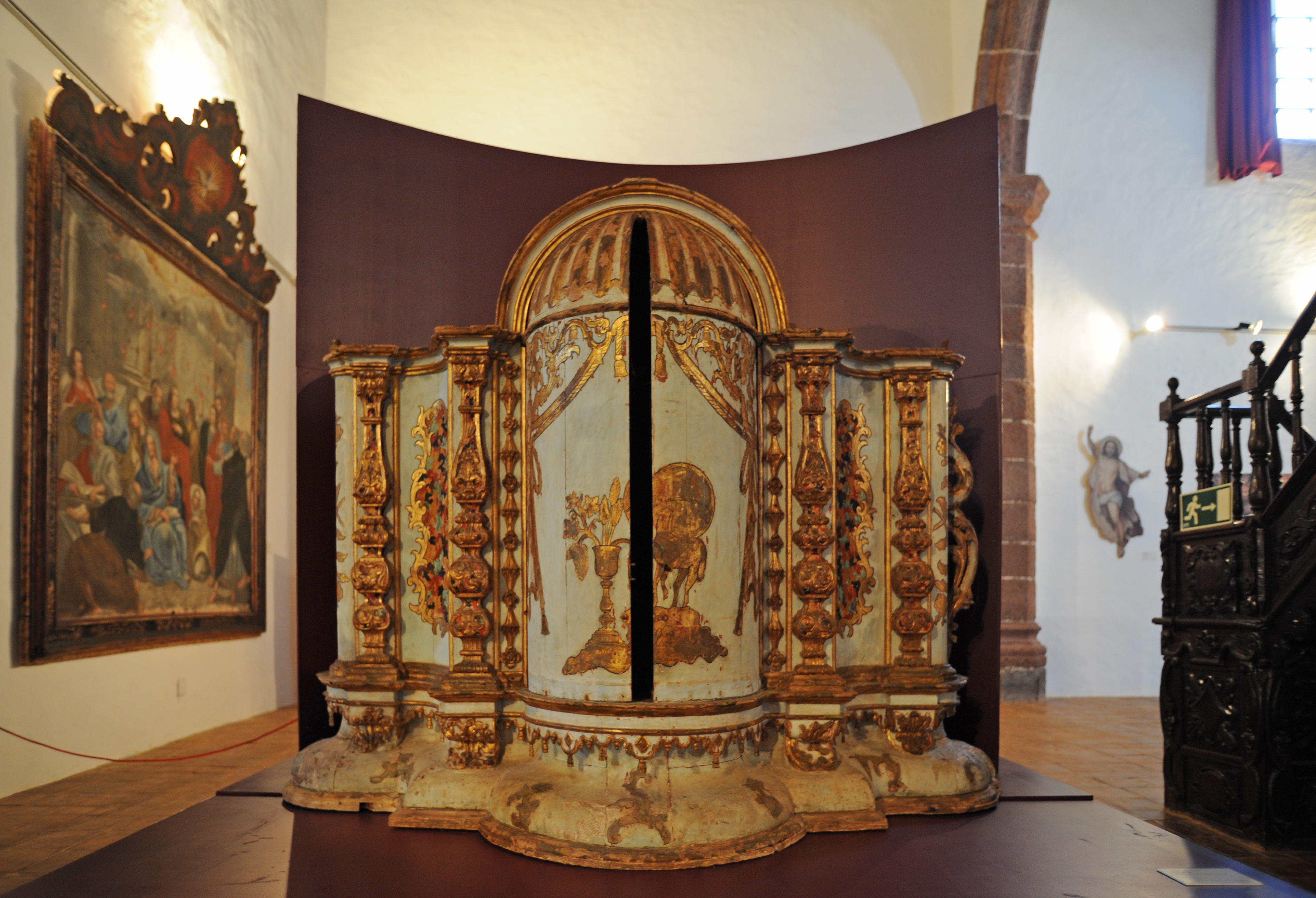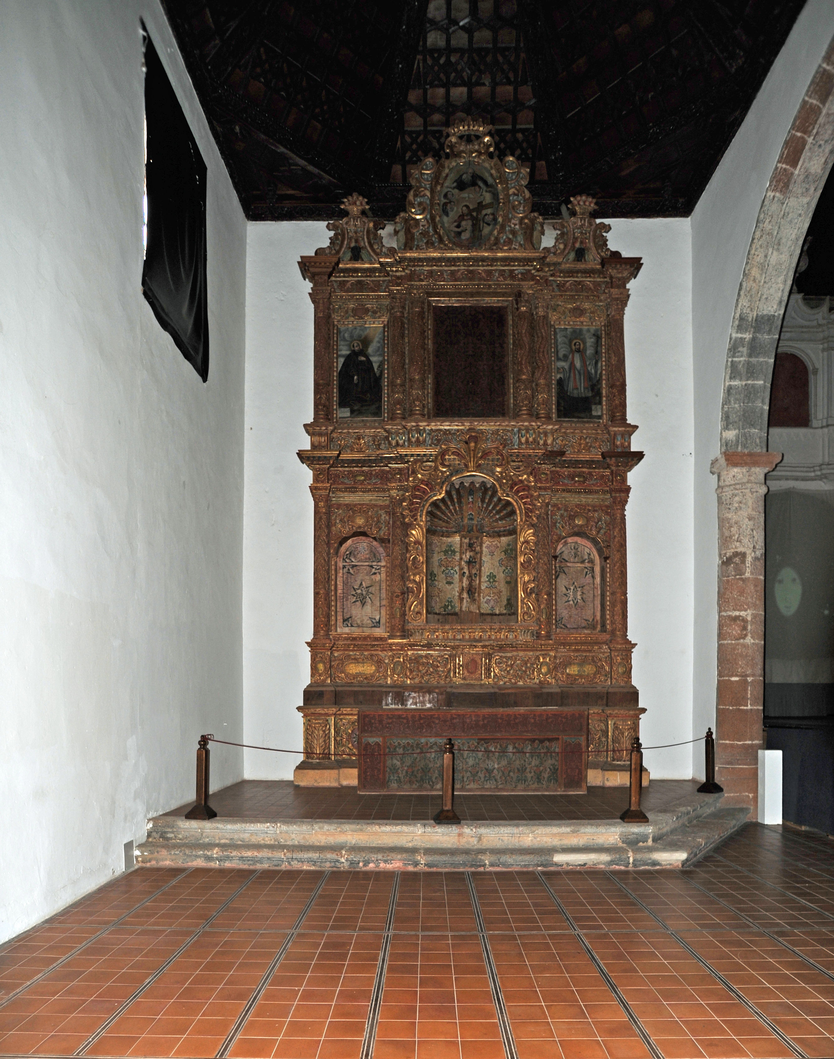 | L’ancien couvent Saint-François (Convento de San Francisco) | _small.jpg) L’église et le couvent franciscains de Teguise furent édifiés sous les auspices de Don Gonzalo Argote de Molina, comte et provincial de Séville, marié à une fille de Don Agustín de Herrera y Rojas, premier marquis de Lanzarote. Les travaux commencèrent en 1588 et la consécration de l’église eut lieu le 26 avril 1590 ; le couvent fut confié à des missionnaires de l’ordre des Franciscains ; l’église était initialement consacrée à Notre-Dame de Mirefleurs (Madre de Dios de Miraflores).Moins de trente ans après sa construction, en 1618, le Convento de Miraflores fut pillé et incendié par les hordes des pirates algérois Xaban et Soliman, de même que beaucoup d’autres bâtiments de Teguise. Le couvent et l’église furent restaurés au cours des années suivantes ; une seconde nef fut ajoutée à l’église. | _small.jpg) _small.jpg) Aux XVIIe et XVIIIe siècles le Convento de San Francisco fut utilisé comme lieu de sépulture pour les citoyens les plus éminents de Lanzarote.Au XIXe siècle le couvent fut victime des politiques de désamortissement (desamortización) de gouvernements libéraux espagnols ; les bâtiments conventuels furent découpés et vendus comme habitations. Il ne reste aujourd’hui du couvent franciscain que l’ancienne église, transformée en Musée d’Art Sacré. | _small.jpg) La façade de l’église Saint-François comporte un portail en pierre volcanique rougeâtre, surmonté de deux motifs inhabituels en forme de spirale, d’inspiration hispano-américaine, et d’un oculus.L’intérieur de l’église comporte deux nefs ; la nef de l’Évangile, à gauche, comporte deux chapelles et un grand retable à trois panneaux ; la nef de l’Épître, à droite, est plus petite et formée de quatre chapelles. Les éléments les plus remarquables sont les trois retables de style baroque, les plafonds en bois sculpté de style mudéjar, la chaire en bois sculpté et les fonts baptismaux en pierre volcanique. | Le retable du maître-autel de la nef de l’Évangile a été réalisé dans la seconde moitié du XVIIIe siècle ; il est dédié à Notre-Dame de Mirefleurs, titulaire du couvent. Ce retable, de style baroque, est constitué de six panneaux répartis sur deux sections horizontales et trois sections verticales ; les niches de la section horizontale du bas représentent : la Madre de Dios de Miraflores dans la niche centrale, saint François dans la niche de gauche et saint Diègue d’Alcalá dans la niche de droite. Dans la deuxième section horizontale – la mieux conservée – on peut voir, sur le panneau de gauche, une peinture de l’Immaculée Conception, l’Ascension du Christ, sur le panneau central, et l’Étreinte de saint François et de saint Dominique, sur la panneau de droite. Dans le fronton se trouve une toile d’un Ecce Homo.