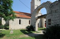 Les ruines de l’abbaye bénédictine Saint-Jean | Dans le cimetière on peut voir les vestiges d’un monastère bénédictin : entre la fin du IXe siècle et le début du Xe siècle les Bénédictins bâtirent, sur les fondations de la basilique paléochrétienne, un monastère qui deviendra célèbre. Le monastère Saint-Jean de Povlja est considéré comme le plus grand et le plus ancien de Croatie. Les moines bénédictins transformèrent le baptistère de l’ancien sanctuaire en chapelle du monastère ; sur les ruines de l’abside, ils construisirent leurs modestes quartiers d’habitation. En 1145, le monastère fut dévasté par des pirates d’Omiš ou de la Neretva ; il fut restauré en 1184 par le Frère Ratko. C’est à cette date que fut gravé sur le linteau de l’entrée du monastère un des premiers texte en écriture croate cyrillique ; ce document est connu comme le « linteau de Povlja ». En 1184, les moines inscrivirent aussi sur un parchemin les revenus des biens et une liste des terres appartenant au monastère. Ce parchemin est connu comme la charte de Povlja ; il est rédigé dans la même écriture.Au XVIe siècle, les Bénédictins se retirèrent de Povlja, quand les Turcs commencèrent à s’aventurer sur les côtes de l’île de Brač ; une fortification avec des tours de défense fut bâtie entre 1551 et 1559, qui est encore visible aujourd’hui. Les vestiges de l’église bénédictine, qui a été partiellement préservée jusqu’à la toiture, comprennent le linteau et la partie absidiale avec un triforium. | _small.jpg) _small.jpg) _small.jpg) | | Le linteau de Povlja (Povaljski prag) | | Le linteau de Povlja se trouvait au-dessus de la porte sud du monastère Saint-Jean. Il fut gravé par un tailleur de pierre renommé appelé Radonja, lorsque l’église fut reconstruite en 1184. L’inscription du linteau immortalise la contribution de ce maçon à travers son travail effectué sur l’église, ainsi que le rôle joué par un prince nommé Brečko qui avait fait don de terres à des fins de construction de l’église. Ce qui fait la valeur de ce linteau c’est qu’il est – avec la Charte de Povlja – l’un des premiers documents rédigés en langue croate en caractères cyrilliques occidentaux, également nommée « bosančica ».