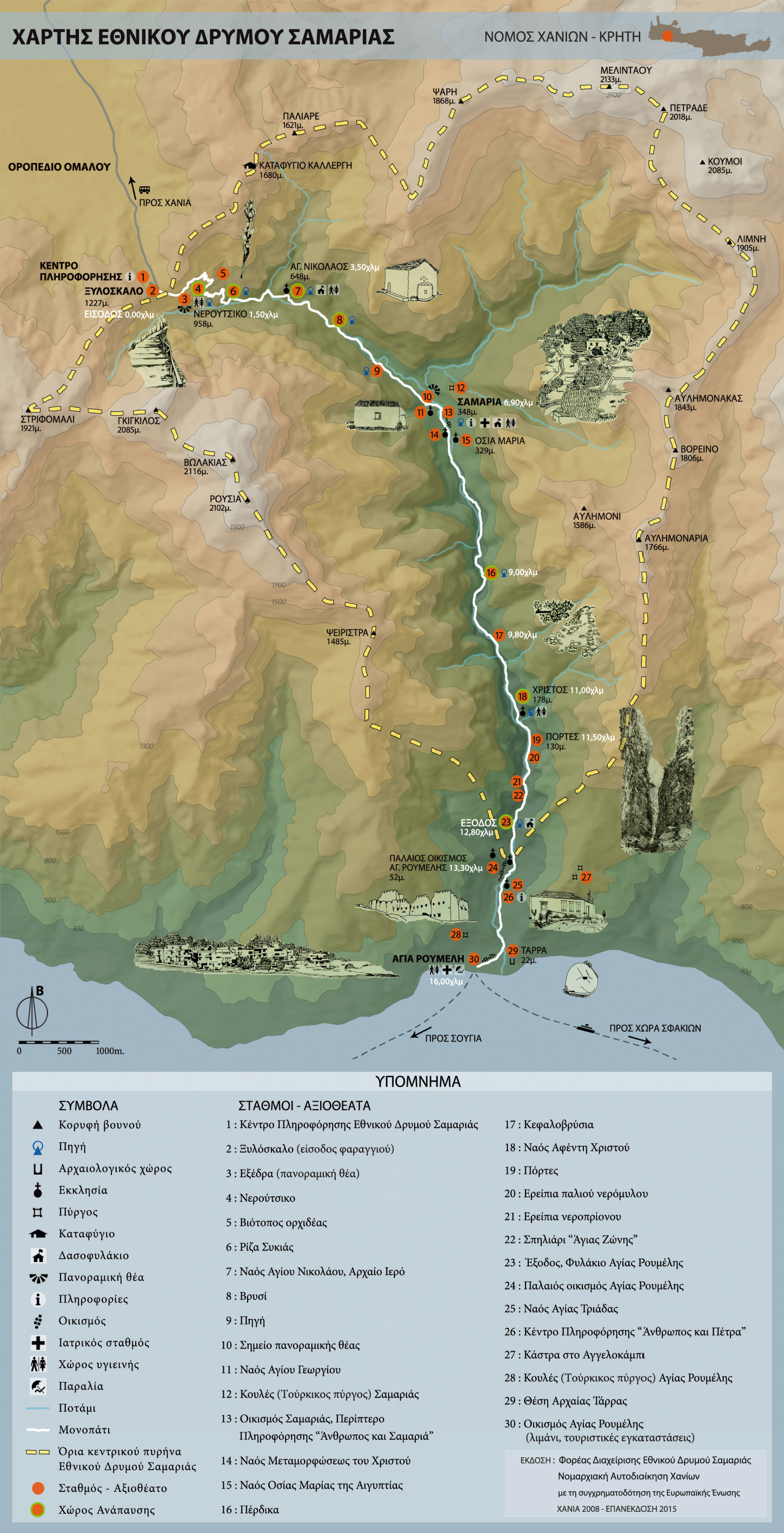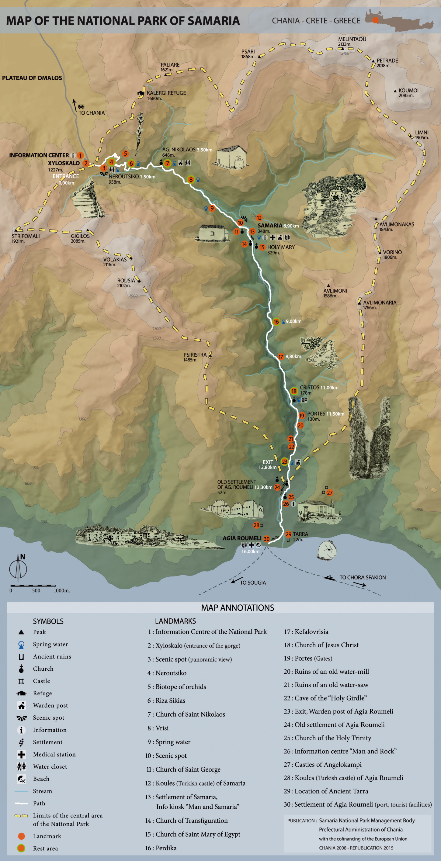 Une fois atteint le fond des gorges, le sentier est moins abrupt mais il devient rocailleux et accidenté, et nécessite de bonnes chaussures de marche. Le sentier est plutôt ombragé au début des gorges, mais un chapeau est indispensable à la sortie des gorges, très exposée au soleil. If faut éviter de se charger inutilement : des vêtements légers ; un peu de nourriture sèche et énergétique, car il n’y a aucun lieu de restauration dans les gorges ; une bouteille d’eau que l’on pourra remplir aux diverses sources que l’on rencontre sur le trajet. Le sentier est bien balisé et il n’y a aucun risque de s’égarer ; des bornes kilométriques jalonnent le parcours dans la partie intérieure au Parc. Le trajet prend entre 5 h et 7 h selon la condition physique du randonneur et la durée de ses haltes dans les divers points d’intérêt des gorges. Les gorges de Samaria sont jalonnées par plusieurs chapelles byzantines solitaires, notamment Saint-Nicolas (Agios Nikolaos), Saint-Georges (Agios Georgios), Transfiguration du Sauveur (Metamorfosi Sotiros), Sainte-Marie (Osia Maria) et Seigneur Jésus (Afentis Christos), parfois situées à l’emplacement de temples antiques. | _small.jpg) |