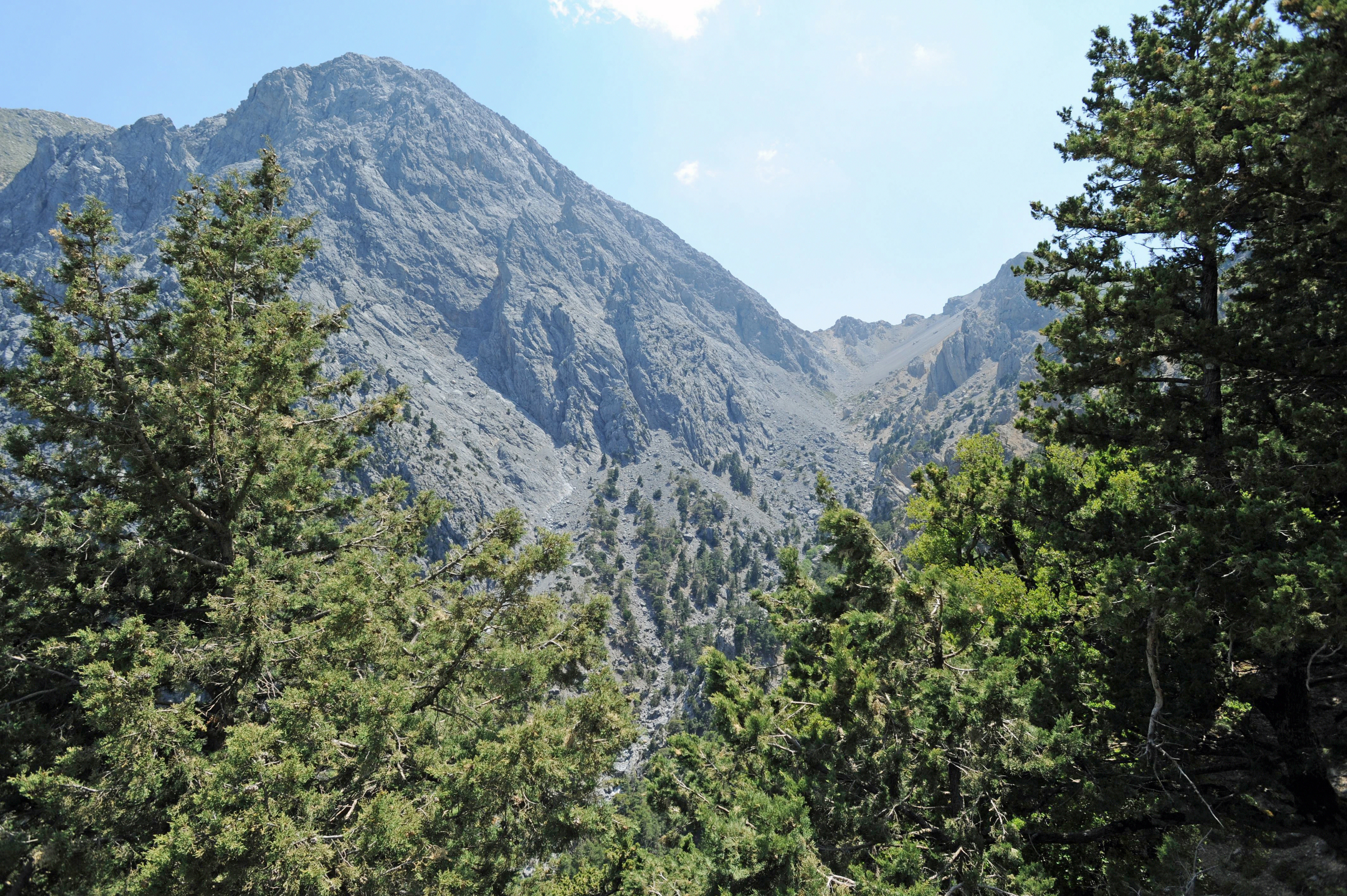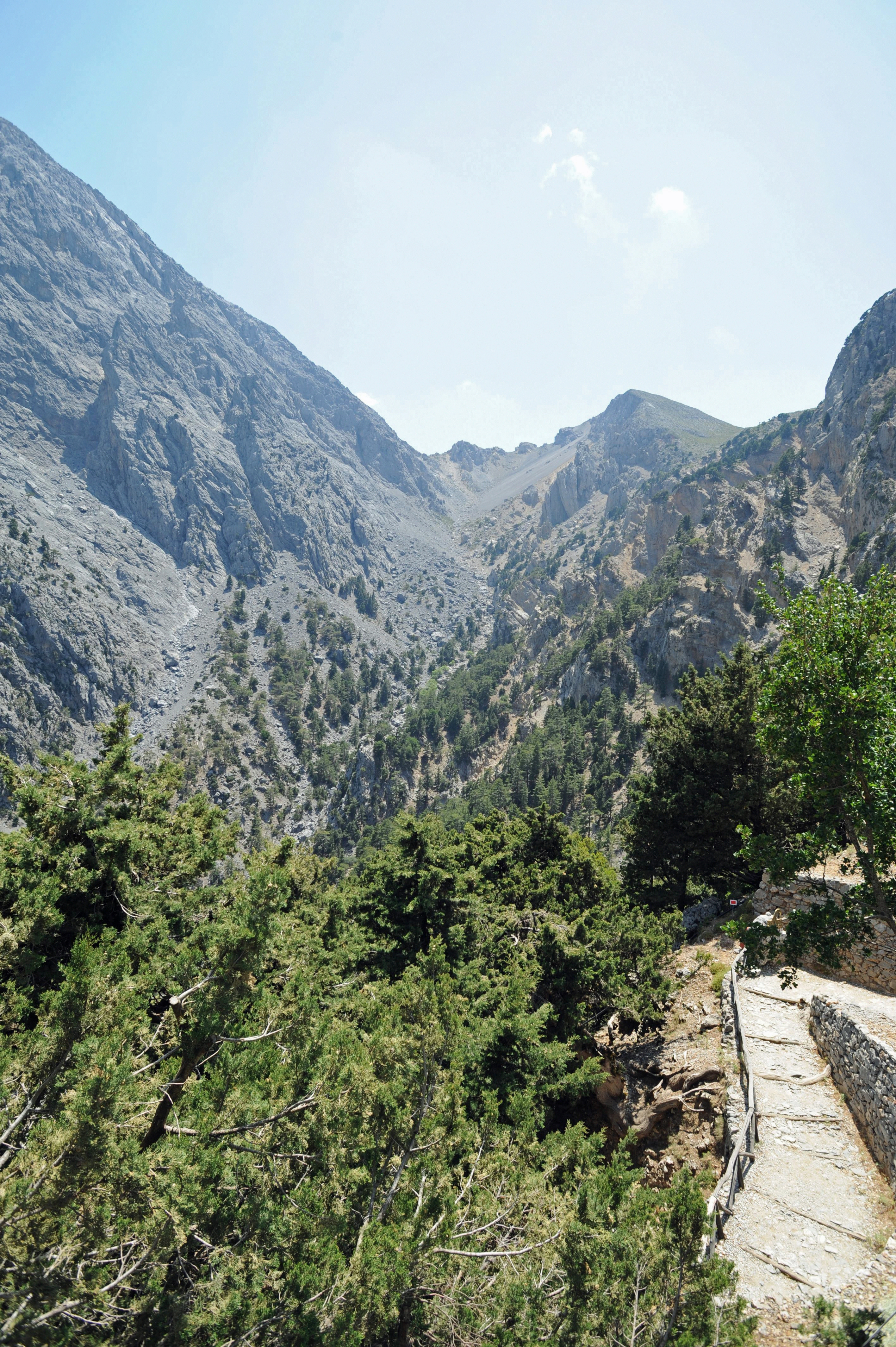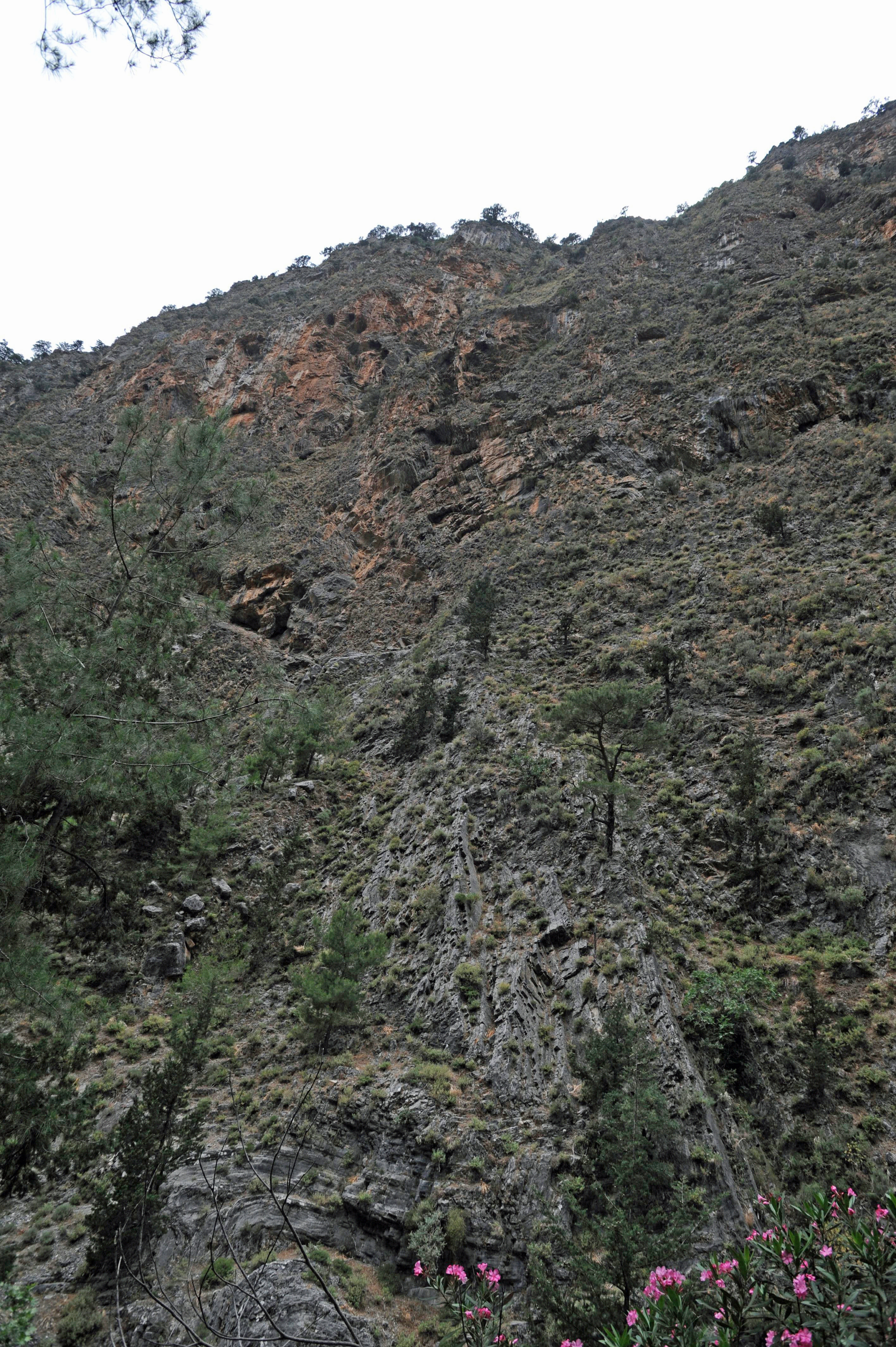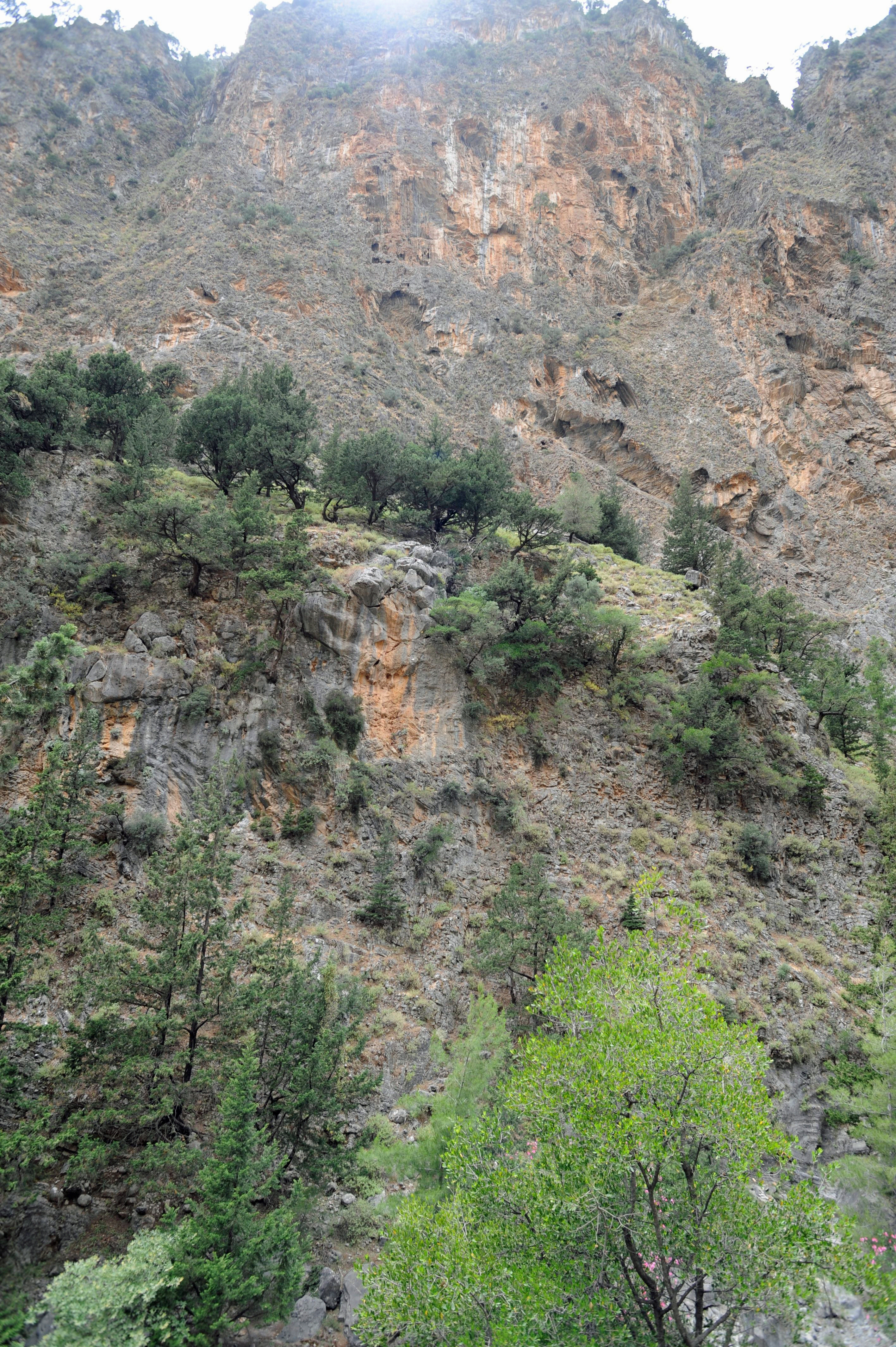 | | | La descente des gorges de Samaria débute au lieu-dit Xyloskalo, plus rarement nommé Xyloskala (Ξυλόσκαλα) (n° 1 sur la carte A, n° 2 sur la carte B) ; ce toponyme signifie « escalier de bois », du mot grec « ξύλο », « bois » et du mot grec byzantin « σκάλα, au pluriel σκάλες », « échelle ou escalier » ; en effet cette section du sentier est faite de marches en dalles de pierre retenues par des nez de marche constitués par des rondins de bois de pin ; du côté du ravin un garde-corps en rondins protège les randonneurs. Cet escalier de pierres descend le versant oriental des gorges, en une dizaine de lacets ; sur la droite on aperçoit les sommets dénudés des monts Gingilos (Γκίγκιλος) et Volakias (Bολακιάς), où seuls s’aventurent les kri-kris et quelques grimpeurs ; à gauche s’élèvent les monts Psari (Ψαρή) et Mélindaou (Mελινταού). Cette section est plutôt abrupte et éprouvante pour les genoux et les chevilles, mais elle est plutôt ombragée par la forêt de résineux et de platanes ; au printemps, les fleurs sauvages s’épanouissent sous le couvert végétal. | _small.jpg) |