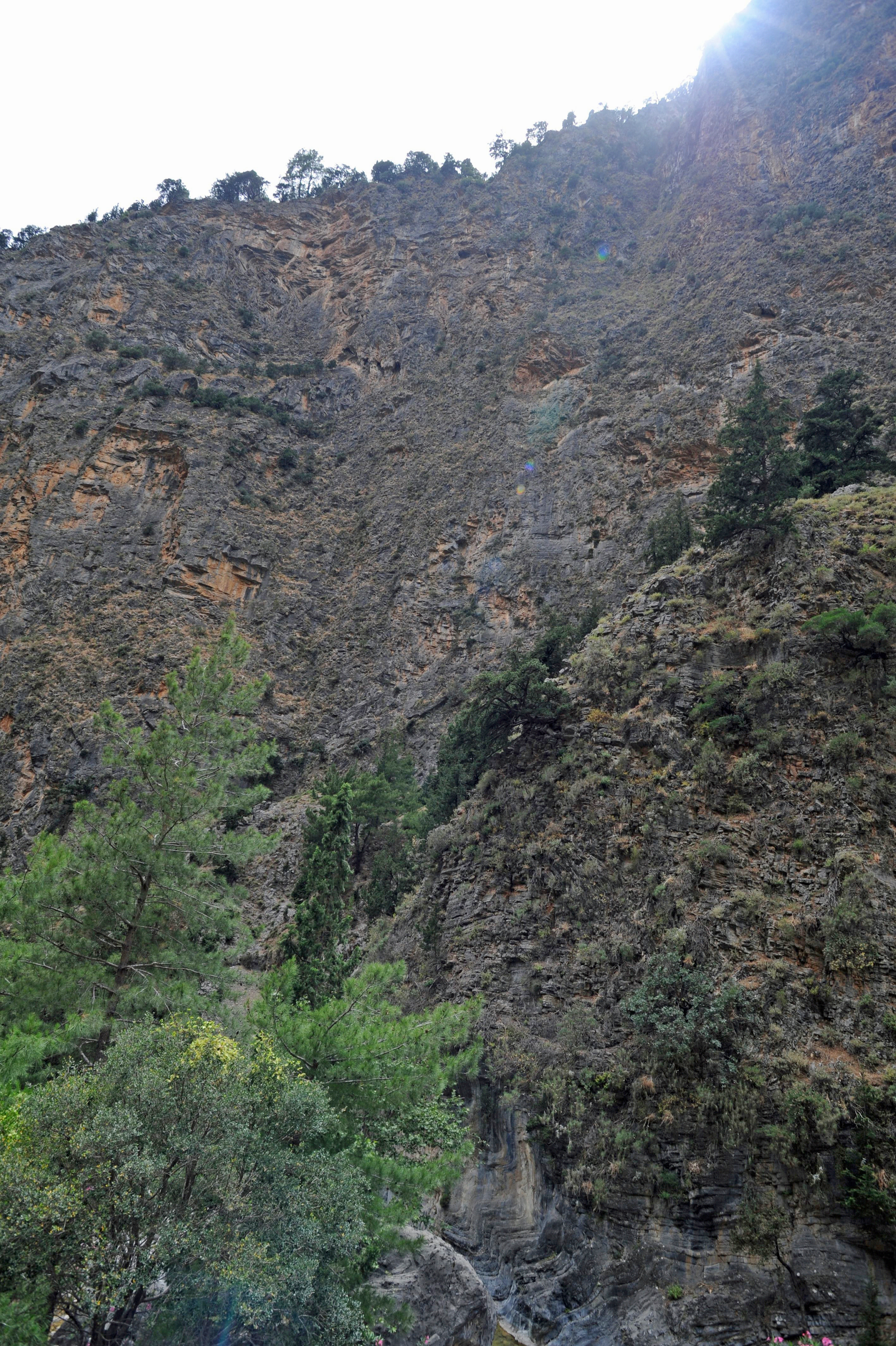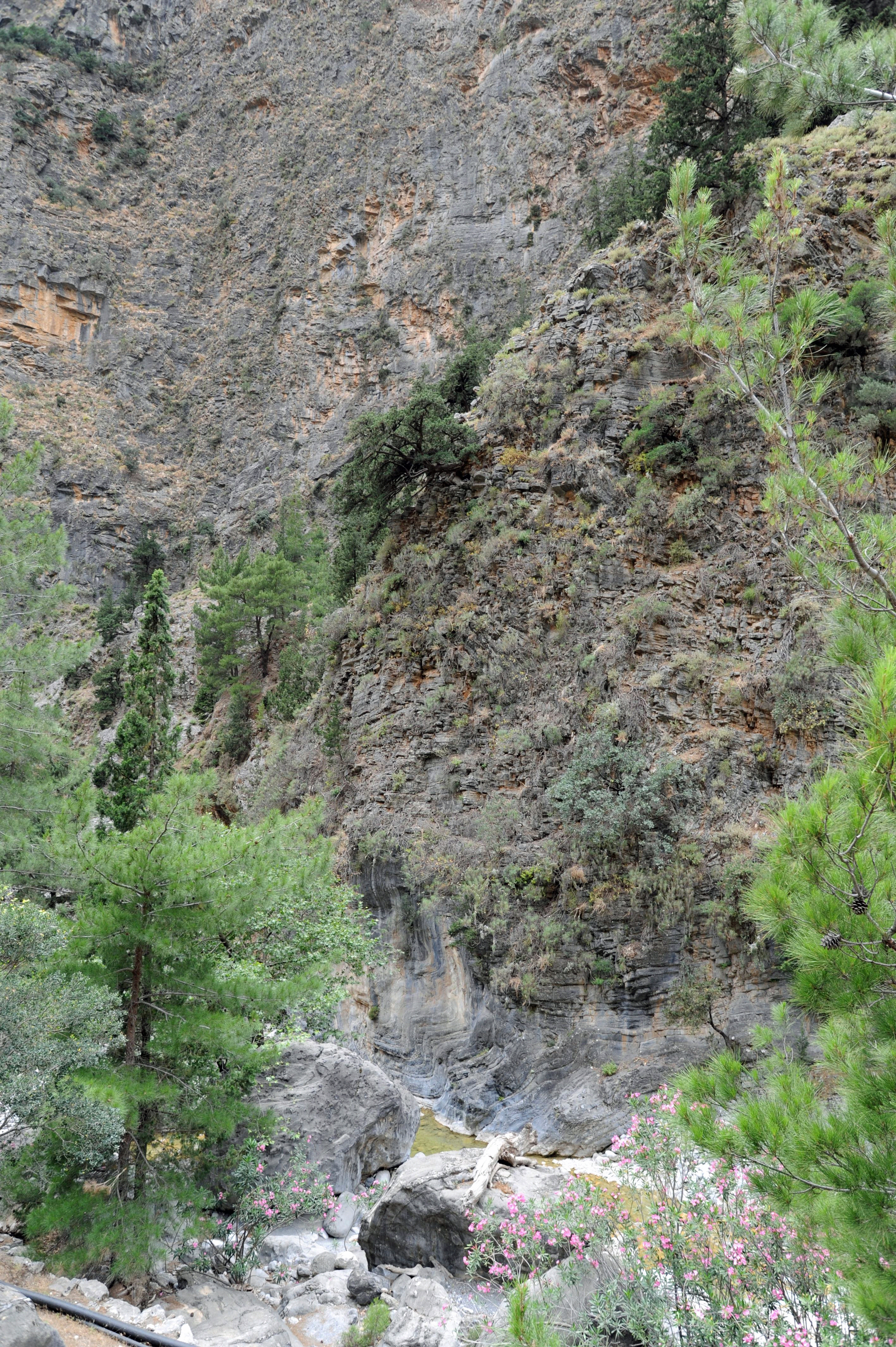 | | | Après 900 m à longer le lit du ruisseau, on parvient au lieu-dit Agios Nikolaos (n° 4 sur la carte A, n° 7 sur la carte B), situé à 648 m d’altitude, soit à peu près à la moitié du dénivelé total des gorges depuis le départ. À cet endroit on trouve une petite chapelle dédiée à saint Nicolas, avec un petit bassin et des bancs, ombragés par un bosquet de pins et de grands cyprès de Crète, vieux de 2 000 ans, dont certains ont 7 m de circonférence. À Agios Nikolaos, on trouve aussi une aire de repos, avec un poste de garde de l’Autorité forestière, des toilettes, et plusieurs sources d’eau potable. Au printemps les environs sont parsemés de fleurs sauvages.