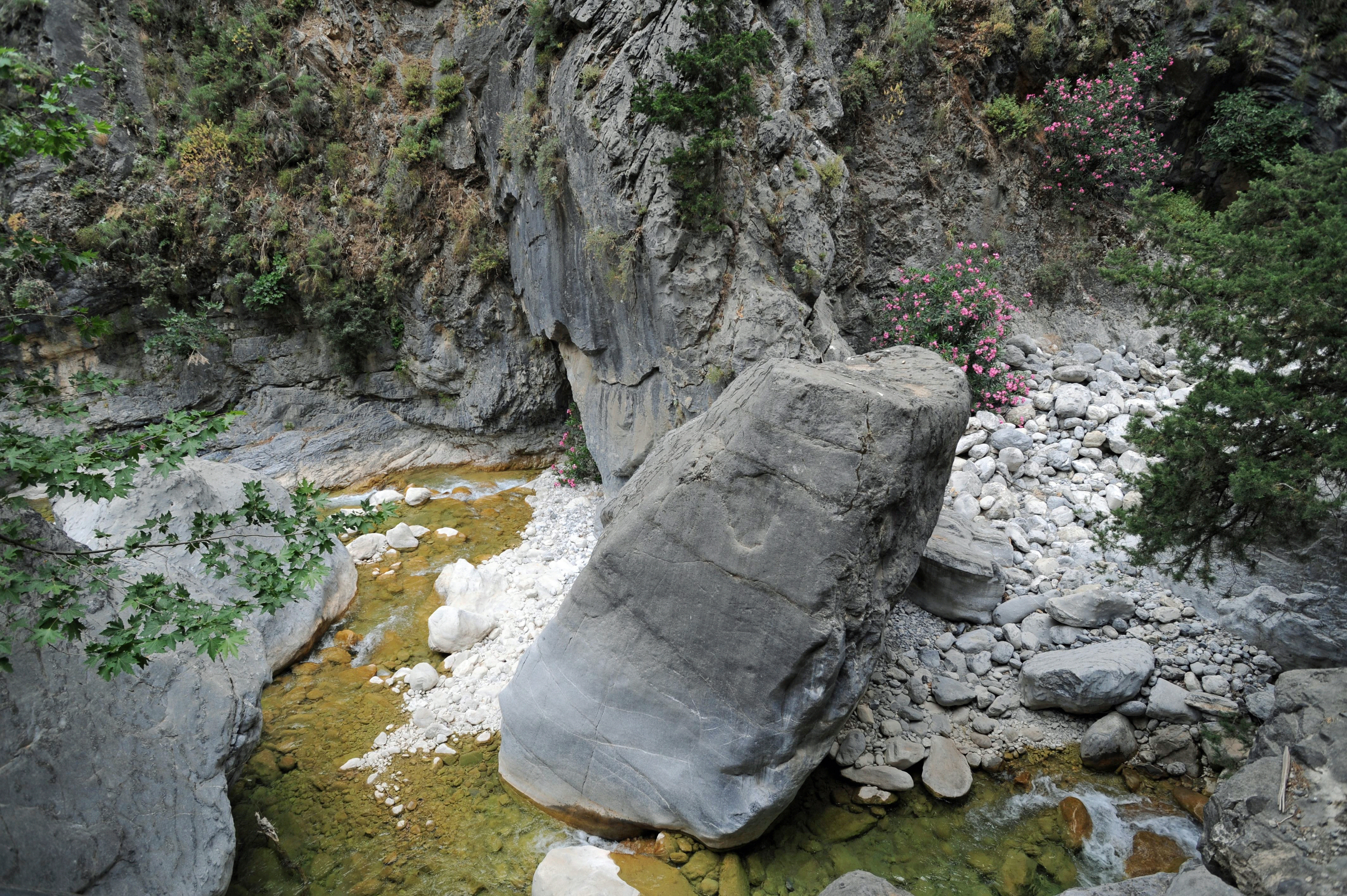 | | Après Agios Nikolaos, la pente diminue progressivement et la végétation se densifie ; à la fin du printemps, le site est magnifique, mais on y trouve des fleurs sauvages et des plantes rares à n’importe quelle période de l’année, notamment une pivoine blanche, la pivoine de Clusius (Paeonia clusii), une espèce menacée. Il faut rappeler que la cueillette des fleurs est strictement interdite.Le cours d’eau, quant à lui, est plus aléatoire : on y trouve par endroits une eau fraîche et glacée ainsi que des bassins où l’on peut se rafraîchir les pieds toute l’année, mais ce qui, au printemps, est un torrent impétueux, voire dangereux, se réduit, en été, à un mince filet d’eau entre des rochers arides et brûlants, disparaissant sous la surface sur de longs tronçons. Après 20 min et 900 m de marche, on atteint le lieu-dit Vryssi (n° 5 sur la carte A, n° 8 sur la carte B), c’est-à-dire « la fontaine, le robinet », situé à 534 m d’altitude. On y trouve, en effet, une fontaine en pierre. |