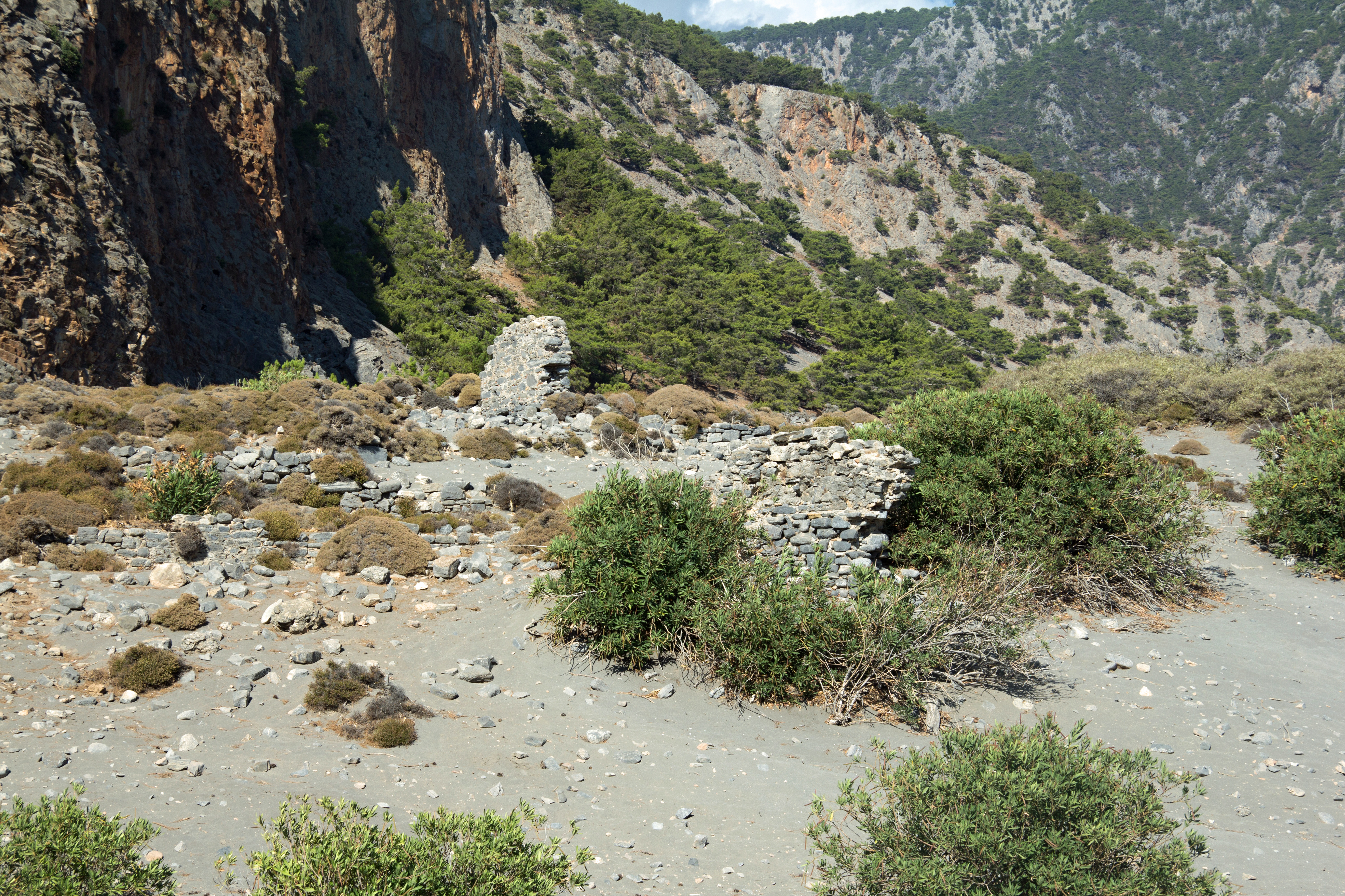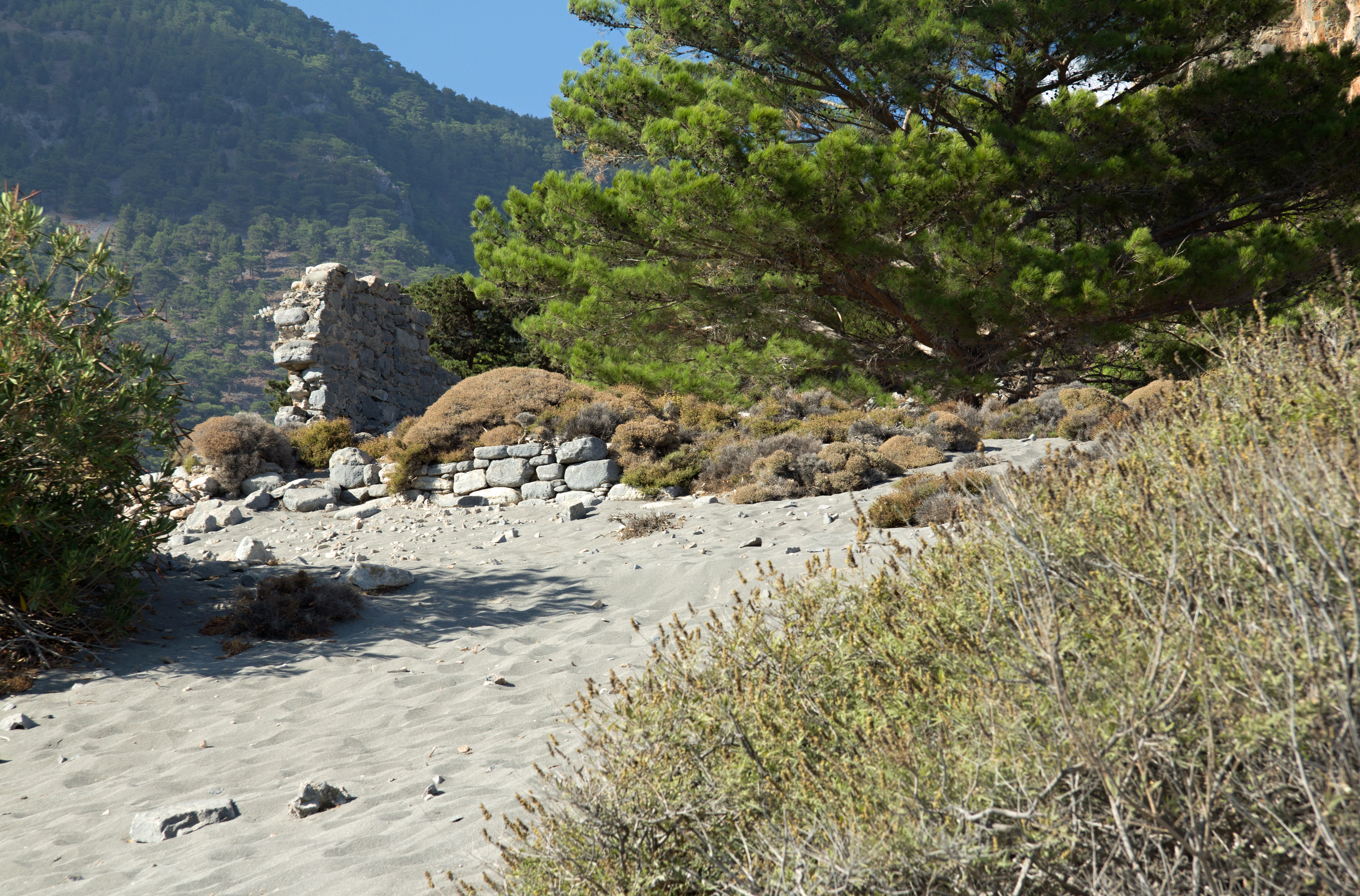 Peu après la chapelle se trouve l’héliport rudimentaire qui permet d’évacuer, en cas d’urgence, les randonneurs blessés. Aller à l’héliport de Samaria avec Google Maps (35.289547, 23.958636). Après avoir passé l’héliport, un petit sentier permet de descendre vers le lit du ruisseau ; sur la rive orientale on découvre les ruines des maisons de Kato Chorio de Samaria (Kάτω Xωριού της Σαμαριάς), qui abrite la petite église Sainte-Marie. |