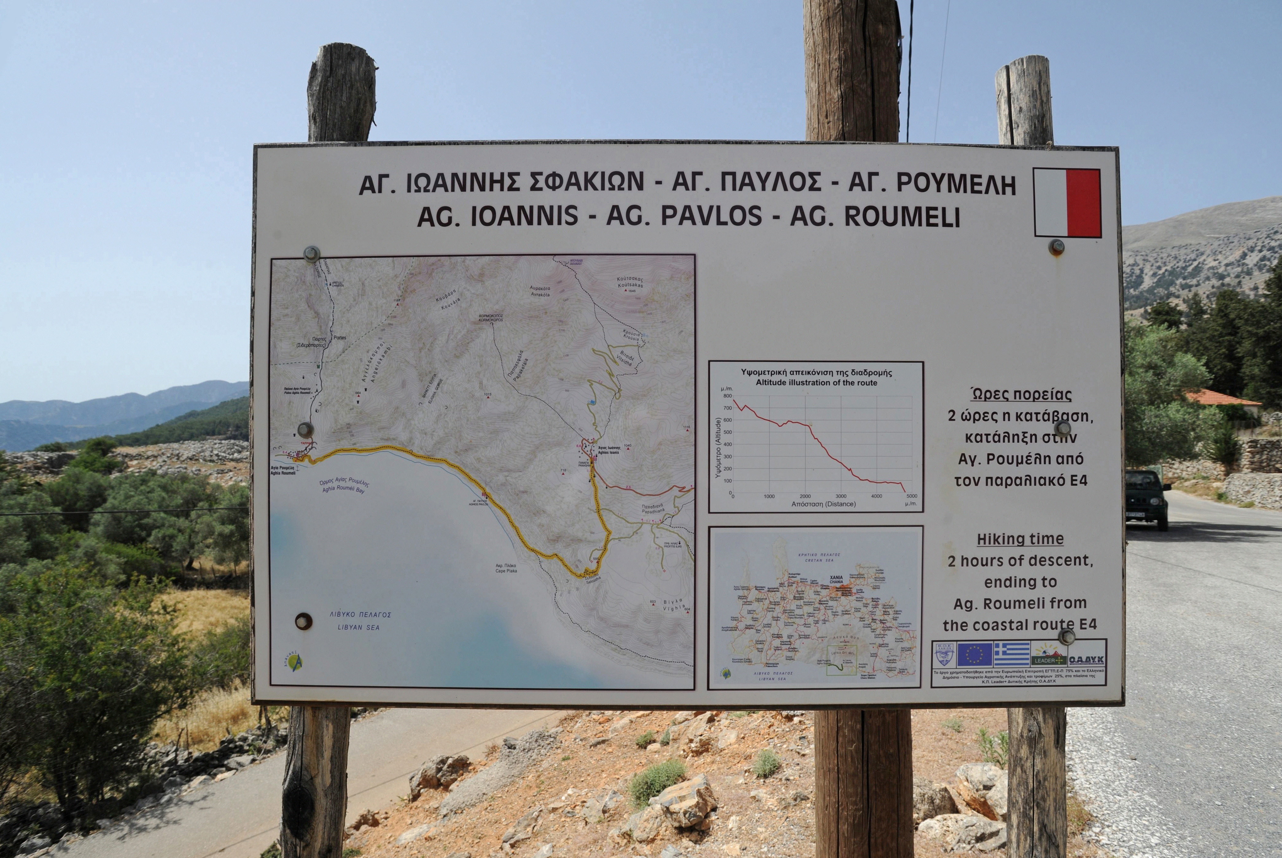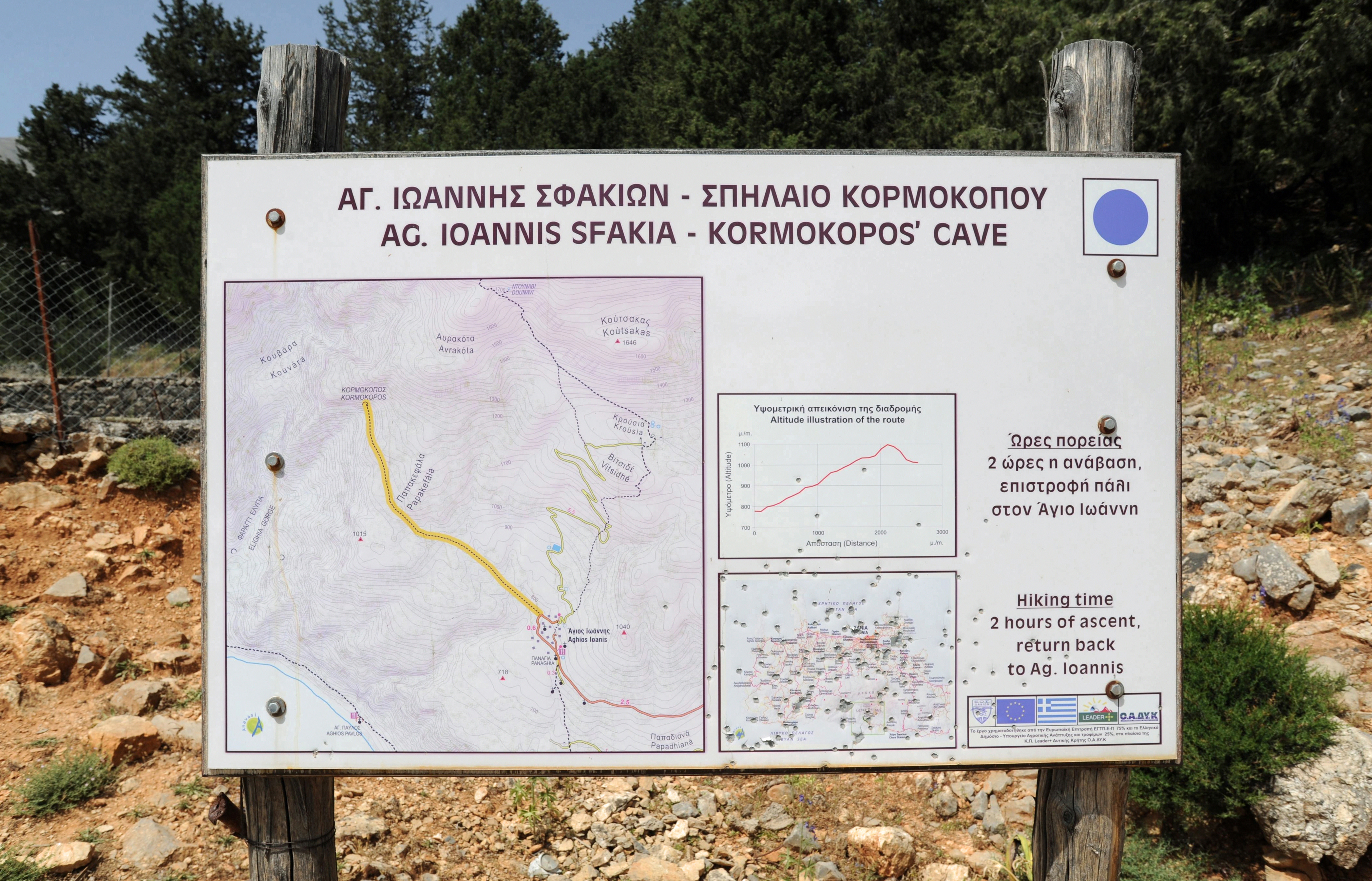 Aller à la grotte de Kormokopos avec Google Maps (35.251987, 24.000307). Une autre randonnée possible, à partir d’Agios Ioannis, conduit jusqu’à la côte où le sentier rejoint la section 12 du chemin européen de randonnée E4 ; en suivant le chemin E4 en direction de l’ouest, on atteint le cap Plaka (Άκρα Πλάκα), l’église Saint-Paul, puis le village côtier d’Agia Rouméli. Le dénivelé négatif de cette randonnée est d’environ 800 m et sa longueur est de 5 km ; il faut compter 2 h de marche pour atteindre Agia Rouméli.