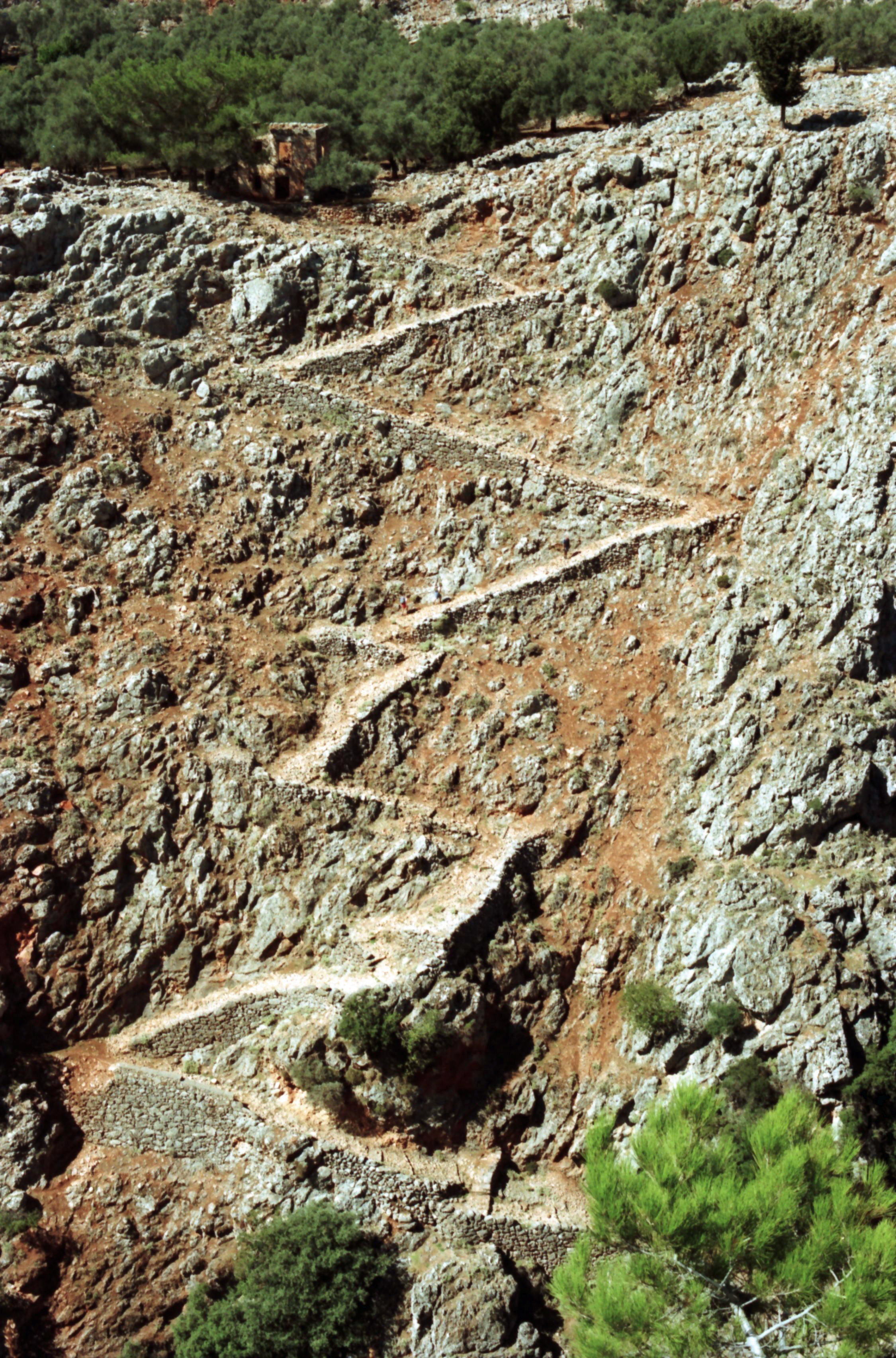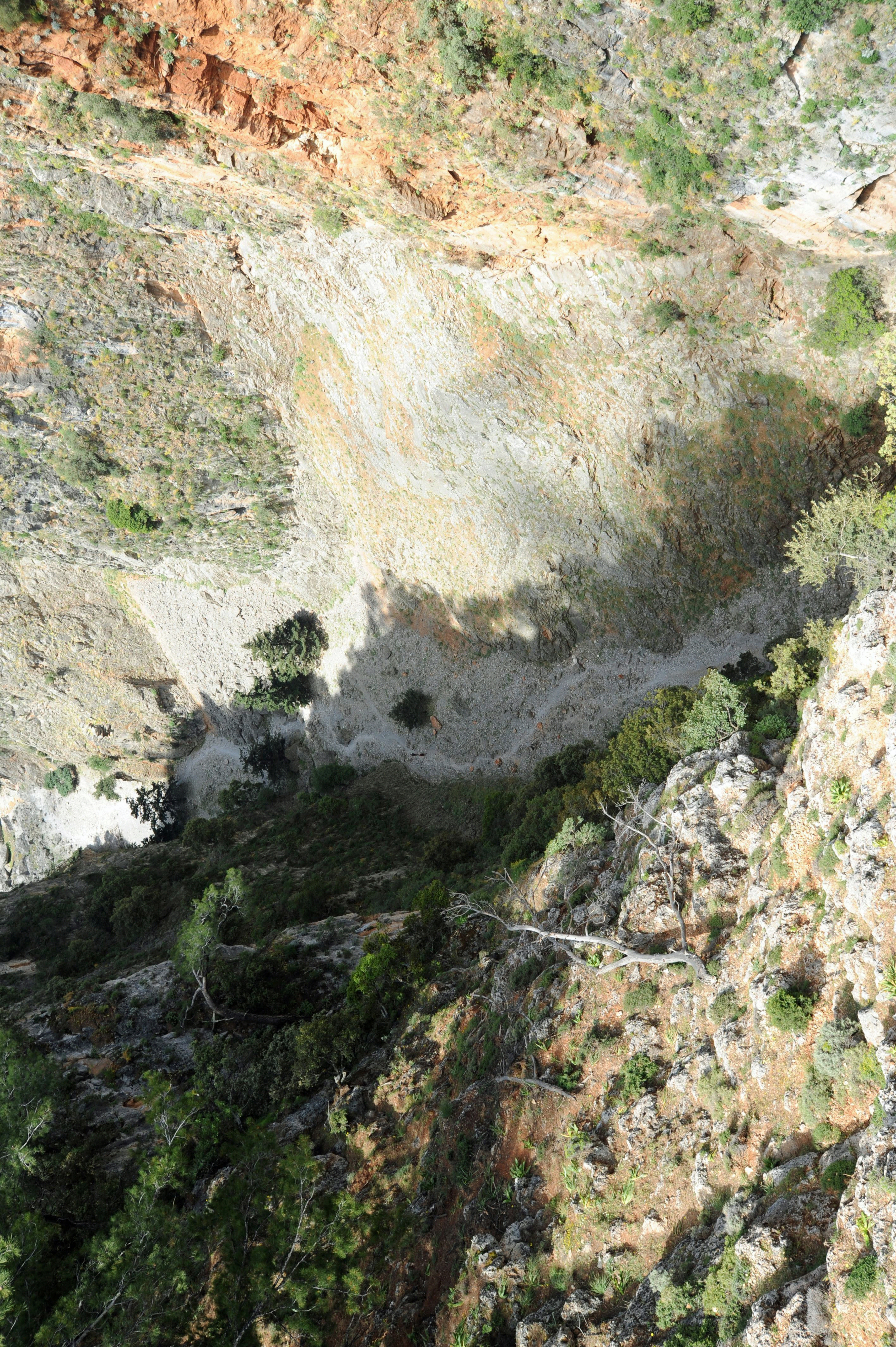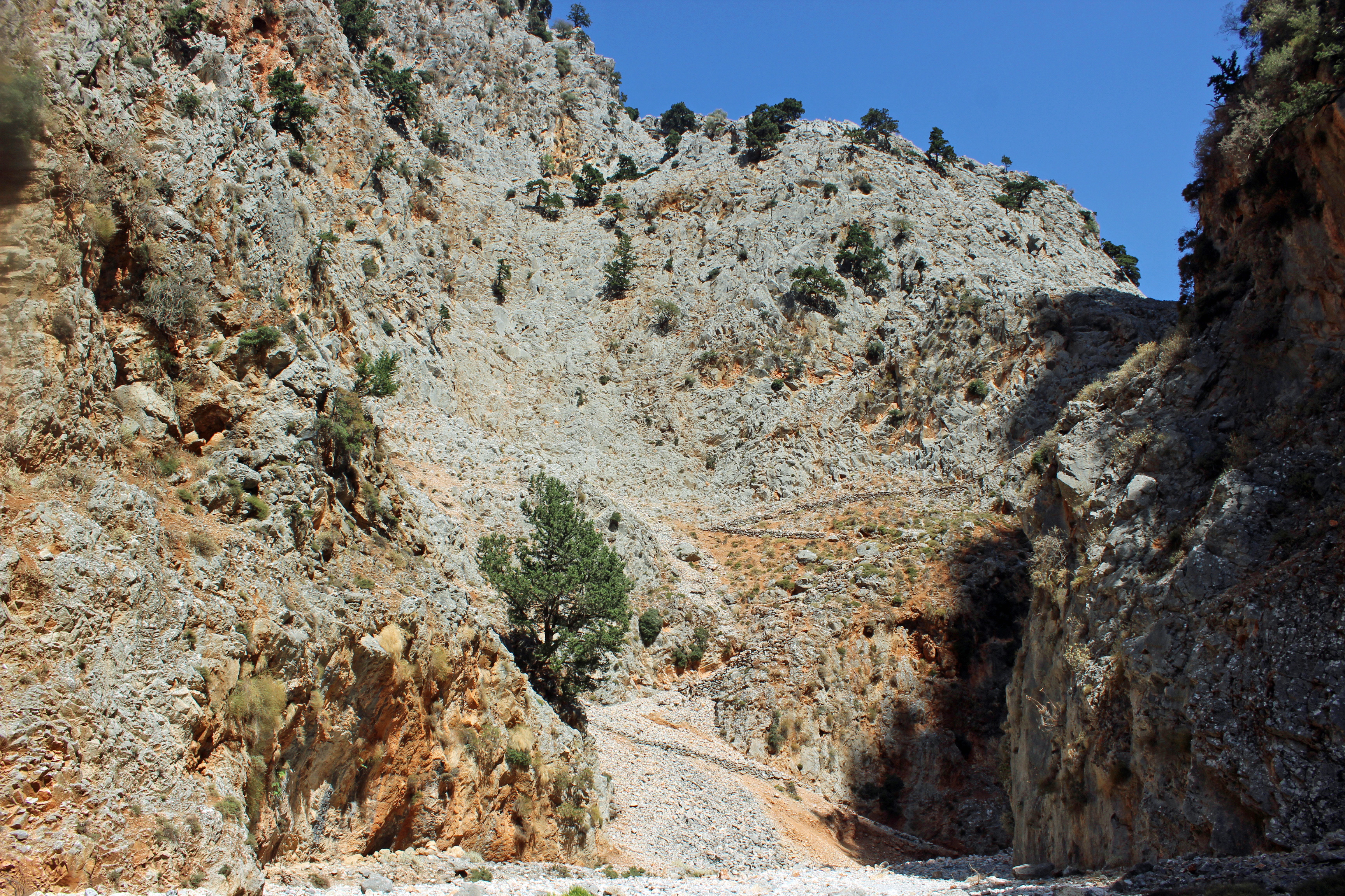 Après une autre demi-heure de marche (point n° 5 sur la carte), le sentier passe entre deux hautes tours rocheuses, en contrebas du village en ruines de Sterni (Στερνί) ; sur la gauche un sentier indistinct permet de monter au village de Livaniana. Le sentier continue ensuite, entre des parois hautes de plus de 150 m, sur un lit de graviers encombré de gros rochers, sur environ 1,4 km, jusqu’à la plage de Marmara (point n° 6 sur la carte). Si l’on a garé son véhicule près du village d’Aradaina, il est possible de remonter au point de départ, depuis la plage de Marmara, par un autre trajet. Emprunter le sentier de randonnée E4 en direction de Loutro ; après 300 m, quitter le sentier E4, sur la gauche, par un sentier en escalier qui monte en zigzag sur le plateau (point n° 7 sur la carte) ; rejoindre la petite route qui relie Aradaina à Finikas, via Livadiana, et monter à gauche en direction de Livadiana (point n° 8 sur la carte) ; on peut faire une halte à la taverne du village, avant de continuer à monter jusqu’à Aradaina ; il est possible de court-circuiter quelques virages en épingle à cheveux en suivant un sentier balisé en bleu. On rejoint la route de Chora Sfakion à Agios Ioannis environ 450 m avant le viaduc (point n° 9 sur la carte). | _small.jpg) _small.jpg) _small.jpg) _small.jpg) _small.jpg) _small.jpg) _small.jpg) | | Visite des gorges d’Aradaina : La randonnée des gorges d’Aradaina a une longueur de 5,5 km. Il faut compter 2 h 30 min de marche, sans les pauses, pour descendre les gorges ; 3 h 15 min dans le sens de la montée.