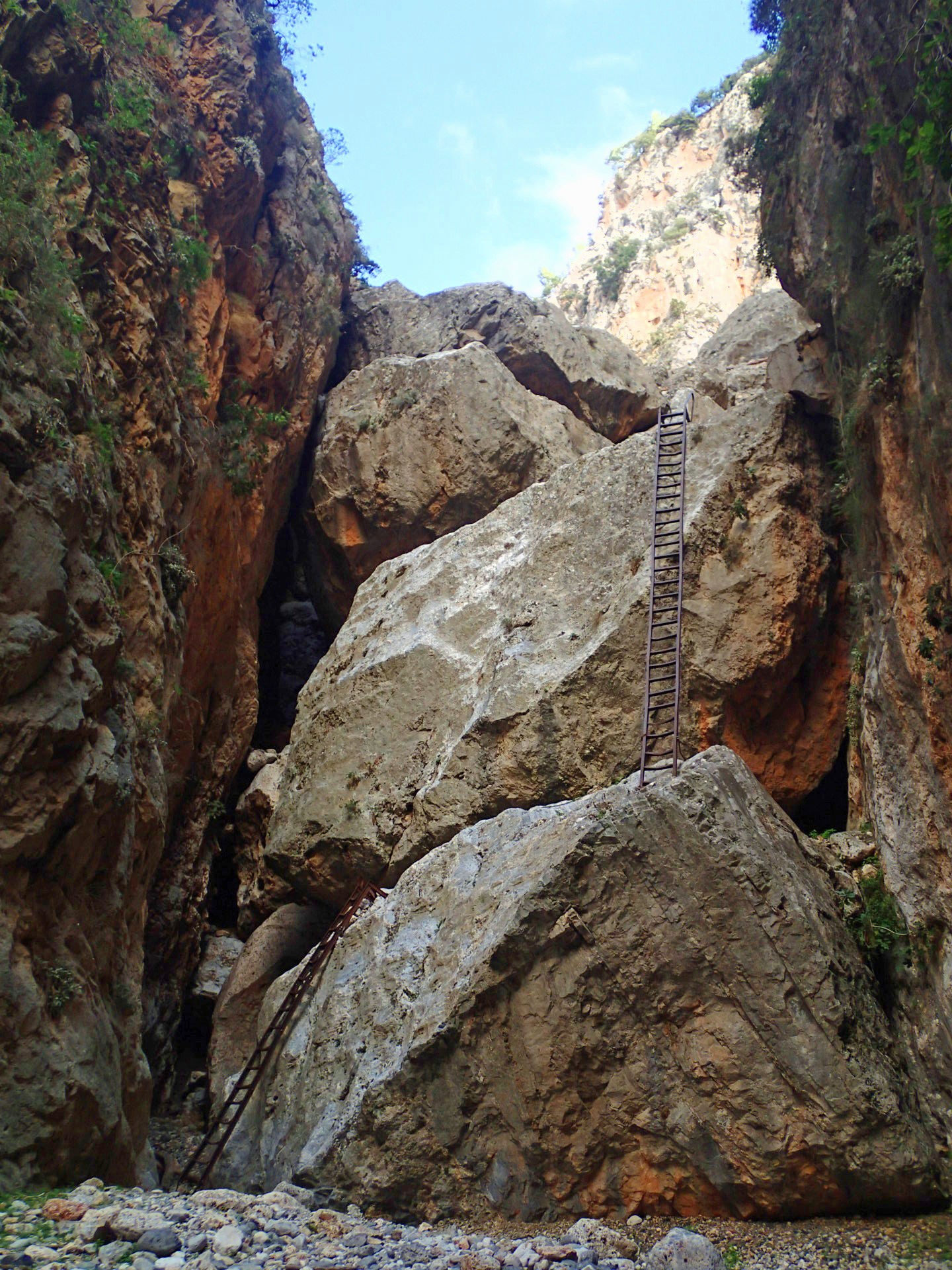 La randonnée des gorges d’Aradaina est balisée en rectangles de couleurs rouge et vert ; il est important d’être attentif à ce balisage, parfois déroutant, pour éviter les voies sans issue. Aller à l’entrée des gorges d’Aradaina avec Google Maps (35.225214, 24.065490). | _small.jpg) _small.jpg) _small.jpg) _small.jpg) _small.jpg) | | Le sentier des gorges d’Aradaina débute par une partie plate et en pente modérée, d’environ 800 m de longueur, sur la gauche du lit du ruisseau qui est généralement à sec ; cette section passe sous le viaduc d’Aradaina, situé 138 m plus haut. | _small.jpg) _small.jpg) _small.jpg) _small.jpg) _small.jpg) _small.jpg) _small.jpg) | Le sentier atteint ensuite un obstacle causé par deux énormes rochers qui ont obstrué le fond des gorges sur une dizaine de mètres (point n° 3 sur la carte). Jusqu’en 2019 il n’était possible de franchir cet obstacle qu’en escaladant des échelles métalliques fixées aux rochers. En 2019 un étroit sentier de contournement a été créé sur le versant occidental des gorges ; cet étroit sentier débute à droite, environ 100 m avant l’obstruction. Pour les amateurs d’émotions fortes, ou si le sentier de contournement est en trop mauvais état, les échelles sont toujours en place et permettent de franchir les rochers. Après l’obstacle, la pente du sentier augmente ; après une demi-heure de marche, la gorge s’élargit et on atteint un embranchement, sur la gauche, qui conduit vers le village d’Agios Ioannis. Ce sentier, qui traverse les gorges, provient du village de Livaniana, via le lieu-dit Azogyrès (Αζωγυρές) où se trouve la petite chapelle Agios Athanasios (Άγιος Αθανάσιος).