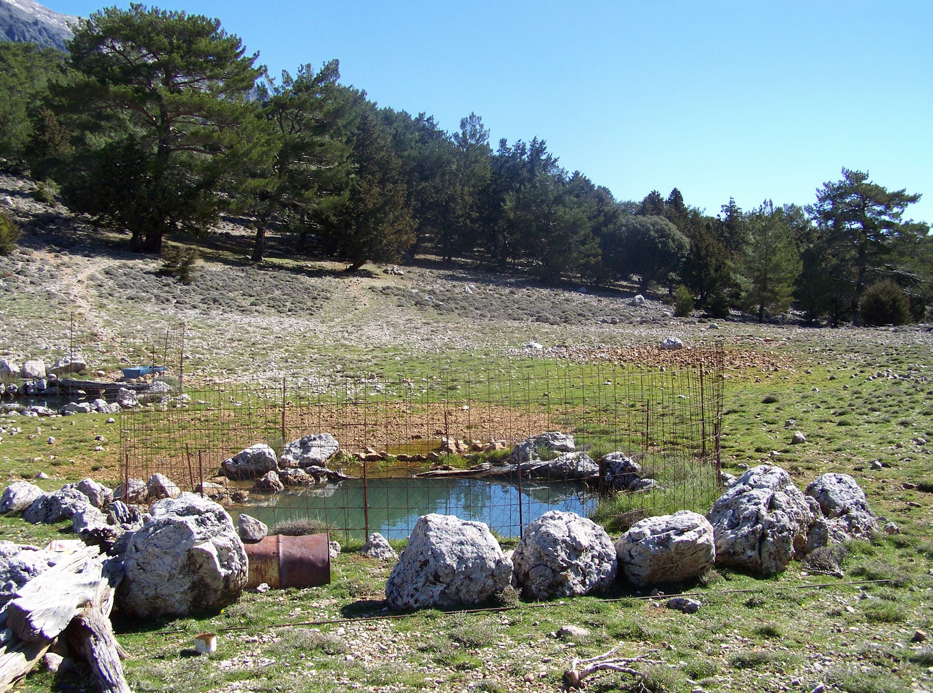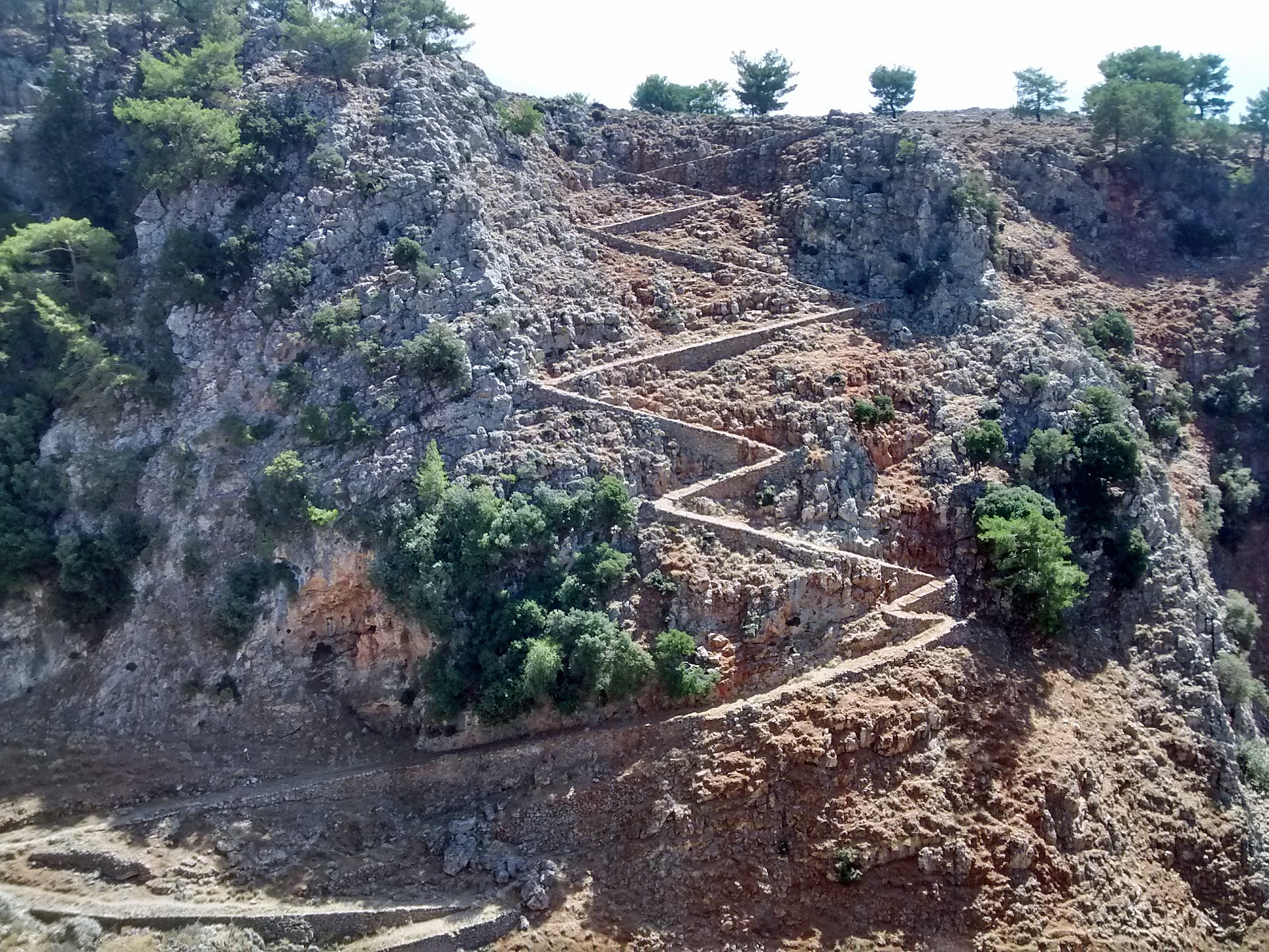Sinon, on peut se garer environ 700 m avant le viaduc et emprunter le sentier, à droite, qui conduit à la partie orientale du sentier muletier (point n° 2 sur la carte) pour descendre au fond des gorges. Le sentier muletier est construit, en zigzag, sur des murs de soutènement ; sa partie orientale est plutôt en meilleur état que sa partie occidentale du côté du village.