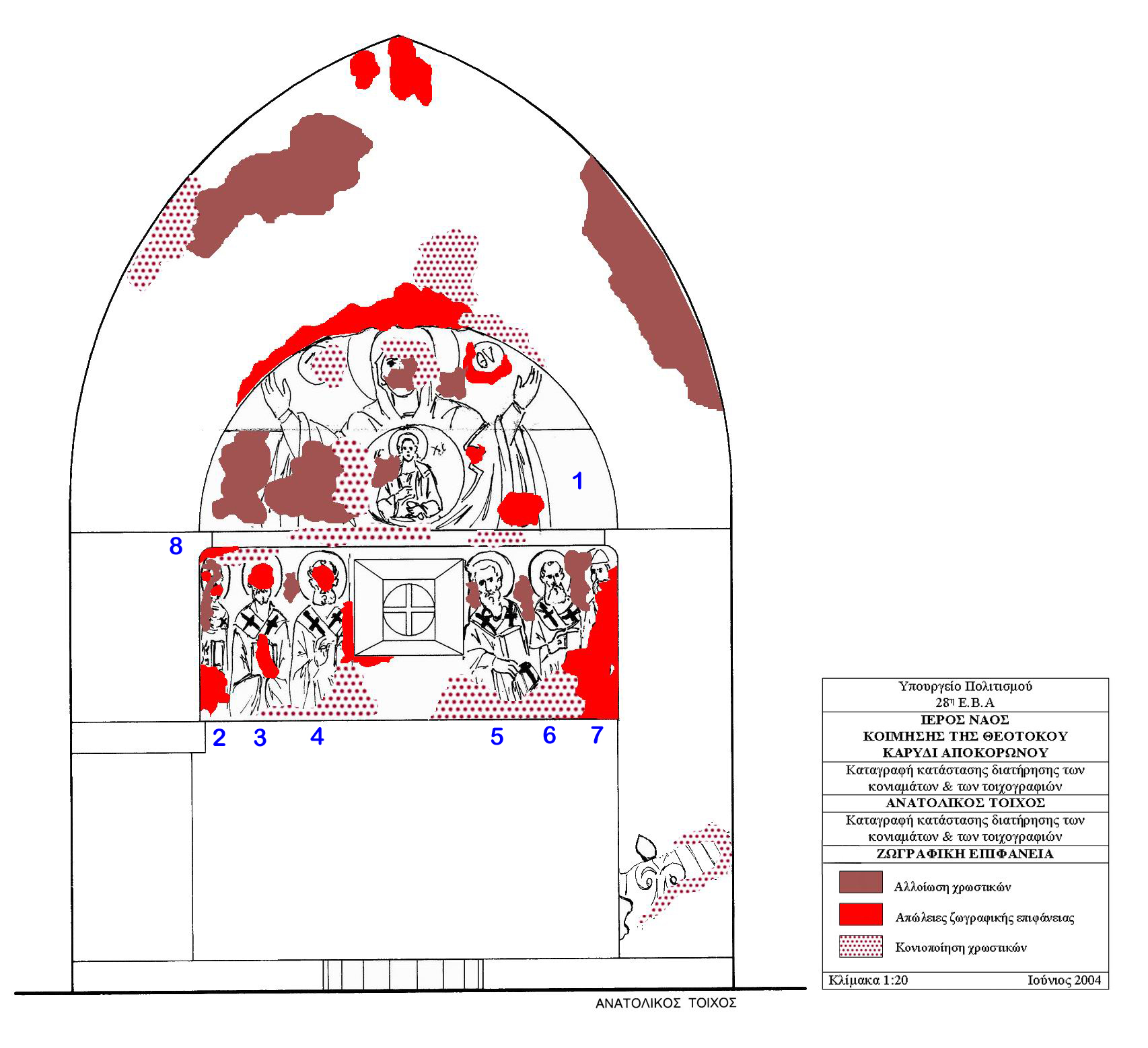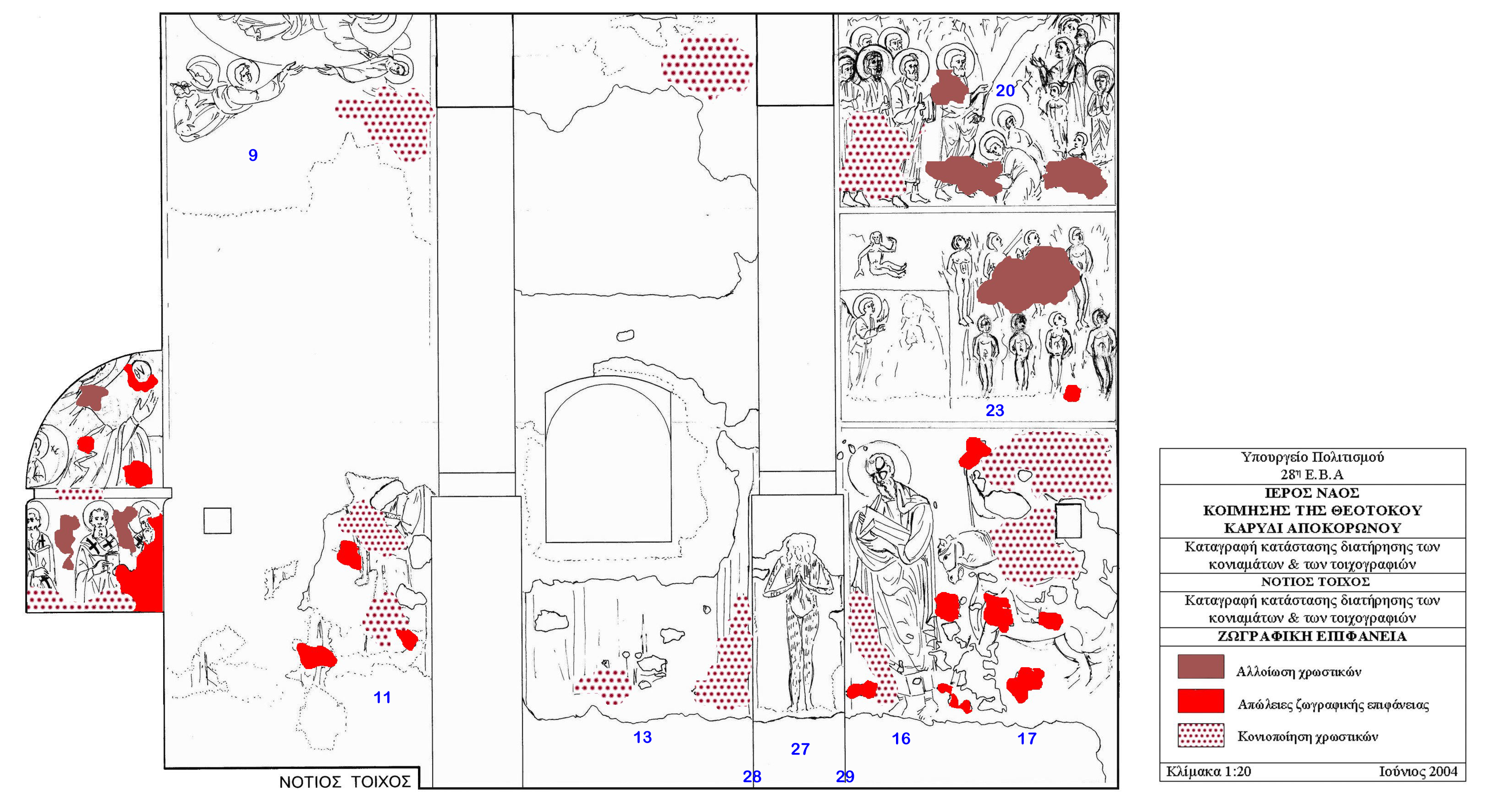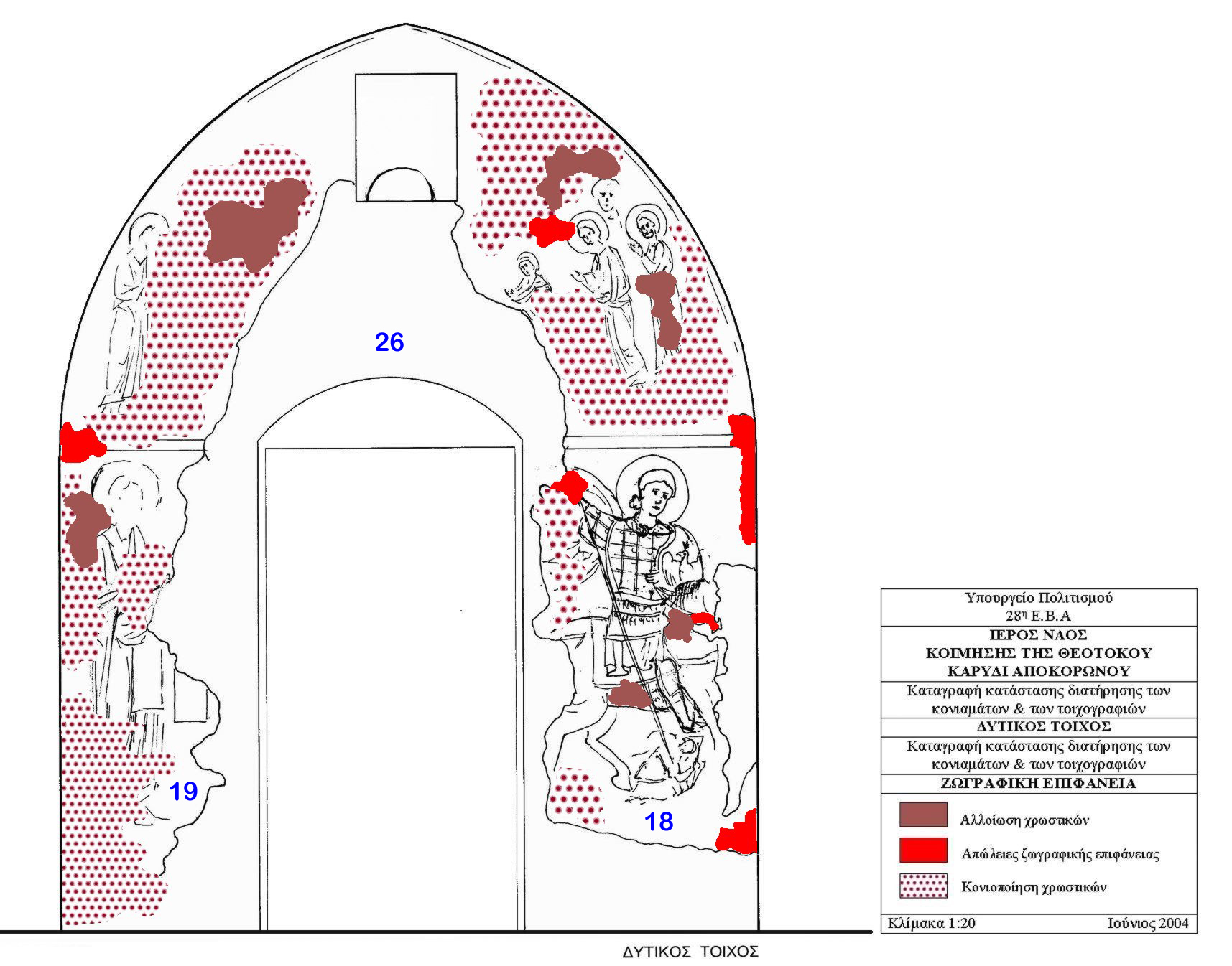 - n° 26 : fresque de « La Dormition de la Vierge Marie » (Κοίμηση της Θεοτόκου) ; cycle mariologique (Μαριολογικός κύκλος) ; la fresque est très effacée.