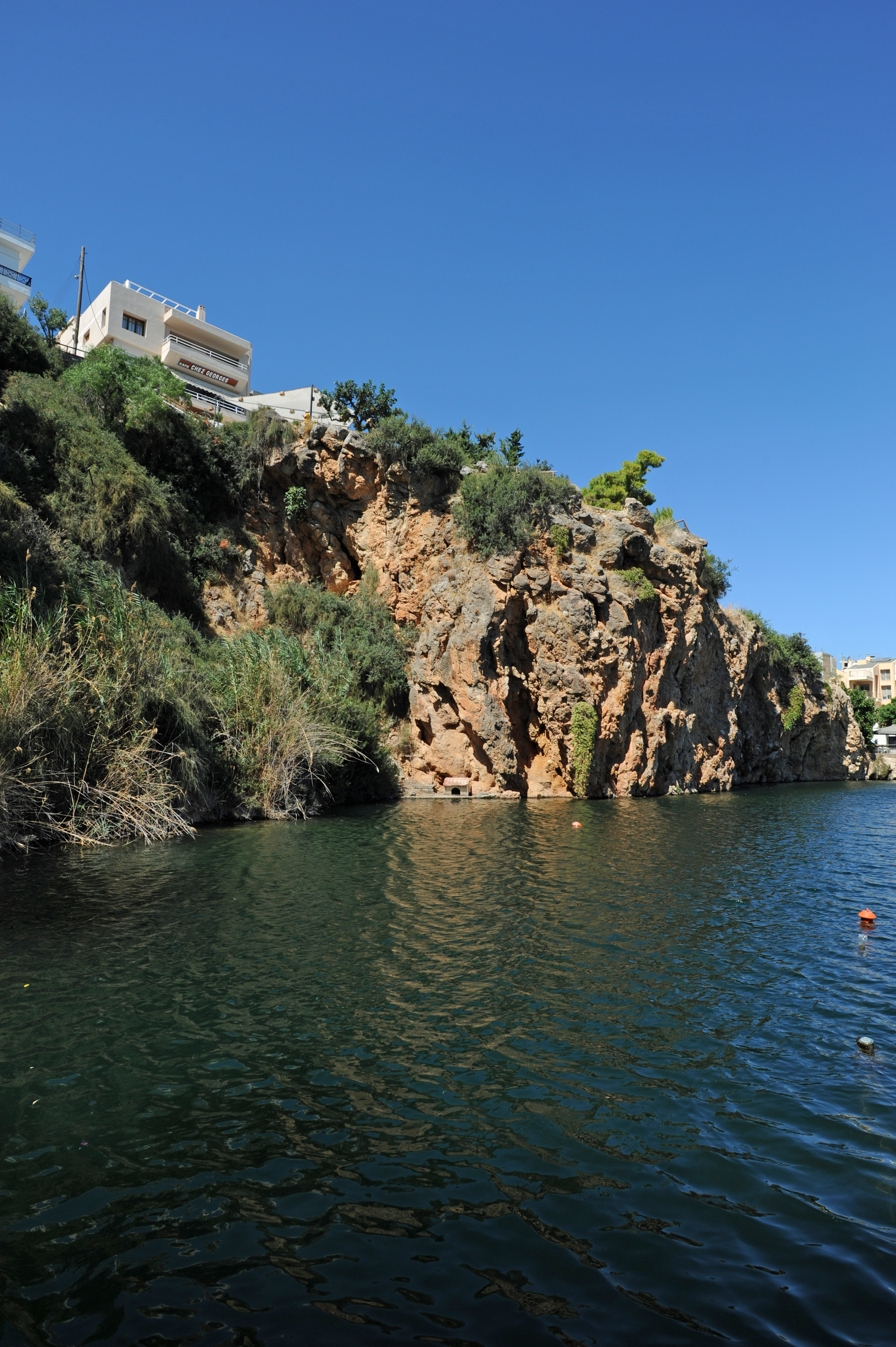 | Le lac Voulisméni (Λίμνη Βουλισμένη / Límni Voulisméni) | Le lac Voulisméni se trouve au cœur de la ville d’Agios Nikolaos, immédiatement à l’arrière du Vieux-Port (D4 sur le plan) ; c’est autour de cette étendue d’eau que la ville s’est développée principalement au cours du XIXe siècle, formant un quadrillage régulier d’avenues et de rues. Le lac Voulisméni a une forme presque circulaire et un diamètre maximal de 137 m ; sur le côté ouest et sur le côté nord, le lac est bordé de falaises qui atteignent une hauteur maximale de 25 m. En septembre 2000, le département de géologie de l’Université d’Athènes a mené une étude sous-marine détaillée du lac et a déterminé que sa profondeur maximale était de 48,8 m. Quant à la croyance populaire, elle affirme que le lac serait « sans fond ». Dans le même ordre d’idées la déesse de la chasse, Artémis, ou la déesse Athéna, s’y seraient baignées et le lac est parfois surnommé le « bassin d’Artémis » ou le « bain d’Athéna ». Les habitants nomment le lac Voulisméni simplement « le lac » (« Λίμνη »).