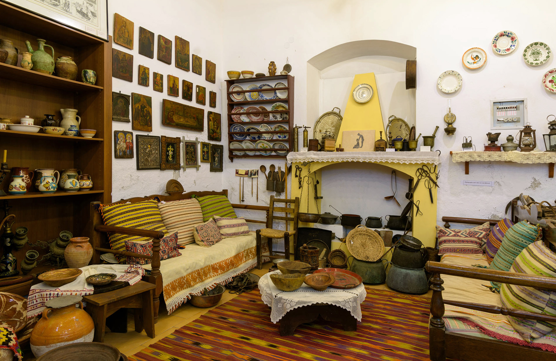 | Le musée ethnographique (Λαογραφικό Μουσείο / Laografikó Mouseío) | Le musée ethnographique d’Agios Nikolaos a été créé en 1985 par l’Association culturelle de la Crète orientale. Ce musée des Arts et Traditions populaires se trouve juste après le pont qui relie le Vieux-Port au lac Voulisméni, à côté de l’Office de Tourisme (D4 sur le plan) ; le musée occupe une vaste salle au rez-de-chaussée d’un des plus vieux bâtiments de la ville.Ce petit musée « laographique » offre un bon aperçu de la vie traditionnelle crétoise à Agios Nikolaos avant que la localité ne devienne une station touristique à la mode. On peut y voir de remarquables exemples de l’artisanat local, tels que des textiles, des tissages et des broderies aux motifs originaux, ainsi que des tapis tel que le kilim (κιλίμι), c’est-à-dire un tapis tissé, provenant de Kritsa et datant du XVIIe siècle. Le musée abrite aussi une reproduction de l’intérieur d’une maison crétoise traditionnelle, équipée d’objets ménagers et d’ustensiles de cuisine : des livres, de vieux manuscrits découverts dans les environs, de nombreuses photographies anciennes, des peintures, des icônes, des instruments de musique, des armes datant de l’époque de l’occupation ottomane, des pièces de monnaie, des bijoux, des tapis tissés multicolores, un métier à tisser, des exemples de costumes traditionnels, certains vieux de 300 ans, et des vêtements de cérémonie. C’est un régal pour les yeux mais il y a assez peu d’explications.