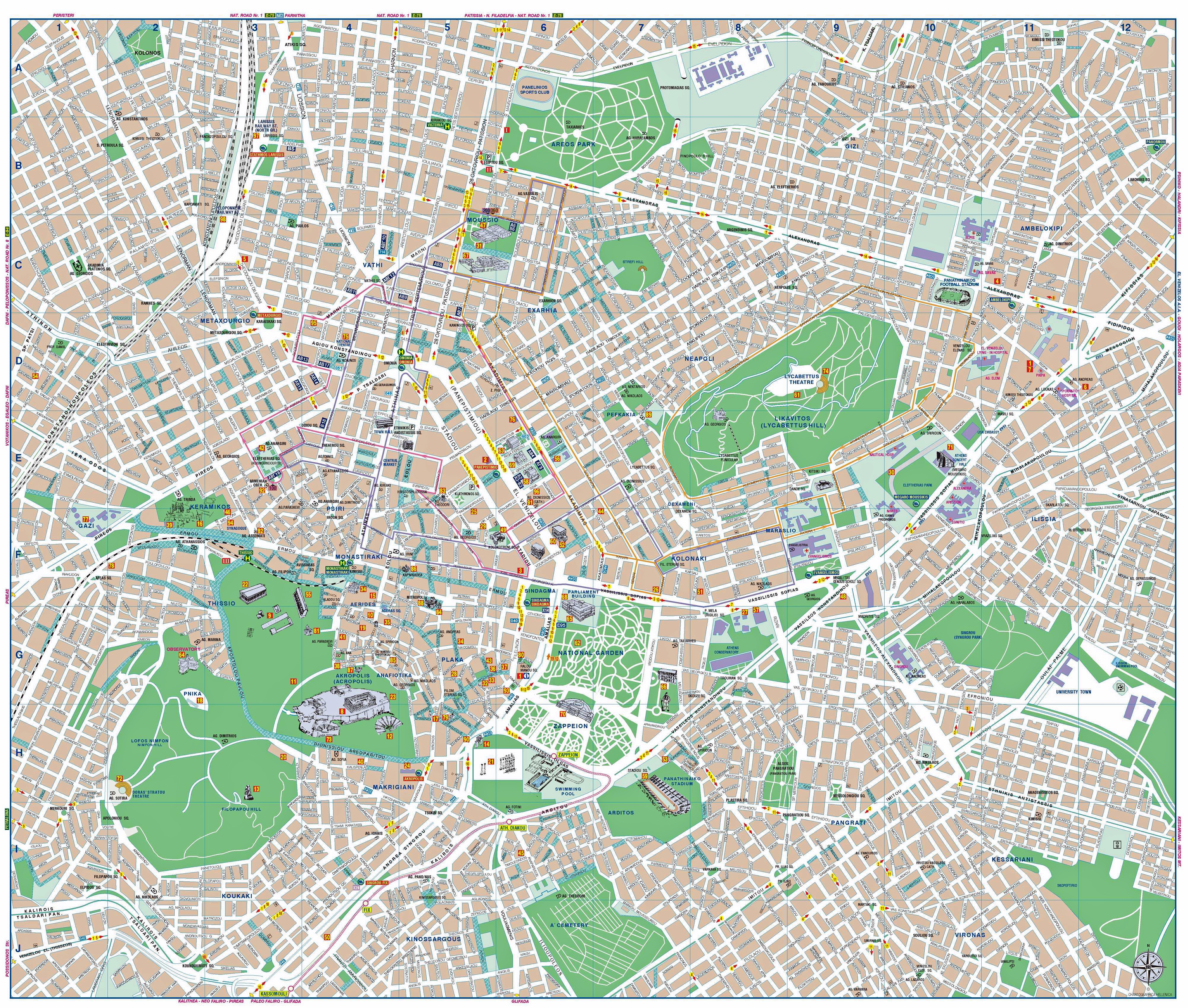 61 : Mont Lycabette. 62 : Jardin national. 63 : Bibliothèque nationale. 64 : Observatoire. 65 : Parlement hellénique. 66 : Palais présidentiel. 67 : Université technique (NTUA). 68 : Tombe du soldat inconnu. 69 : Université. 70 : Zappéion.