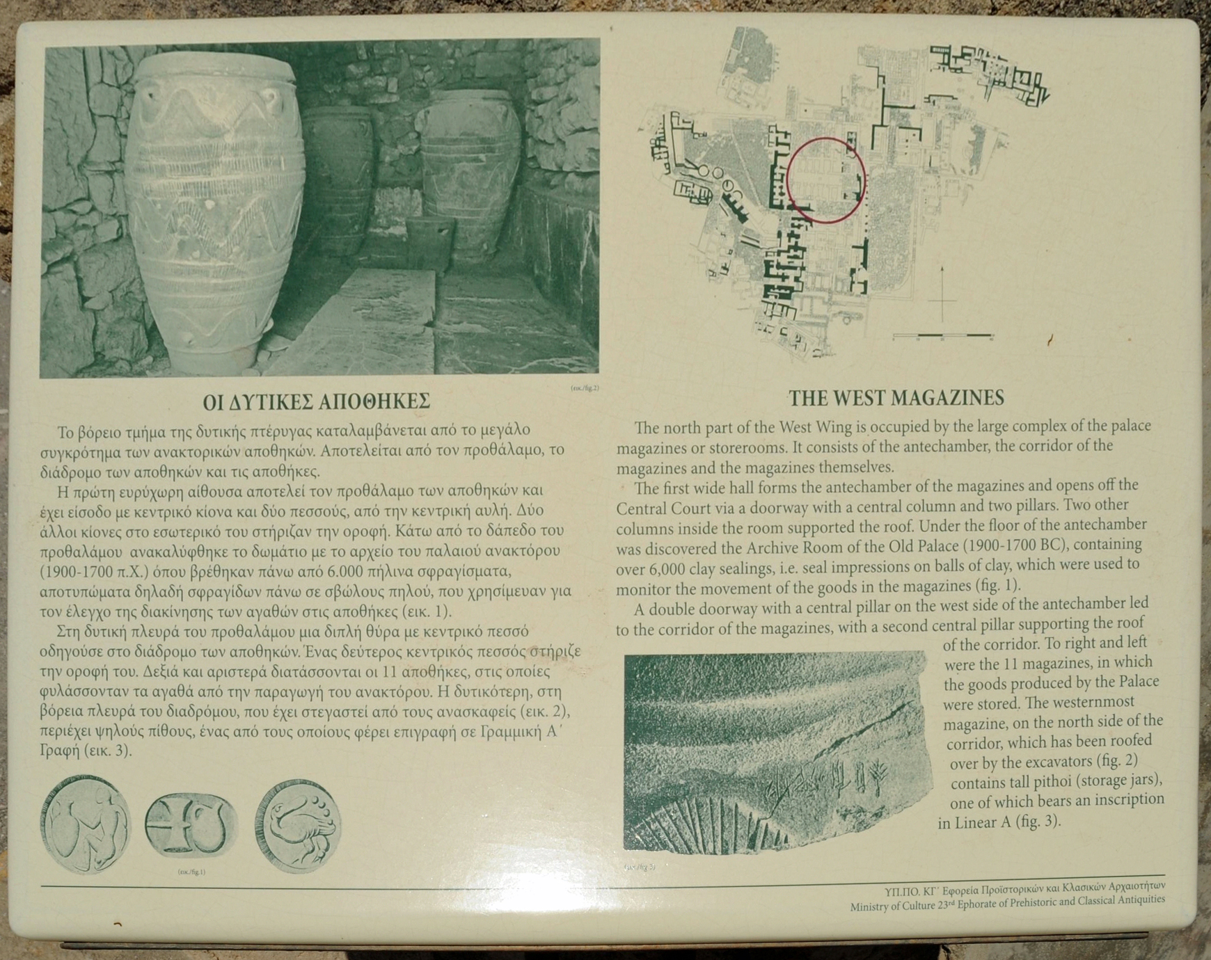 Le magasin le plus à l’ouest, du côté nord du couloir contient de hauts pithoi ; un pithos porte une inscription en écriture linéaire A (figure 3 du panneau) ; ce magasin, qui a un sol pavé et une base murale recouverte d’albâtre, a été couvert et fermé par une grille par les fouilleurs (figure 2 du panneau) (n° 33 sur le plan B).