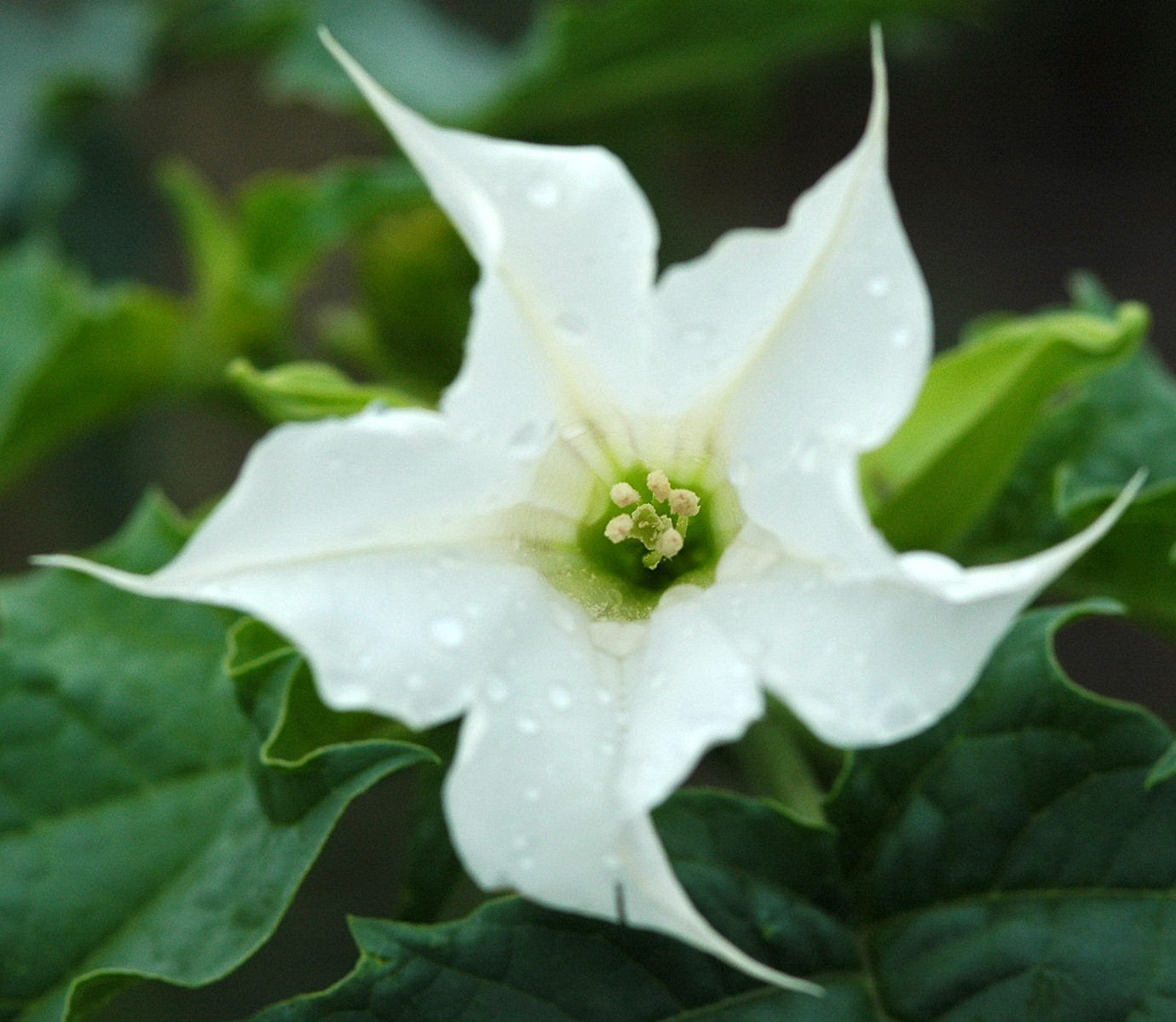 | Nom commun : datura stramoine, datura commun | Nom populaire : stramoine, herbe à la taupe, pomme épineuse, herbe aux sorciers, endormeuse. |