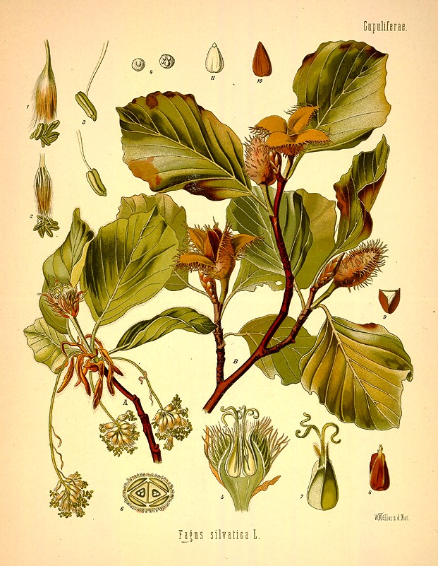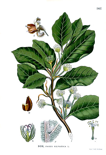 | Étymologie latine | Fagus silvatica :fagus, i f. : « hêtre ». Étymologie : indo-européen ; du mot grec phagô, je mange ; fruits qui peuvent se manger. cf. dorien phāgós, ionien-attique phēgós « sorte de chêne » (le hêtre n’existe pas en Grèce). |