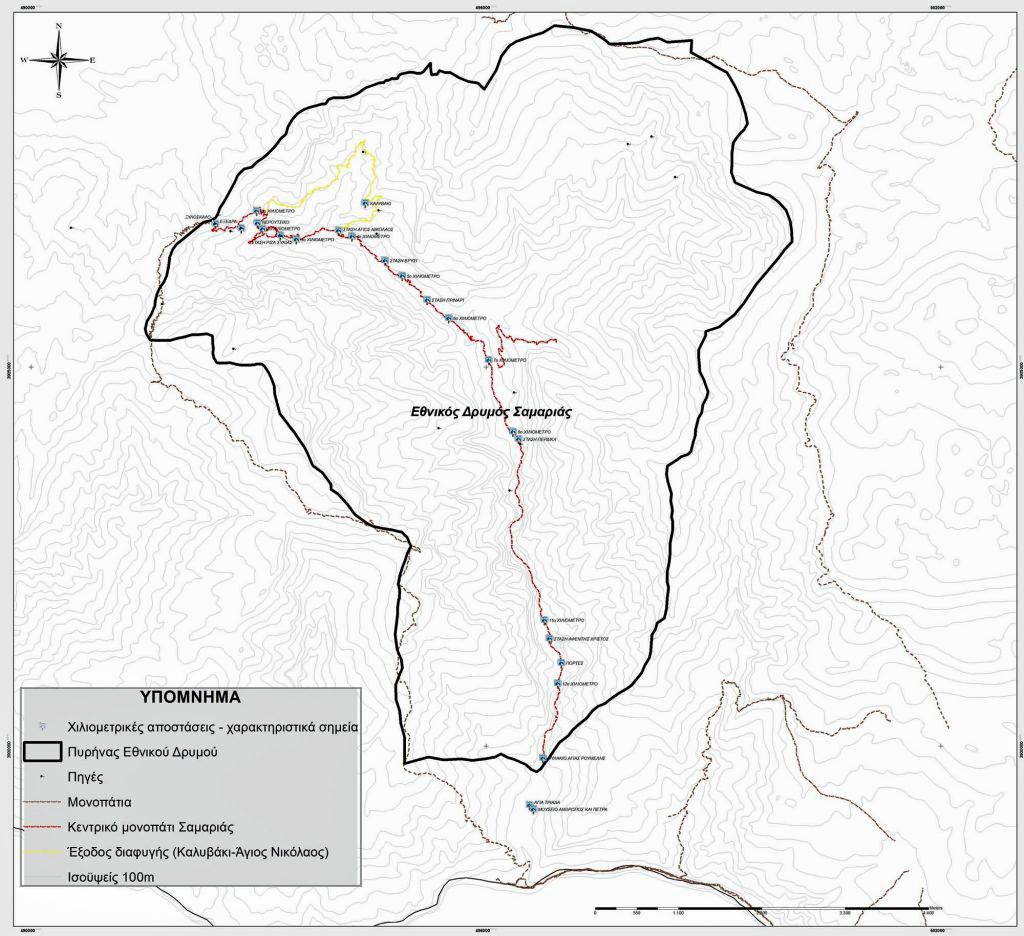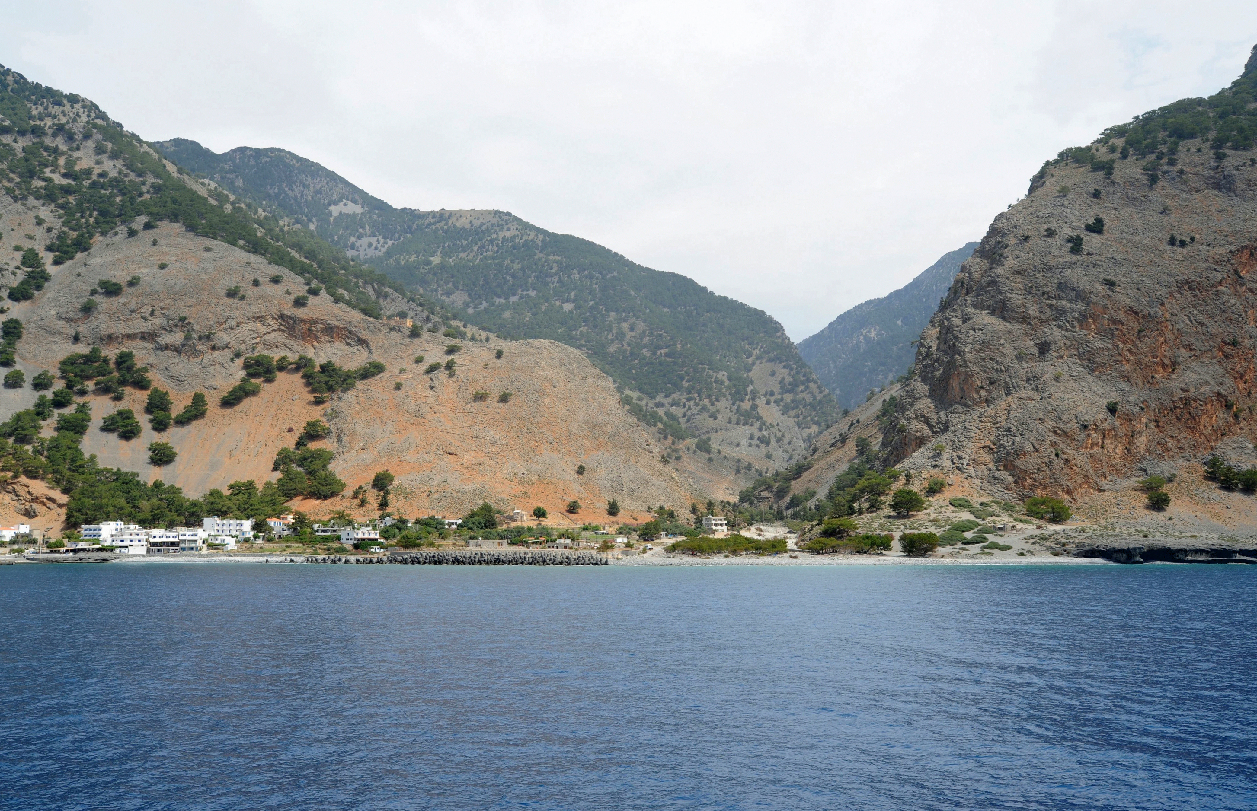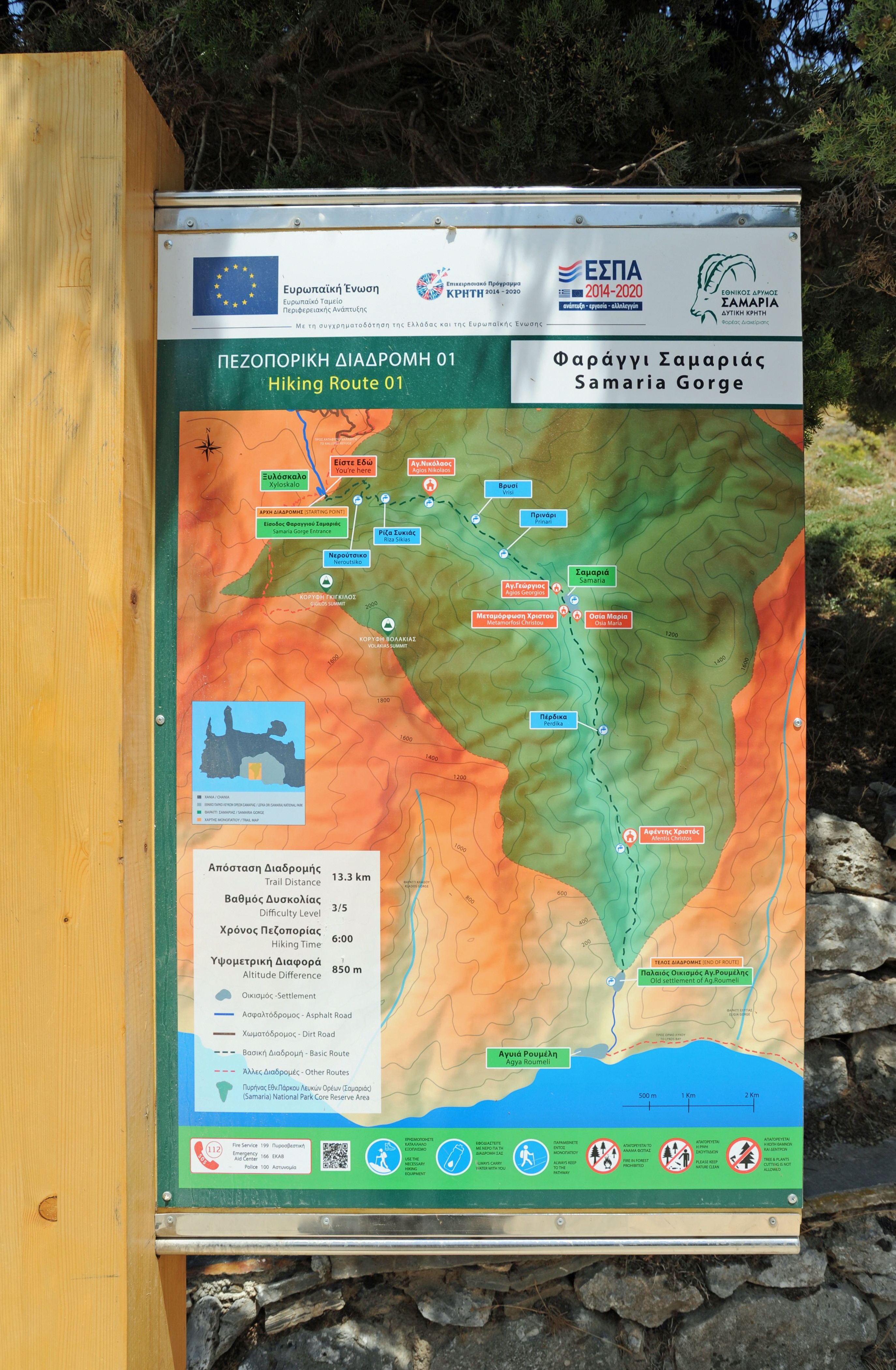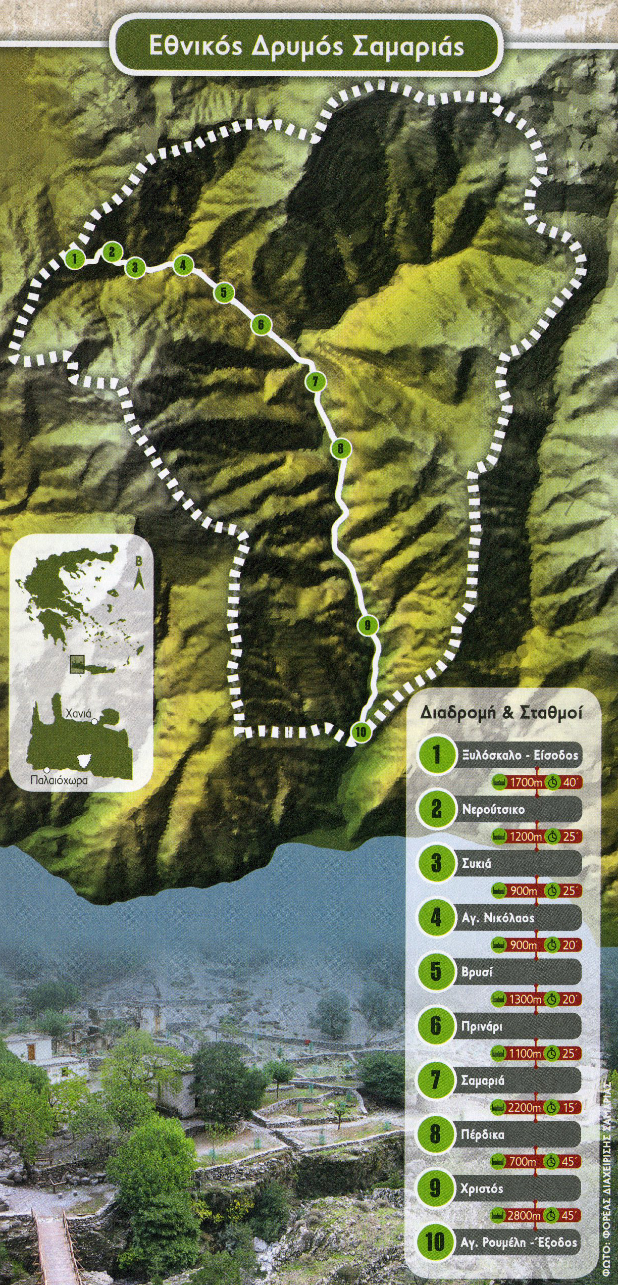 Aller à l’entrée des gorges de Samaria avec Google Maps (35.307913, 23.918334). L’entrée des gorges de Samaria se trouve entre de hautes montagnes du massif des Montagnes Blanches : au sud-ouest, sur la rive droite des gorges, le mont Gingilos ou Gkigkilos (Γκίγκιλος) (≈ 2 080 m) et le mont Volakias (Βόλακιας) (≈ 2 117 m) ; au nord-est, sur la rive gauche, le mont Koukoule (Κουκουλέ) (1 632 m) et le mont Melindaou (Μελιντάου) (≈ 2 133 m). Les gorges de Samaria sont en réalité un ensemble de gorges dont les plus importantes confluent un peu en amont de l’ancien village de Samaria ; toutes ces gorges ont été creusées par des torrents drainant les versants orientaux ou occidentaux des montagnes voisines. Depuis 14 millions d’années, ces torrents ont creusé des tranchées dans la nappe de calcaire en plaques formant le cœur des Montagnes Blanches ; à certains endroits, comme au mont Gingilos, le torrent a aussi dû creuser la nappe de phyllites-quartzites subsistant au-dessus de la nappe de calcaire en plaques. En aval du village abandonné de Samaria, le cours d’eau est parfois nommé « rivière de Tarrhios », du nom de la cité antique de Tarrha qui se trouvait à l’embouchure des gorges, près du village présent d’Agia Rouméli. La rivière coule toute l’année ; en été, le torrent impétueux de l’hiver se transforme en un paisible filet d’eau ; son débit est renforcé par 22 sources qui s’égrènent le long des gorges. Dans le passé, la rivière était utilisée, par les bûcherons de Samaria, pour le flottage du bois jusqu’au port d’Agia Rouméli ; la rivière était aussi utilisée pour actionner des moulins hydrauliques.