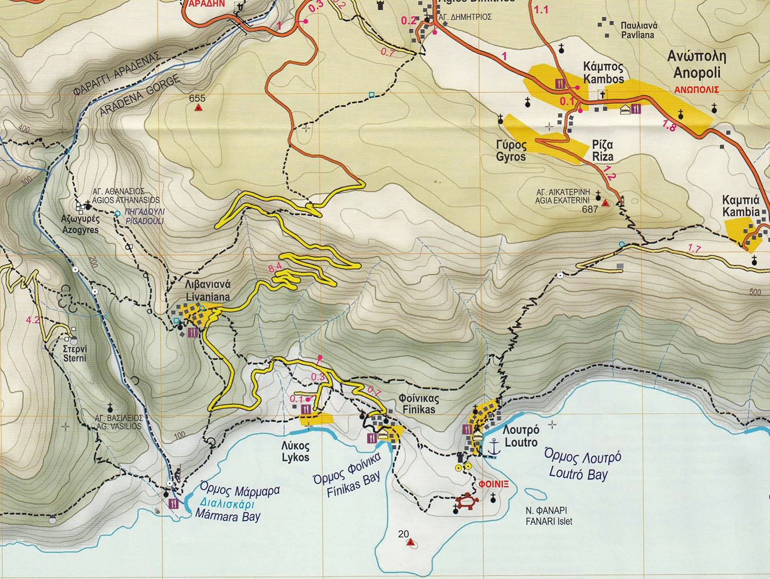 Après une autre demi-heure de marche (point n° 5 sur la carte), le sentier passe entre deux hautes tours rocheuses, en contrebas du village en ruines de Sterni (Στερνί) ; sur la gauche un sentier indistinct permet de monter au village de Livaniana. Le sentier continue ensuite, entre des parois hautes de plus de 150 m, sur un lit de graviers encombré de gros rochers, sur environ 1,4 km, jusqu’à la plage de Marmara (point n° 6 sur la carte). Si l’on a garé son véhicule près du village d’Aradaina, il est possible de remonter au point de départ, depuis la plage de Marmara, par un autre trajet. Emprunter le sentier de randonnée E4 en direction de Loutro ; après 300 m, quitter le sentier E4, sur la gauche, par un sentier en escalier qui monte en zigzag sur le plateau (point n° 7 sur la carte) ; rejoindre la petite route qui relie Aradaina à Finikas, via Livadiana, et monter à gauche en direction de Livadiana (point n° 8 sur la carte) ; on peut faire une halte à la taverne du village, avant de continuer à monter jusqu’à Aradaina ; il est possible de court-circuiter quelques virages en épingle à cheveux en suivant un sentier balisé en bleu. On rejoint la route de Chora Sfakion à Agios Ioannis environ 450 m avant le viaduc (point n° 9 sur la carte). | _small.jpg) | | Visite des gorges d’Aradaina : La randonnée des gorges d’Aradaina a une longueur de 5,5 km. Il faut compter 2 h 30 min de marche, sans les pauses, pour descendre les gorges ; 3 h 15 min dans le sens de la montée.