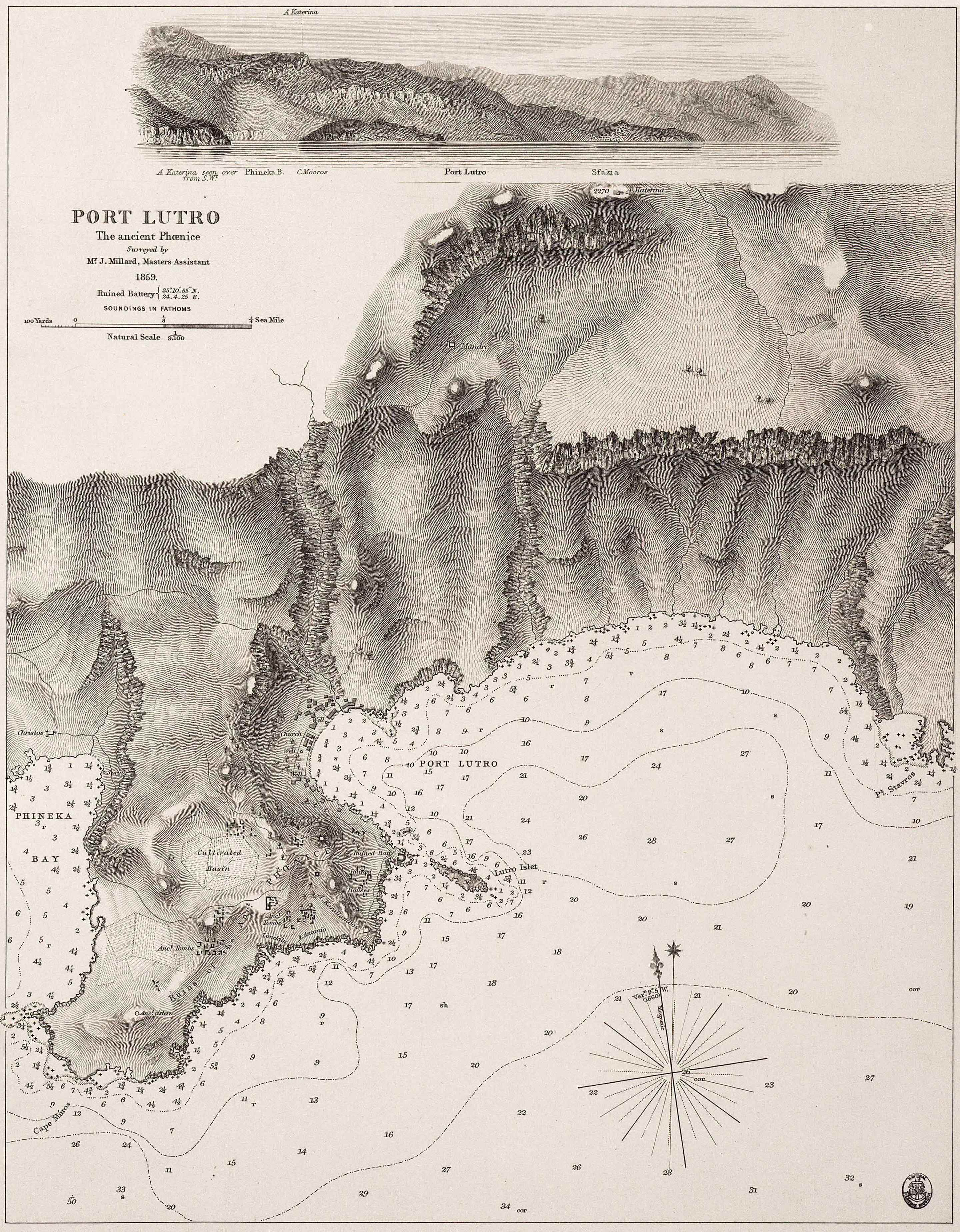 | Le village de Loutro (Λουτρό / Loutró) | Loutro est un petit port de la côte sud-ouest de la Crète, dans la région des Sfakia, qui fut autrefois un port marchand et un port de pêche plutôt important, en tant que port de l’ancien chef-lieu de la contrée, le bourg d’Anopoli, ainsi que celui du village d’Aradaina. Depuis les années 1970 Loutro est devenu principalement une petite station balnéaire, qui a la particularité ne n’être pas reliée par la route au reste de l’île ; les vacanciers accèdent à Loutro par les nombreux transbordeurs qui relient le port à Chora Sfakion et à d’autres ports de la côte sud-ouest.Le toponyme « λουτρό, au pluriel λουτρά » signifie « bain » car la localité possédait, dans l’Antiquité, des thermes alimentés par une source dont l’eau était acheminée depuis le village d’Anopolis ; le toponyme Loutro ou Loutra est plutôt commun en Crète et l’on peut préciser Loutro des Sfakia (Λουτρού Σφακίων). Le nom officiel de la localité est Loutron (Λουτρόν) qui a la même signification en grec ancien. Les vestiges des bains sont encore visibles de nos jours. Le port de Loutro est un port naturel niché au fond d’une baie, la baie de Loutro (όρμος Λουτρό), délimitée à l’ouest par le cap Mouri (ακρωτήριο Μουρί) et à l’est par le cap Pounta ou cap Pounda (άκρα Πούντα) ; la baie atteint une profondeur de près de 30 brasses au milieu et de 4 brasses à l’endroit de l’embarcadère du port, soit près de 4 m ; cette profondeur devait être encore plus grande, d’environ 2 brasses, dans l’Antiquité car la côte s’est rehaussée de cette hauteur depuis cette époque. Dans le sud-ouest de la baie, le port est protégé de la houle par un îlot nommé Fanari (νησίδα Φανάρι), c’est-à-dire « la lanterne, le fanal ».