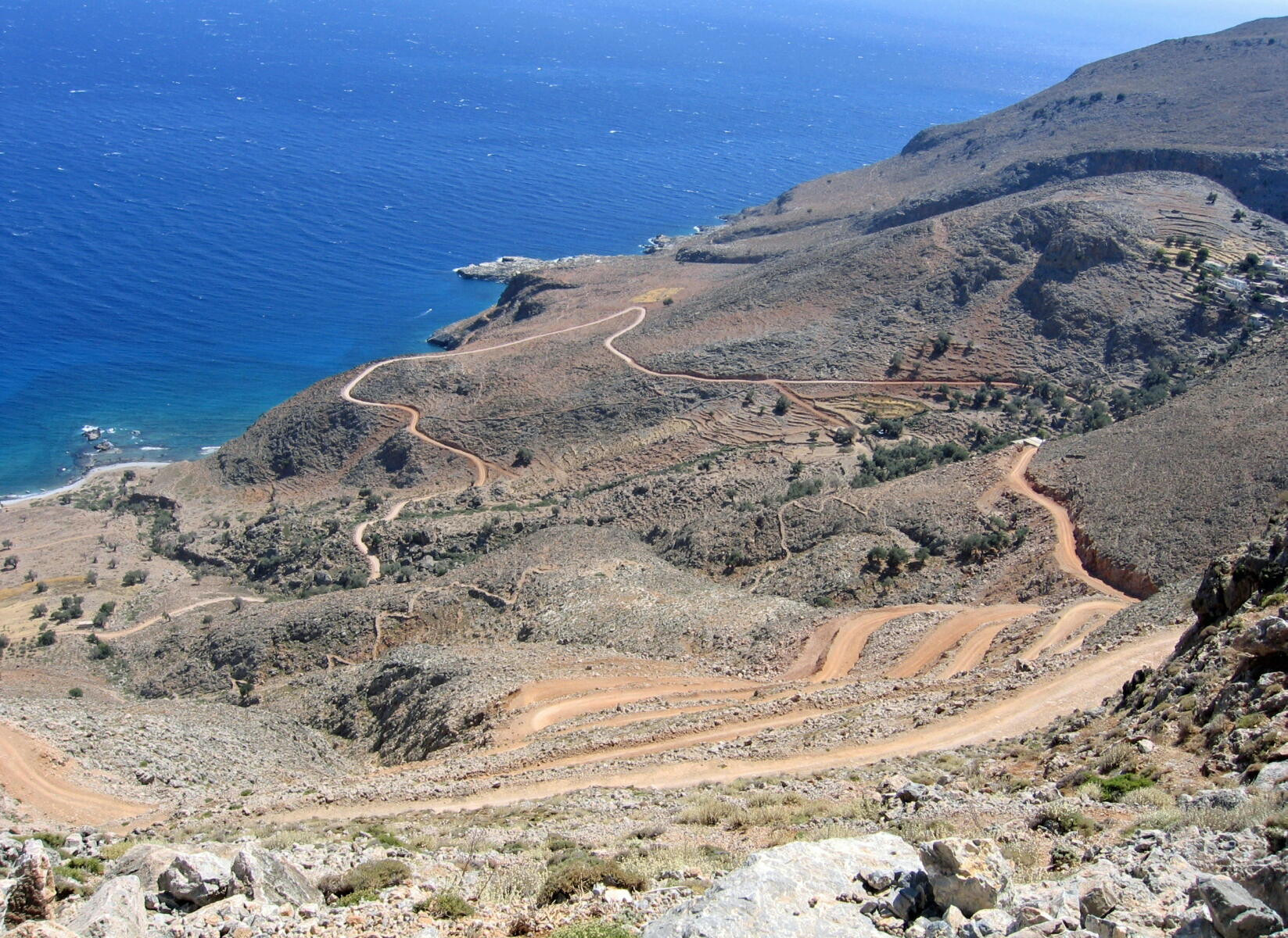 | Sur la route de Chora Sfakion à Agios Ioannis | | La route reliant Chora Sfakion à Agios Ioannis serait un tronçon d’une hypothétique route provinciale 31 (Επαρχιακή Οδός 31), censée relier Rodovani (Ροδοβάνι) de Sougia à Skaloti (Σκαλωτή), près de la bordure avec la province de Réthymnon ; entre Sougia et Agios Ioannis cette route provinciale n’a jamais été construite. Les transports depuis Chora Sfakion vers Sougia et l’extrême ouest de la Crète se font encore par mer, avec les transbordeurs de la compagnie Anendyk. À partir de Chora Sfakion la route provinciale suit la côte en direction de l’ouest, puis elle doit remonter la rive gauche des gorges d’Ilingas pour franchir le lit de la rivière Kavis par un pont moderne en béton ; la route redescend vers la côte qu’elle suit jusqu’à un virage en épingle à cheveux d’où part un sentier qui conduit à la plage la plus renommée des Sfakia, la plage de Glyka Néra. La route provinciale débute ensuite la montée, de 600 m de dénivelé, vers le plateau d’Anopoli, par une vingtaine d’impressionnants virages en épingle à cheveux, et sans beaucoup de glissières de sécurité ; la route atteint le plateau d’Anopoli qui apparaît, dans ce paysage aride, comme une oasis couverte d’oliviers et de cultures ; à l’arrière-plan apparaissent les versants boisés des Monts Blancs culminant au mont Pachnès, à 2 453 m ; on peut faire une pause dans une des tavernes d’Anopoli ou dans sa fameuse boulangerie. Après le village d’Anopoli, qui s’étire sur une longueur de 3 km, la route atteint les gorges d’Aradaina, que la route franchit par un viaduc métallique construit en 1986. Après le franchissement des gorges, la route provinciale arrive immédiatement au village d’Aradaina, un village abandonné mais qui mérite cependant une visite. Après le village d’Aradaina la route traverse les vestiges d’une importante forêt de cyprès et de pins qui fut le poumon économique de la contrée. Le village d’Agios Ioannis se trouve au cœur de cette forêt ; la localité est – provisoirement, depuis les années 1950 – le cul-de-sac de la route provinciale 31. | _small.jpg) |