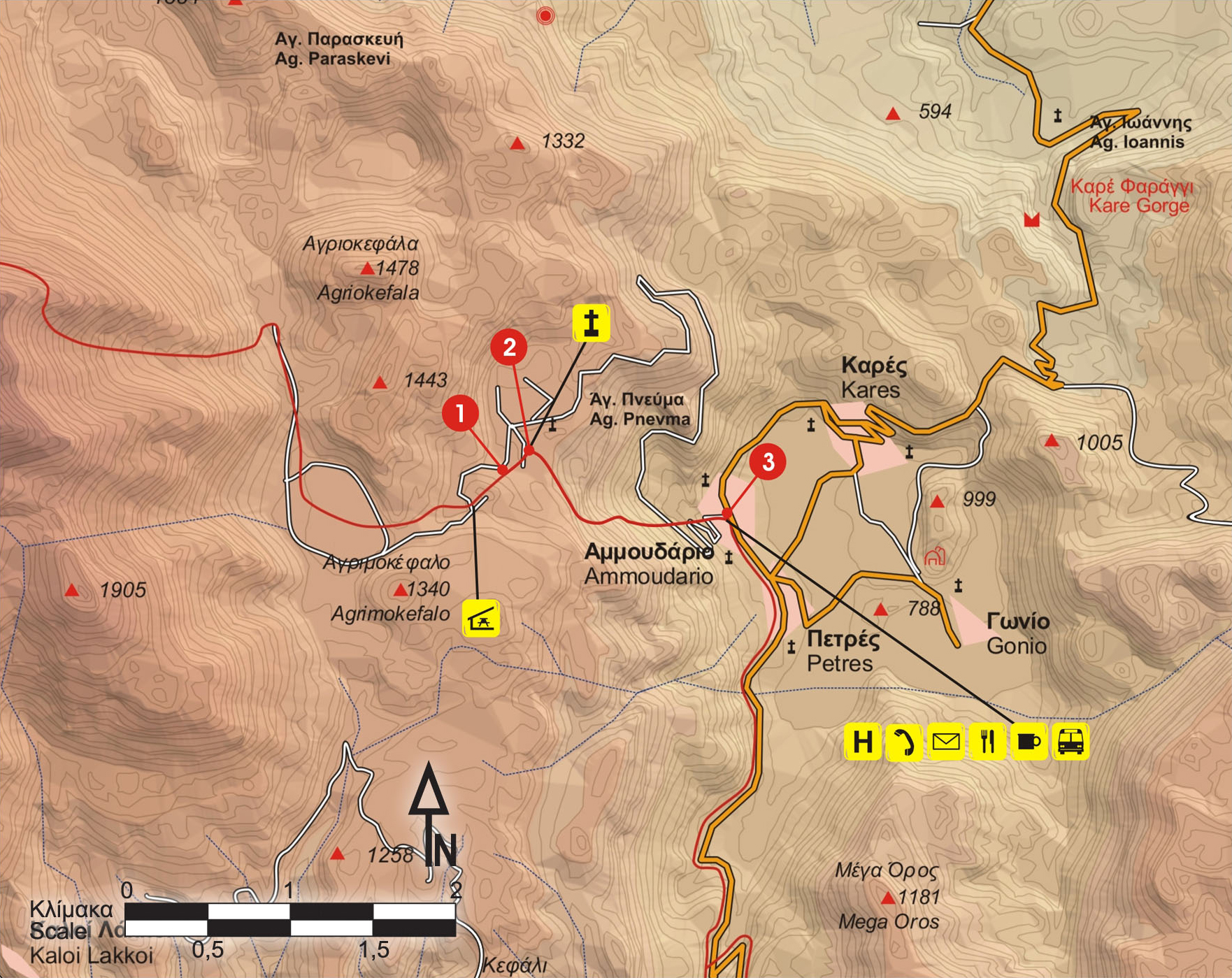 | Le village d’Ammoudari (Αμμουδάρι / Ammoudári) | Le village d’Ammoudari est le chef-lieu de la communauté locale de l’Askyfou (Κοινότητα Ασκύφου) qui comprend l’ensemble des localités du plateau d’Askyfou, avec une population totale qui ne dépasse pas 400 habitants. Le nom officiel du village est Ammoudarion (Αμμουδάριον), mais il est souvent nommé du nom du plateau, Askyfou ou Askifou. À environ 750 m au sud d’Ammoudari se trouve le village de Pétrès, dont le toponyme, très commun, signifie « les Pierres » (πετρές, pluriel de πέτρα) ; un autre village nommé Pétrès se trouve dans la province de La Canée, près de Kolymvari. |