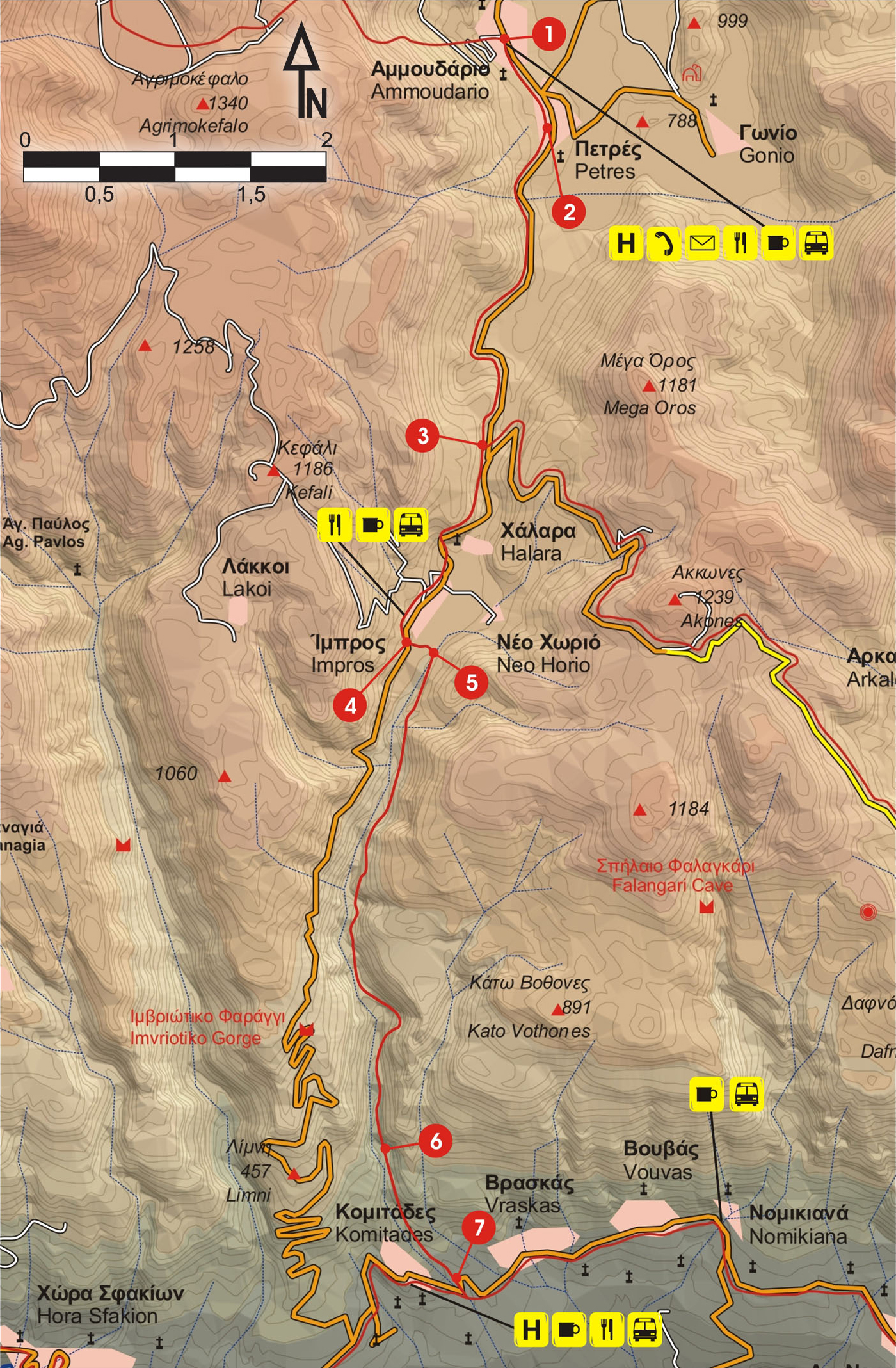 Après le plateau d’Askyfou la route provinciale remonte jusqu’au second point culminant de l’itinéraire, à environ 820 m d’altitude ; depuis ce col, la route provinciale 55 part sur la gauche en direction d’Asfendos (Άσφενδος) et de Kallikratis (Καλλικράτης). La route provinciale 54 continue tout droit et commence de descendre vers la côte sud ; la route atteint le village d’Imbros puis longe, en surplomb, la rive droite des gorges d’Imbros ; 3 km après le village d’Impros, la route passe sous deux tunnels ; l’ancienne route a été préservée et constitue deux belvédères qui offrent de belles vues sur les gorges d’Imbros, sur la côte sud et sur la mer de Lybie. Une descente vertigineuse débute ensuite par une série de virages en épingles à cheveux, de près de 500 m de dénivelé, jusqu’à la sortie des gorges d’Imbros, près de Komitadès (Κομιτάδες). La route provinciale s’oriente alors vers l’ouest en direction de Chora Sfakion.