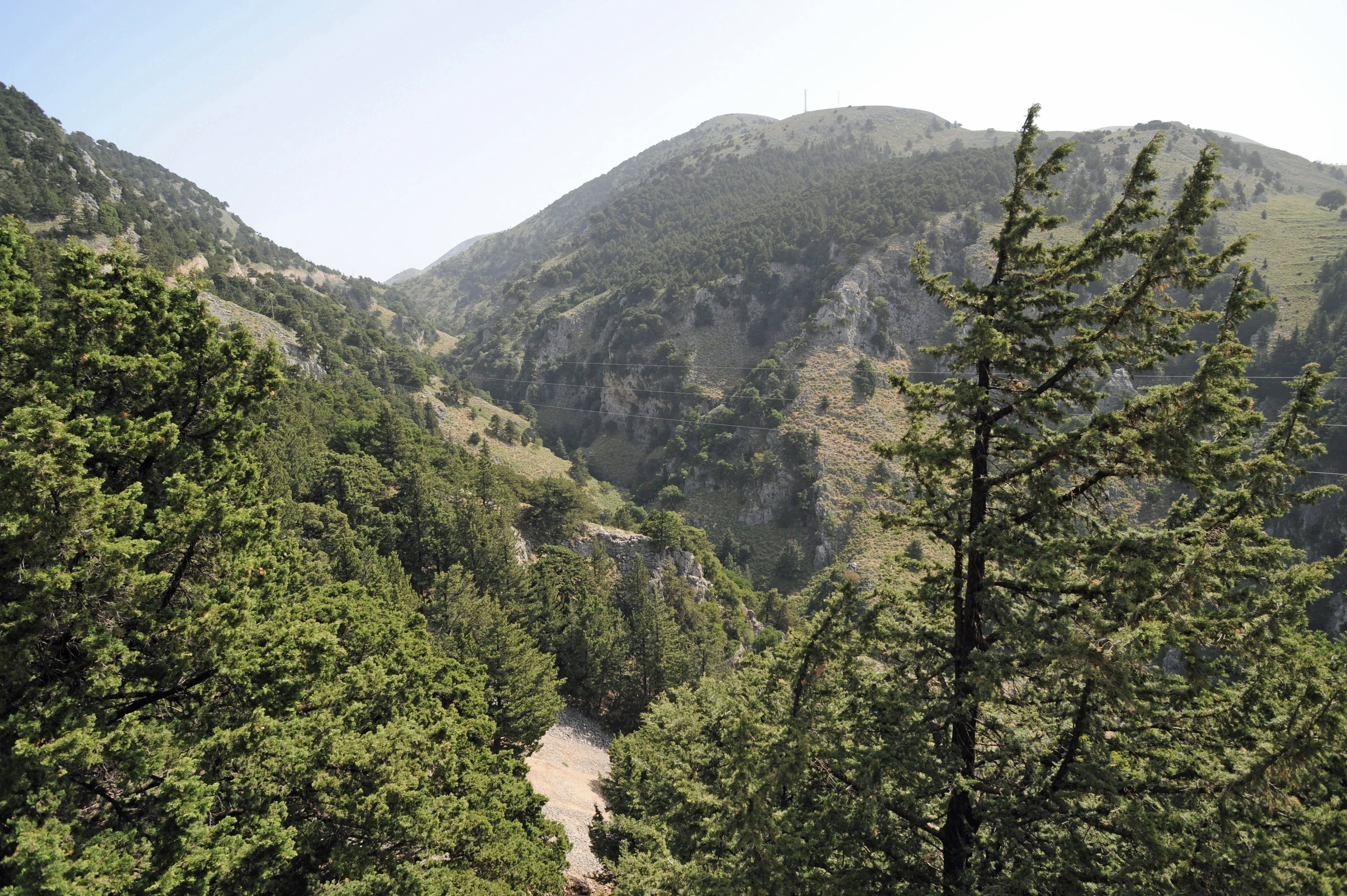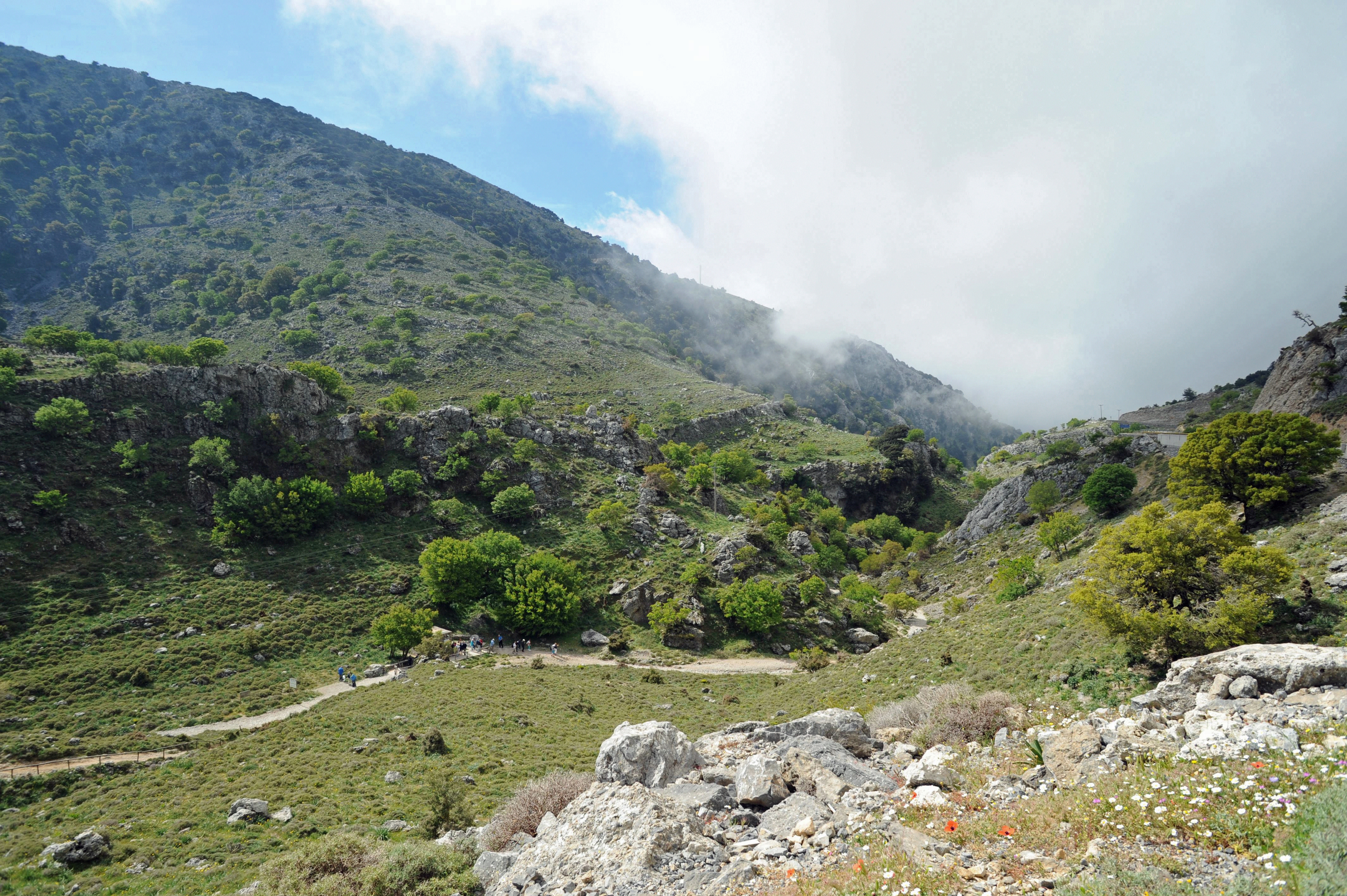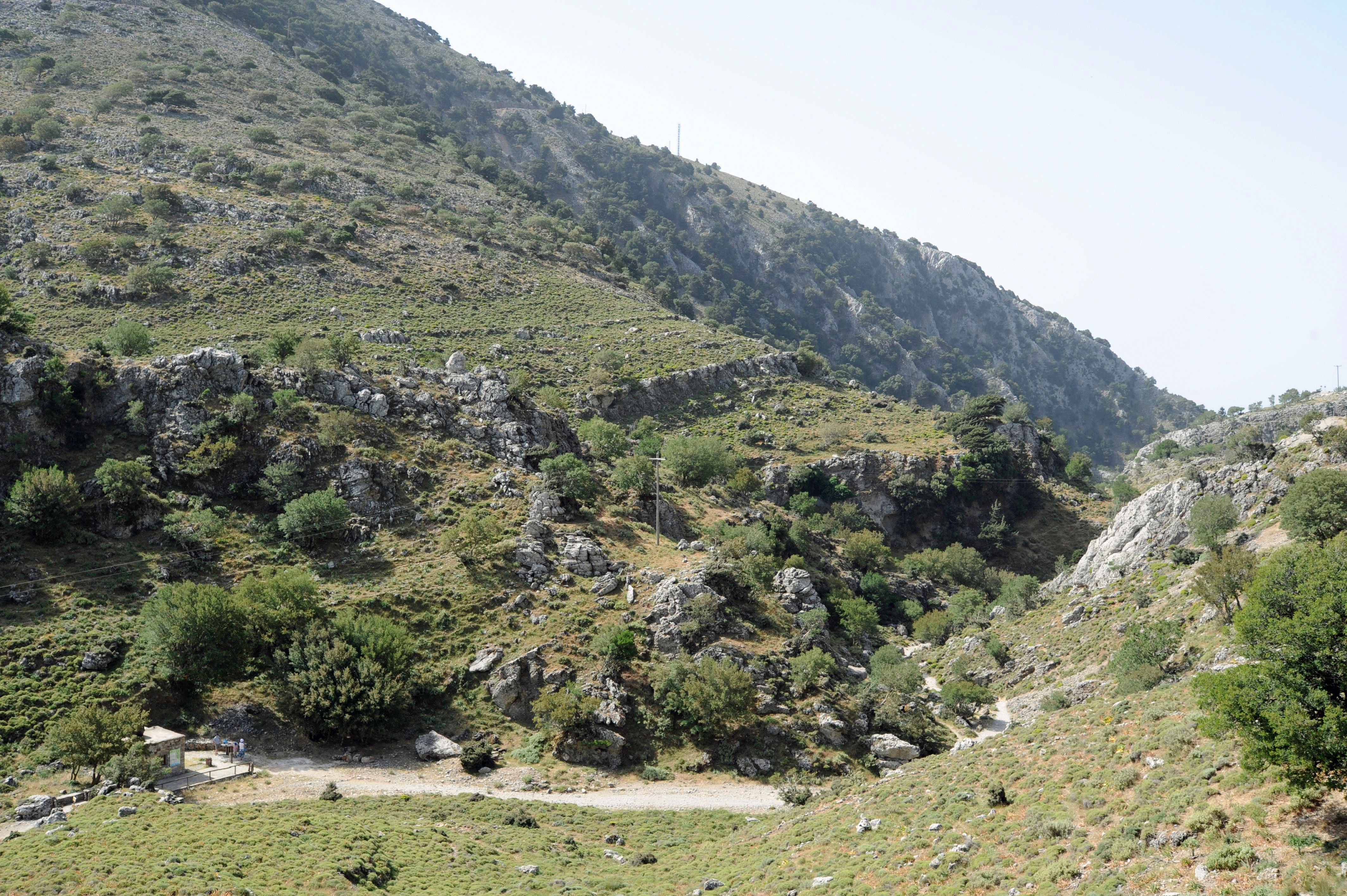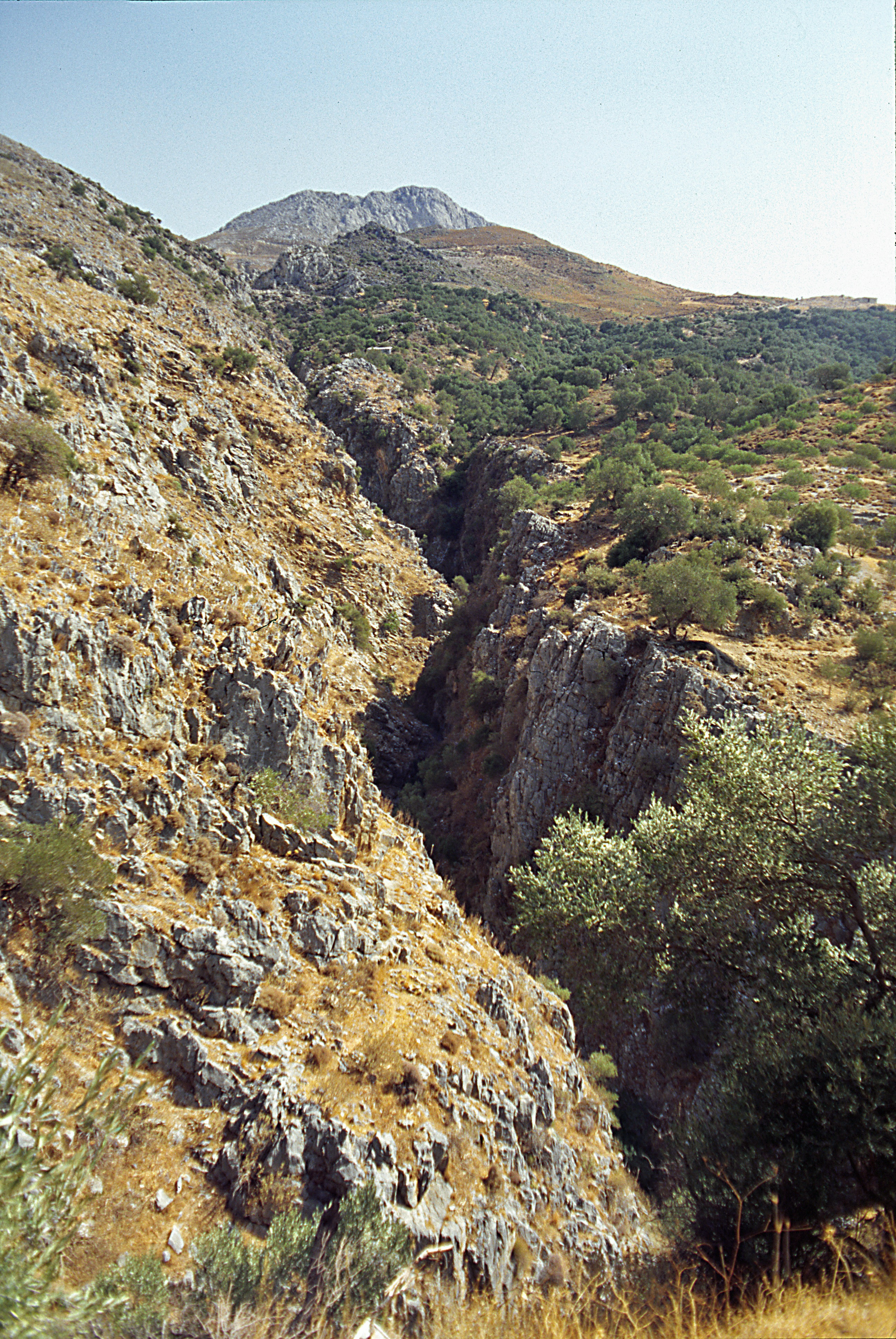 Sur la route de Vryssès à Chora Sfakion | De nos jours on peut facilement accéder aux Sfakia et à Chora Sfakion depuis le côte nord de l’île ; que l’on vienne de La Canée ou de Réthymnon par la route nationale 90, on peut bifurquer vers la route provinciale 54 reliant Vryssès à Chora Sfakion (Επαρχιακη Οδός Βρυσών – Χώρα Σφακίων) ; à environ 2 km au sud-est de Vryssès se trouve un échangeur routier avec une bretelle de sortie vers la route provinciale 54 ; si l’on voyage par l’ancienne route nationale 90, une bifurcation se trouve dans le même secteur. La route provinciale 54 est une bonne route qui se dirige presque plein sud, mais avec de nombreux virages, vers Chora Sfakion qui est, à peu près, à la même longitude que Vryssès, mais de l’autre côté des Montagnes Blanches ; le trajet depuis Vryssès est long de 37 km, soit environ 50 min de conduite, et environ 73 km depuis La Canée, soit 1 h 30 min de conduite. La route provinciale traverse d’abord la plaine de l’Apokoronas, à une cinquantaine de mètres d’altitude, puis elle escalade le versant nord du massif des Montagnes Blanches, jusqu’au plateau de Krapi (οροπέδιο της Κράπης). Après le plateau de Krapi, la route contourne, par l’est, un long promontoire qui marque la bordure entre le dème de l’Apokoronas et le dème des Sfakia, à 580 m d’altitude. La route provinciale continue de monter jusqu’à un col, situé au lieu-dit Xylodema (Ξυλόδεμα), un des deux points culminants de la route, à environ 800 m d’altitude, qui offre une magnifique vue sur le plateau d’Askyfou, qui se trouve en contrebas, à environ 730 m d’altitude.