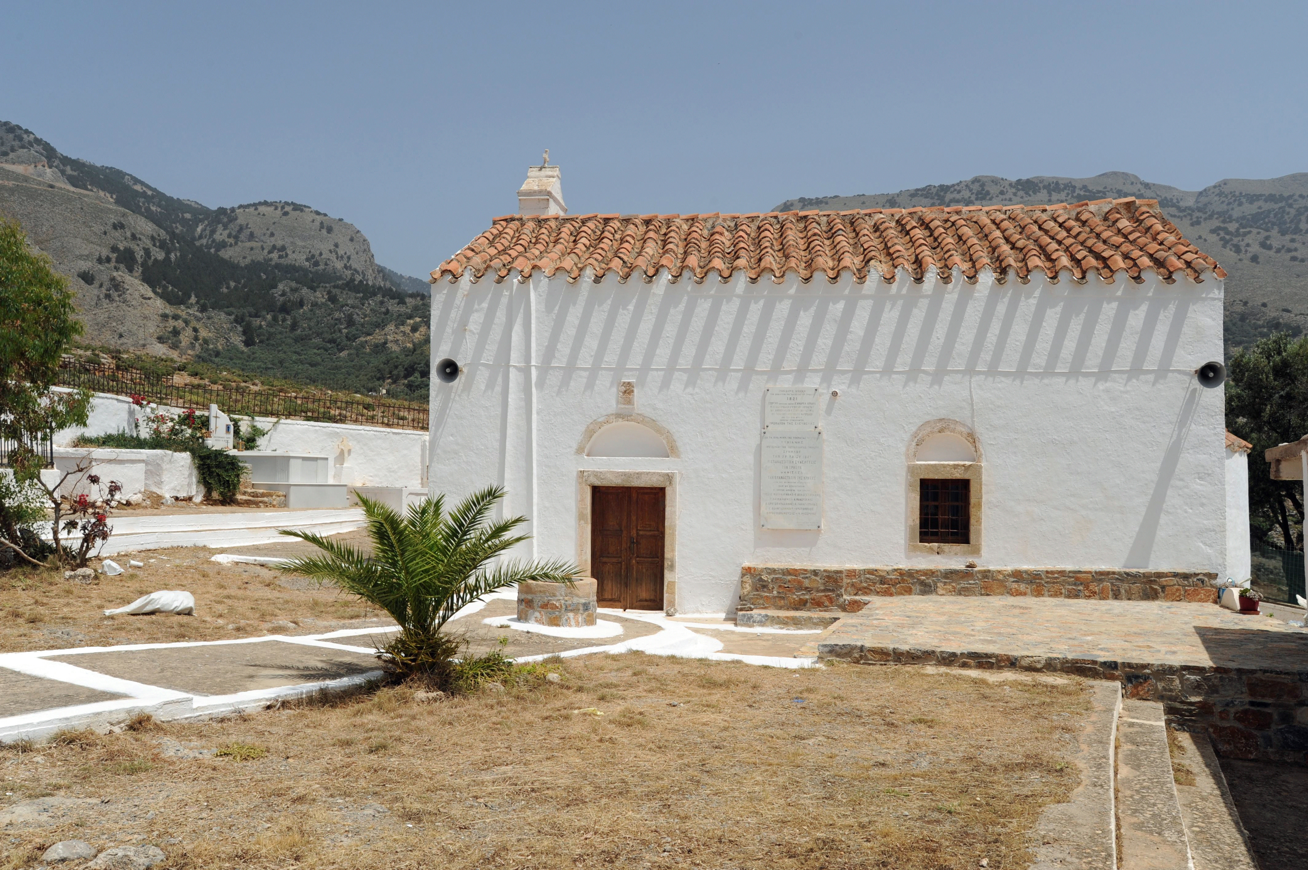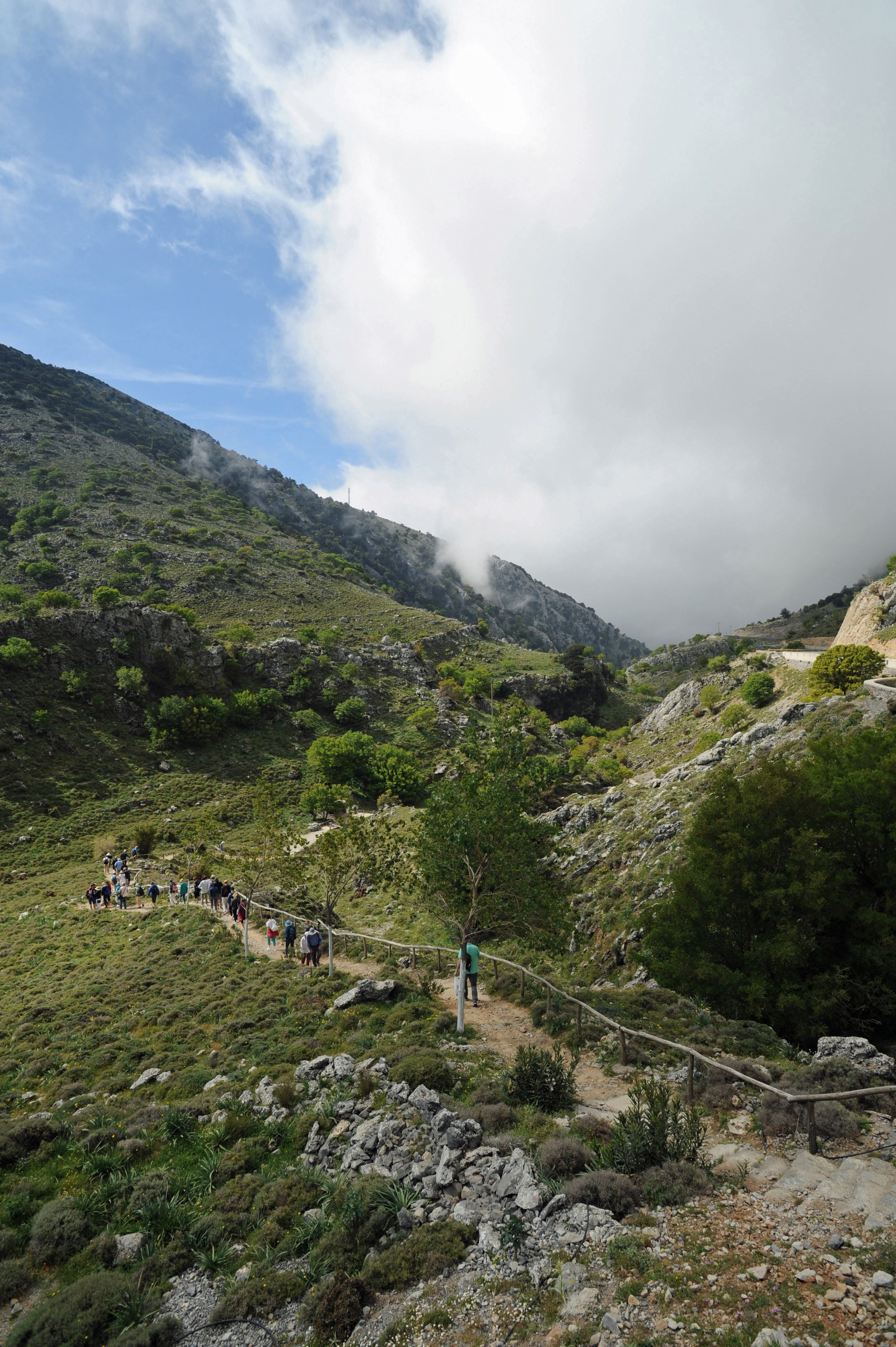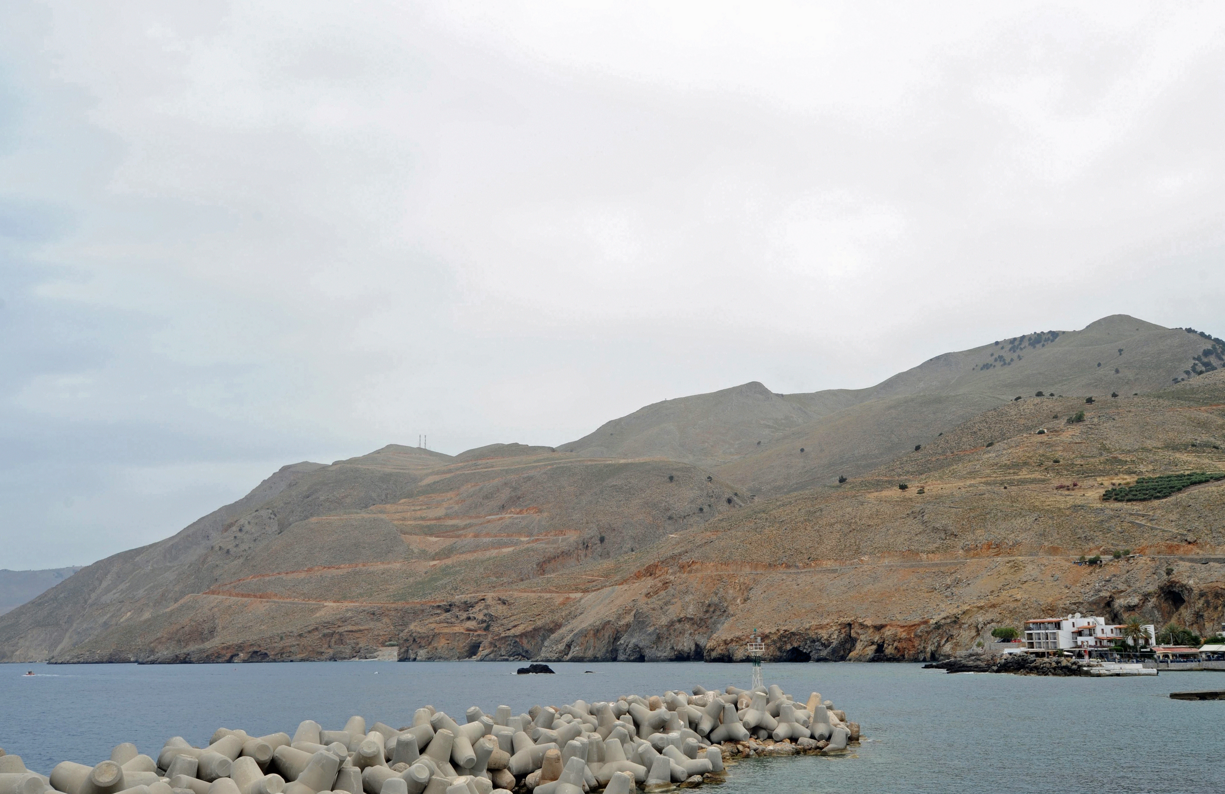 Sur la route de Vryssès à Chora Sfakion | De nos jours on peut facilement accéder aux Sfakia et à Chora Sfakion depuis le côte nord de l’île ; que l’on vienne de La Canée ou de Réthymnon par la route nationale 90, on peut bifurquer vers la route provinciale 54 reliant Vryssès à Chora Sfakion (Επαρχιακη Οδός Βρυσών – Χώρα Σφακίων) ; à environ 2 km au sud-est de Vryssès se trouve un échangeur routier avec une bretelle de sortie vers la route provinciale 54 ; si l’on voyage par l’ancienne route nationale 90, une bifurcation se trouve dans le même secteur. La route provinciale 54 est une bonne route qui se dirige presque plein sud, mais avec de nombreux virages, vers Chora Sfakion qui est, à peu près, à la même longitude que Vryssès, mais de l’autre côté des Montagnes Blanches ; le trajet depuis Vryssès est long de 37 km, soit environ 50 min de conduite, et environ 73 km depuis La Canée, soit 1 h 30 min de conduite. La route provinciale traverse d’abord la plaine de l’Apokoronas, à une cinquantaine de mètres d’altitude, puis elle escalade le versant nord du massif des Montagnes Blanches, jusqu’au plateau de Krapi (οροπέδιο της Κράπης). Après le plateau de Krapi, la route contourne, par l’est, un long promontoire qui marque la bordure entre le dème de l’Apokoronas et le dème des Sfakia, à 580 m d’altitude. La route provinciale continue de monter jusqu’à un col, situé au lieu-dit Xylodema (Ξυλόδεμα), un des deux points culminants de la route, à environ 800 m d’altitude, qui offre une magnifique vue sur le plateau d’Askyfou, qui se trouve en contrebas, à environ 730 m d’altitude.