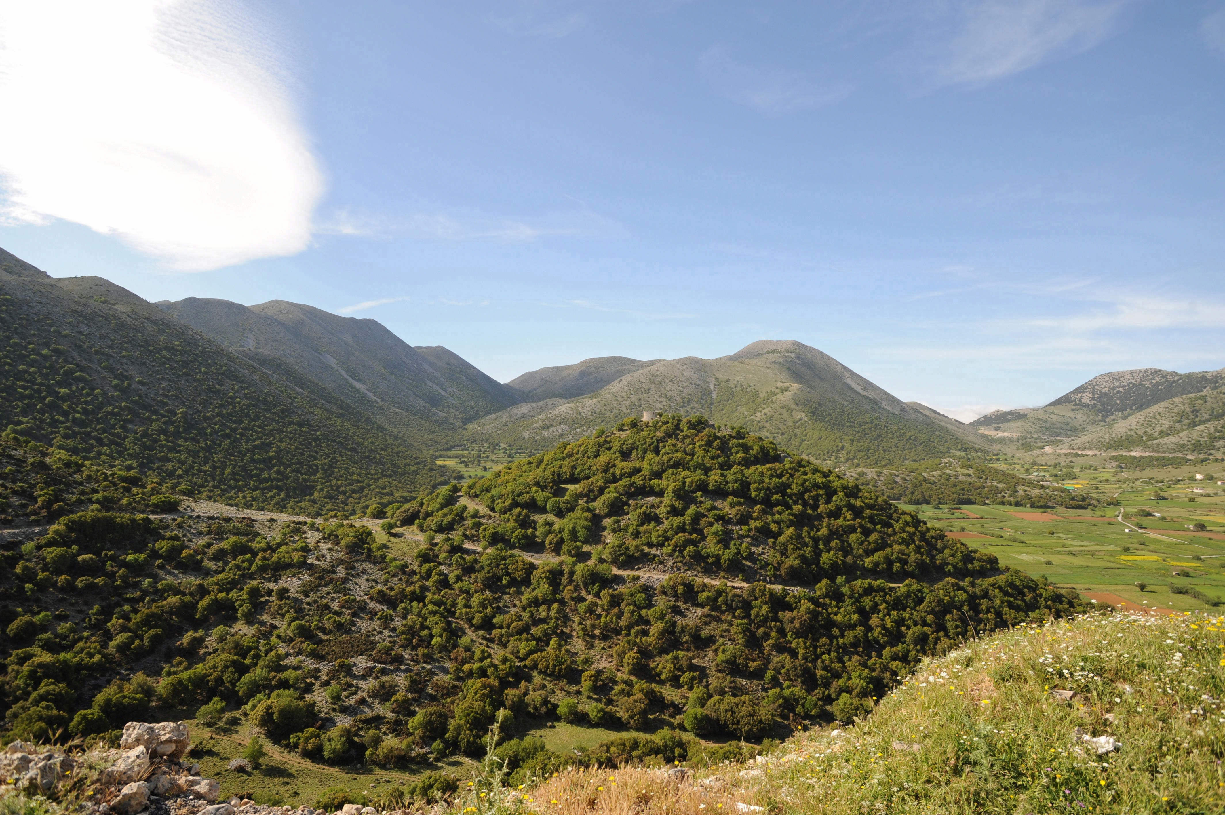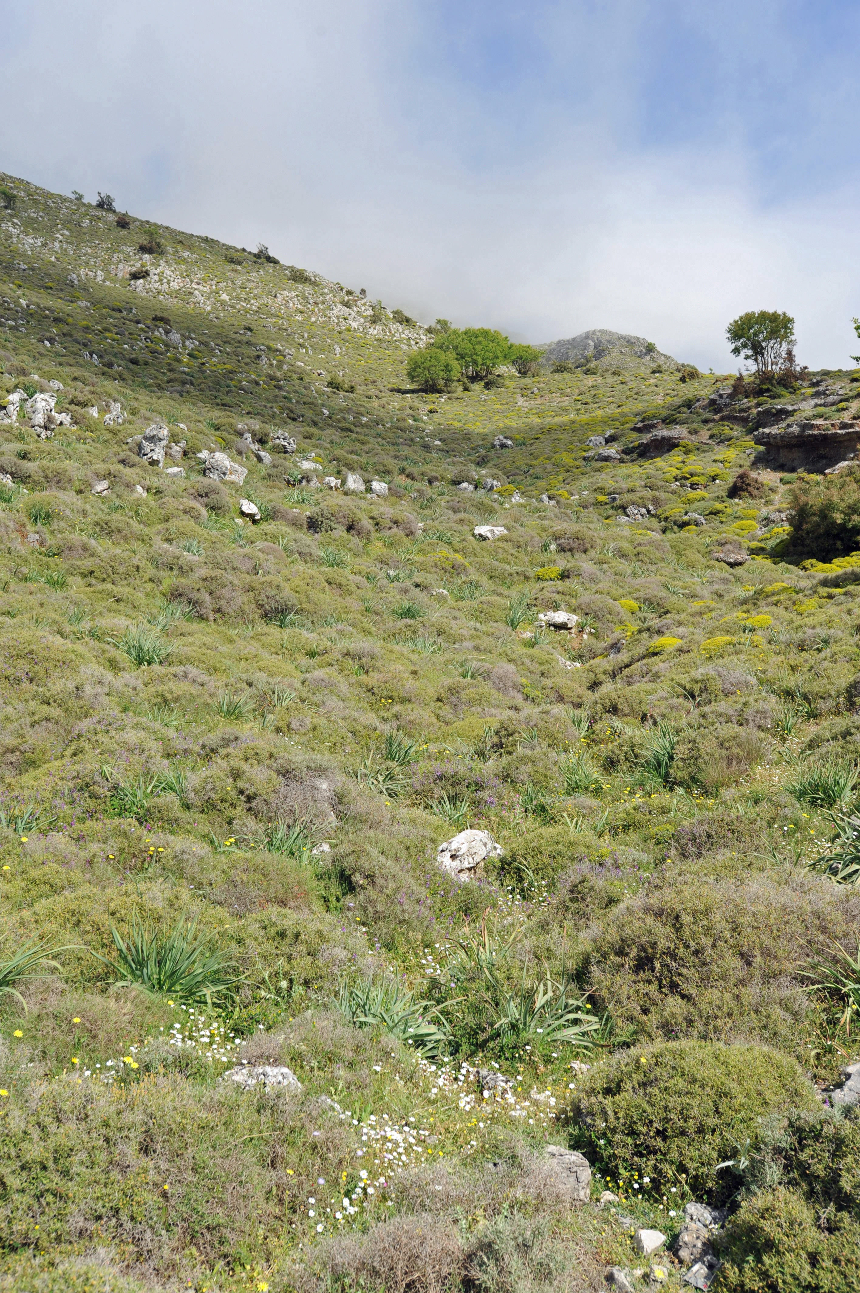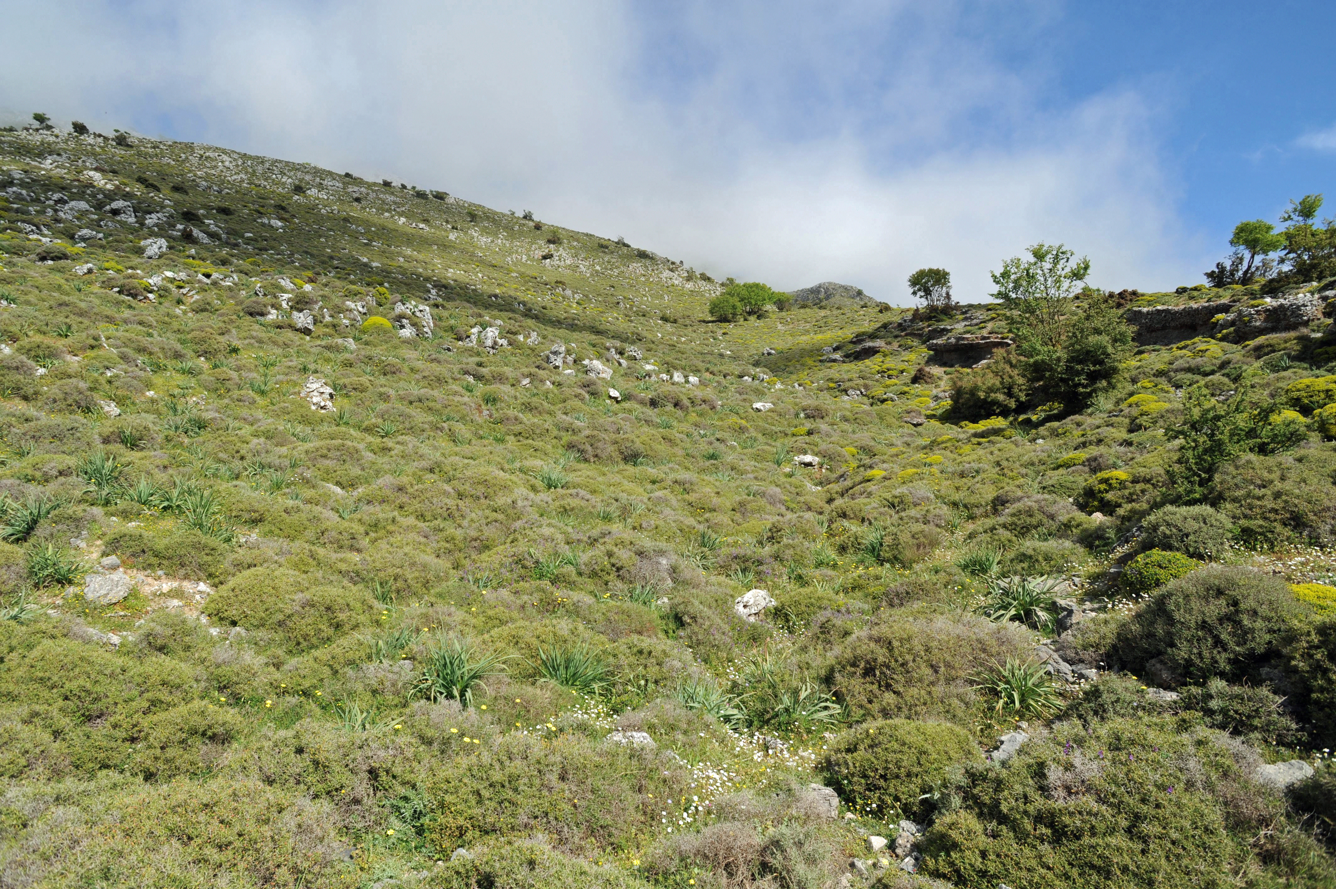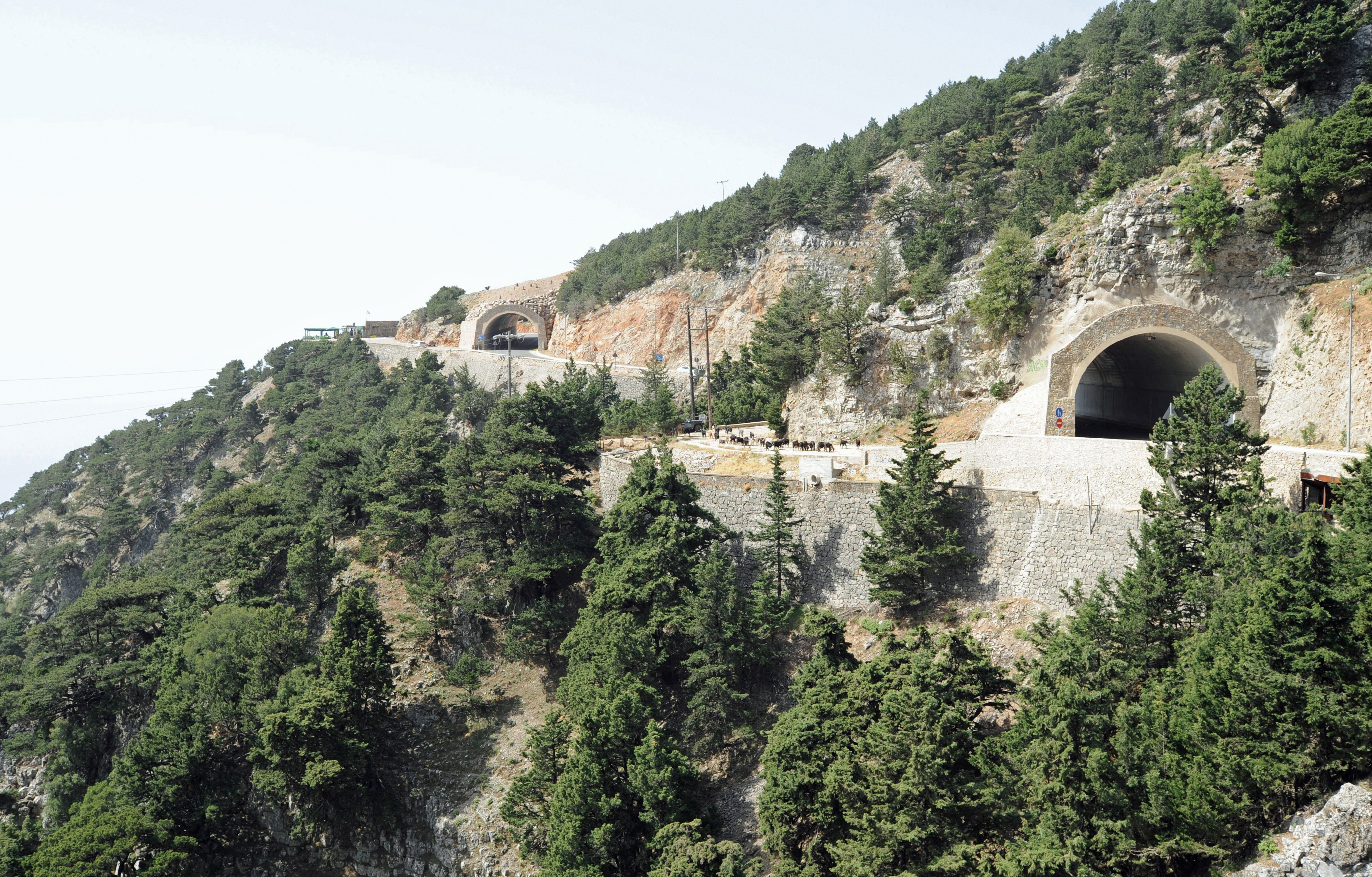 Sur la route de Vryssès à Chora Sfakion | De nos jours on peut facilement accéder aux Sfakia et à Chora Sfakion depuis le côte nord de l’île ; que l’on vienne de La Canée ou de Réthymnon par la route nationale 90, on peut bifurquer vers la route provinciale 54 reliant Vryssès à Chora Sfakion (Επαρχιακη Οδός Βρυσών – Χώρα Σφακίων) ; à environ 2 km au sud-est de Vryssès se trouve un échangeur routier avec une bretelle de sortie vers la route provinciale 54 ; si l’on voyage par l’ancienne route nationale 90, une bifurcation se trouve dans le même secteur. La route provinciale 54 est une bonne route qui se dirige presque plein sud, mais avec de nombreux virages, vers Chora Sfakion qui est, à peu près, à la même longitude que Vryssès, mais de l’autre côté des Montagnes Blanches ; le trajet depuis Vryssès est long de 37 km, soit environ 50 min de conduite, et environ 73 km depuis La Canée, soit 1 h 30 min de conduite. La route provinciale traverse d’abord la plaine de l’Apokoronas, à une cinquantaine de mètres d’altitude, puis elle escalade le versant nord du massif des Montagnes Blanches, jusqu’au plateau de Krapi (οροπέδιο της Κράπης). Après le plateau de Krapi, la route contourne, par l’est, un long promontoire qui marque la bordure entre le dème de l’Apokoronas et le dème des Sfakia, à 580 m d’altitude. La route provinciale continue de monter jusqu’à un col, situé au lieu-dit Xylodema (Ξυλόδεμα), un des deux points culminants de la route, à environ 800 m d’altitude, qui offre une magnifique vue sur le plateau d’Askyfou, qui se trouve en contrebas, à environ 730 m d’altitude.