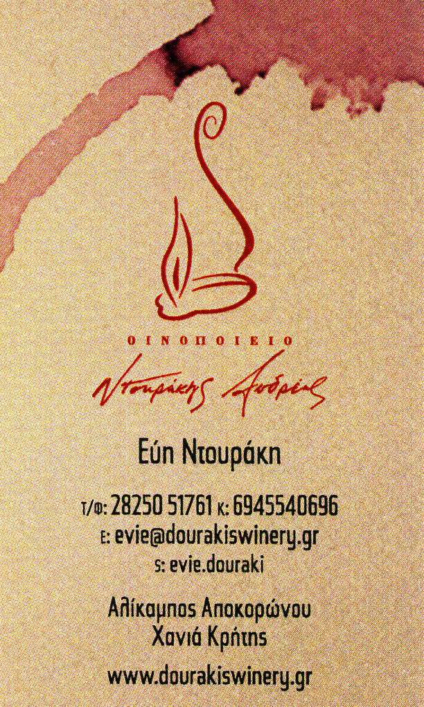 | Le chai Dourakis (Οινοποιείο Ντουράκη / Oinopoieío Ntouráki) | Sur la route de Vryssès à Chora Sfakion, les amateurs de vins pourront faire une halte, voire une halte-dégustation, au chai Dourakis situé juste à gauche de la route, à environ 4,5 km au sud de Vryssès ; le village d’Alikampos se trouve à environ 2 km à l’est par la route.Aller au chais Dourakis avec Google Maps (35.349566, 24.203053). Le chai Dourakis est un domaine viticole familial fondé vers 1988 par Andréas Dourakis (Ανδρέας Ντουράκης) ; la famille Dourakis pratique une viticulture organique de divers cépages crétois en plus des cépages classiques : le vidiano (Βιδιανό), le vilana (Βηλάνα), le muscat de Spinas (Μοσχάτο Σπίνας), originaire de la région de Sélino, le romeiko (Ρωμέικο), le malvoisie (Μαλβαζία) et le kotsifali (Κοτσιφάλι). Dans la salle de dégustation, au 1er étage du chai, on peut découvrir quelques-uns de la vingtaine de vins rouges, rosés ou blancs produits par le domaine. On peut aussi faire une visite guidée des caves et du vignoble, ou prendre un repas accompagné des vins du domaine, sur réservation.