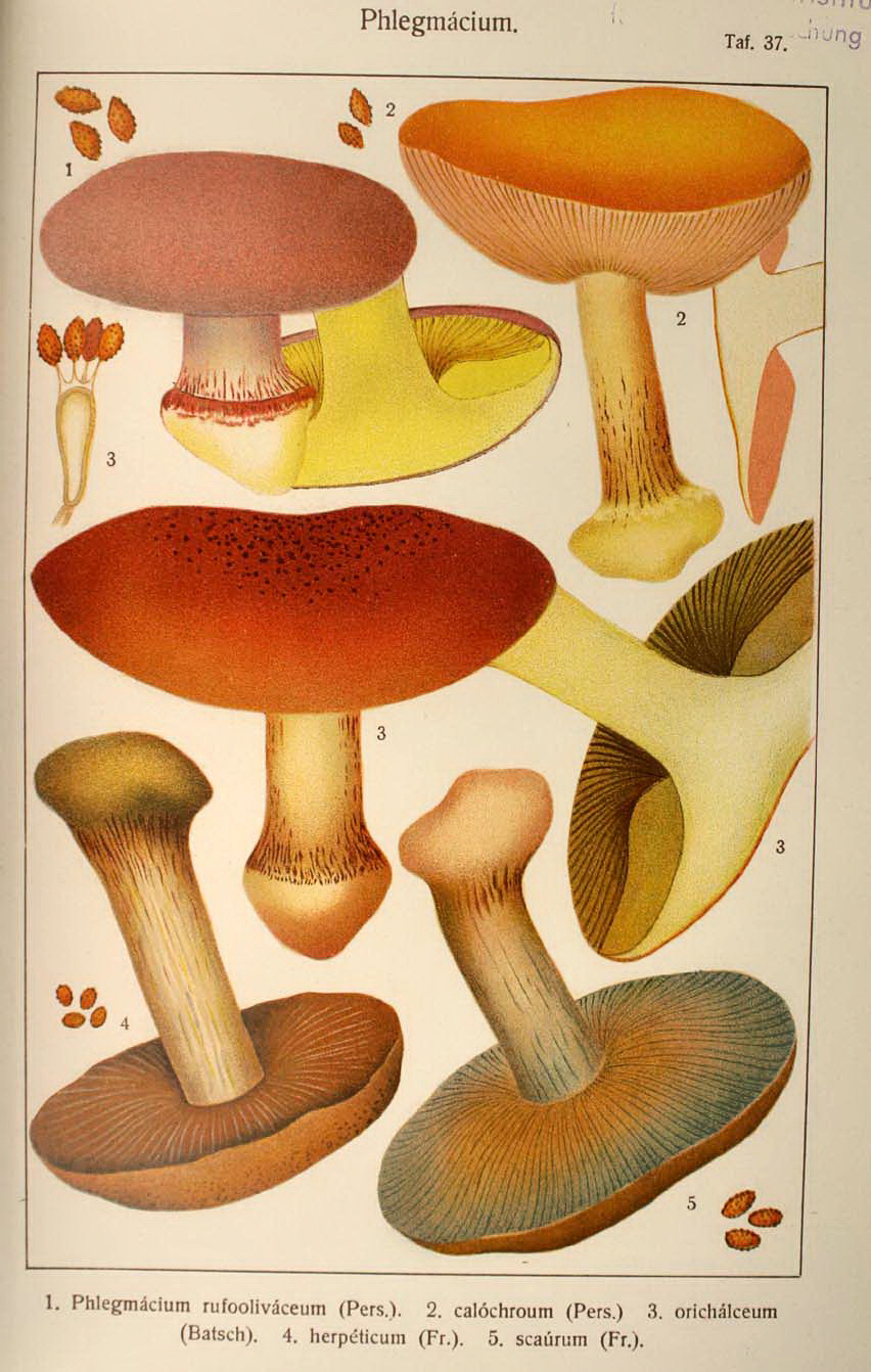 B - Odeurs chimiques.Odeur d’acétylène : Cortinarius traganus ; Cortinarius camphoratus (+ caoutchouc). Odeur de caoutchouc : Cortinarius camphoratus (+ acétylène). Odeur de Celluloïd : Cortinarius azureovelatus. Odeur de gaz d’éclairage : Cortinarius splendens varietas meinhardii ; Cortinarius russeus (+ terre). Odeur de camphre : Cortinarius subtortus ; Cortinarius caninus ; Cortinarius glaucopus (-) ; Cortinaire à deux voiles (Cortinarius bivelus) (-) ; Cortinarius torvus (-) ; Cortinarius anomalus (- ; + herbe). Odeur d’iode, d’iodoforme : Cortinarius sphagneti ; Cortinarius rigens ; Cortinarius cinnamomeus ; Cortinarius duracinus ; Cortinarius eustriatulus ; Cortinarius fervidus ; Cortinarius obtusus ; Cortinarius acutovelatus ; Cortinarius acutus ; Cortinarius acutorum (-) ; Cortinarius croceus (-) ; Cortinarius cinnamomeoluteus (- ; + terre + raphanoïde) ; Cortinarius pratensis (sous la cuticule) ; Cortinarius semisanguineus. Odeur de lessive : Cortinarius prasinus ; Cortinarius subtortus. Odeur de fumée de pressing, de locomotive : Cortinarius callisteus (++). Odeur spiritueuse : Cortinarius rufoolivaceus. Odeur de savon : Cortinarius brunneus. C - Odeurs de produits alimentaires. Odeur de beurre (butyrique) : Cortinarius olivellus (+) ; Cortinarius argyrophilus (puis aromatique). Odeur de charcuterie sèche : Cortinarius fluryi (+ aromatique). Odeur de chocolat : Cortinarius avellaneocaeruleus. Odeur de farine : Cortinarius dionysae (++) ; Cortinarius aleuriosmus ; Cortinarius flavovirens ; Cortinarius speciosissimus (- ; + spermatique). Odeur de fromage : Cortinarius Bulliardii ; Cortinarius splendens varietas meinhardii ; Cortinarius camphoratus (++ ; + purée refroidie ; puis sueur de pieds, corne brûlée). Odeur de lait : Cortinarius caesiocanescens (-). Odeur de miel, de Mahonia : Cortinarius arcuatorum ; Cortinarius talus ; Cortinarius elatior ; Cortinarius herbarum ; Cortinarius pseudosalor ; Cortinarius purpurascens varietas largusoides ; Cortinarius polymorphus (-) ; Cortinarius multiformis (-) ; Cortinarius trivialis (-) ; Cortinarius mucifluoides (+ vireuse) ; Cortinarius mucifluus ; Cortinarius ochroleucus (- ; + terre) ; Cortinarius stillatitius (en bas du stipe). Odeur de pâtisserie : Cortinarius lividoviolaceus ; Cortinarius claricolor (-). Odeur de poisson : Cortinarius depressus (-). Odeur de purée de pomme de terre refroidie : Cortinarius callisteus ; Cortinarius camphoratus (++ ; + fromage fort). D - Odeur d’huile de cèdre, de bois de cèdre, de cuir de Russie, de bois de crayon : Cortinarius fragrantior ; Cortinarius humicola ; Cortinarius subtortus ; Cortinarius violaceus (-) ; Cortinarius violaceus ssp. hercynicus (-). E - Odeurs de parfumerie. Odeur d’eau de Cologne : Cortinarius percomis. Odeur d’encens : Cortinarius subtortus. F - Odeurs d’origine animale. Odeur de corne brûlée, de bouc : Cortinarius camphoratus ; Cortinarius traganus. Odeur spermatique : Cortinarius Bulliardii (-) ; Cortinarius juranus (+/- fruitée) ; Cortinarius speciosissimus (- ; + farine). Odeur de sueur de pieds : Cortinarius caligatus (-). G - Odeurs différentes. Odeur de Lepista, c’est-à-dire aromatique, fruitée ou farineuse à spermatique, de vitamine B, de bouillie lactée : Cortinarius bivelus. Odeur de moisi : Cortinarius caerulescens ; Cortinarius vulpinus ; Cortinarius hinnuleus (++ ; + terre) ; Cortinarius russeus (+ gaz). Odeur de scléroderme, c’est-à-dire caoutchoutée acidulée, vers Lepiota cristata : Cortinarius subtortus. Odeur de terre. - Odeur pure : Cortinarius herculeus (++) ; Cortinarius variecolor (++) ; Cortinarius caesiocyaneus ; Cortinarius caerulescens ; Cortinarius balaustinus ; Cortinarius balteatocumatilis ; Cortinarius balteatocumatilis varietas laetus ; Cortinarius daulnoyae ; Cortinarius glaucopus varietas submagicus ; Cortinarius olidus ; Cortinarius pratensis ; Cortinarius subtortus ; Cortinarius veraprilis ; Cortinarius balteatus (-) ; Cortinarius crassus (-) ; Cortinarius crocolitus (-) ; Cortinarius nemorensis (-) ; Cortinarius torvus (-) ; Cortinarius triumphans (-) ; Cortinarius melanotus (+/-) ; Cortinarius veregregius (+/-).
